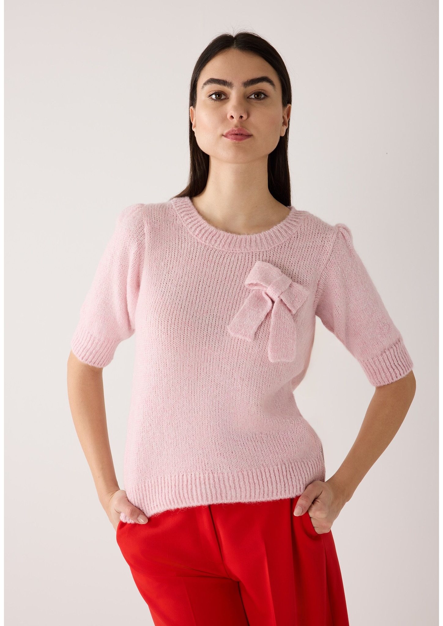 Dieser hübsche Kurzarm-Pullover von MORE & MORE überzeugt durch die leichte Strickart, die figurnahe Form und die süße Schleife auf der Front. Er lässt sich lässig zur Jeans kombinieren oder auch chicer zum maxilangen Chiffonrock und gibt jedem Look einen femininen Twist.