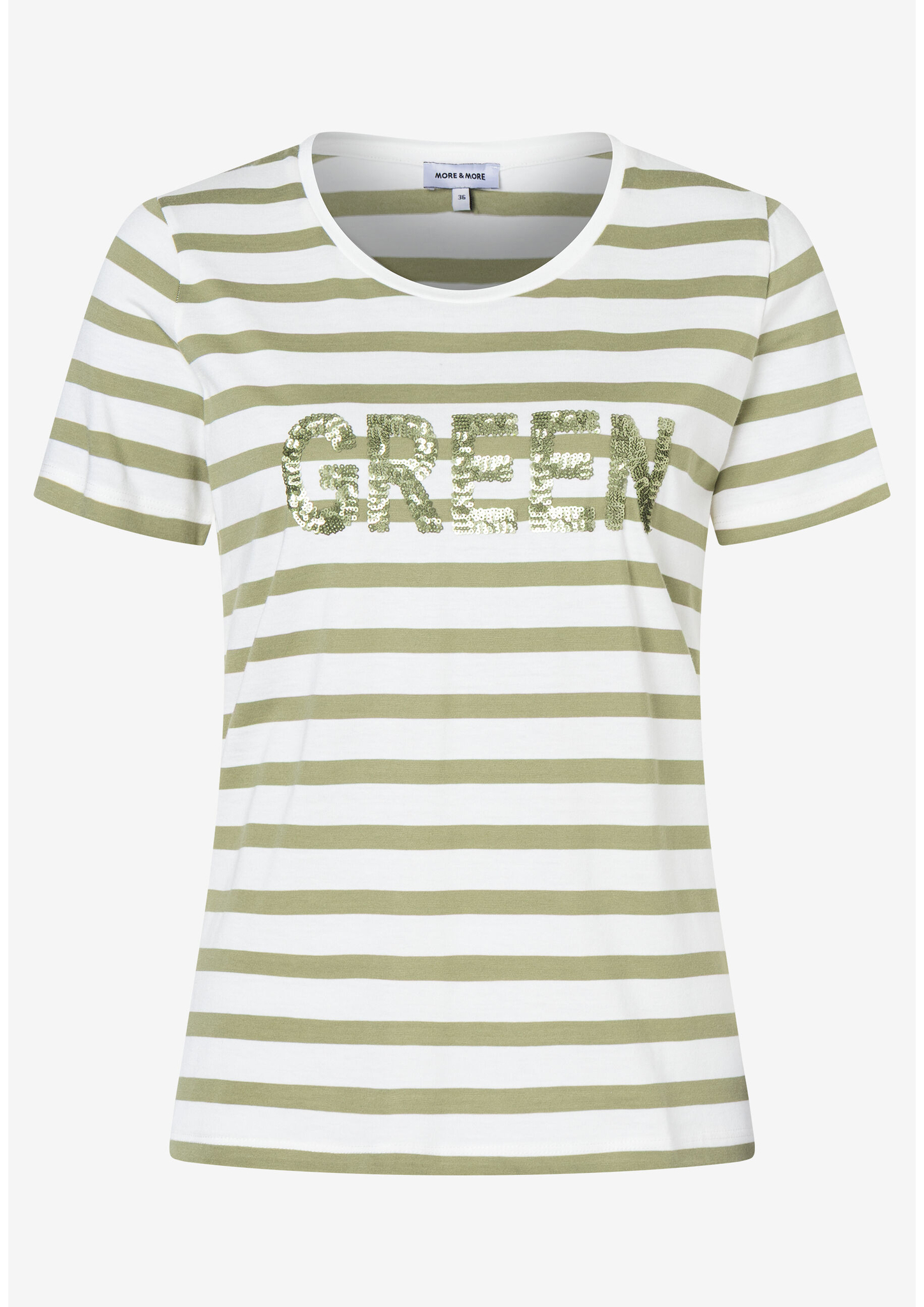 Gestreifte T-Shirts sind in diesem Frühling wieder total im Trend. Besonders süß ist das Ringel-Shirt von MORE & MORE mit Paillettenschrift und kurzen Ärmeln. Einfach mit Jeans, weiter Marlenehose oder fließendem Maxirock stylen - fertig ist ein easy Trend-Look.