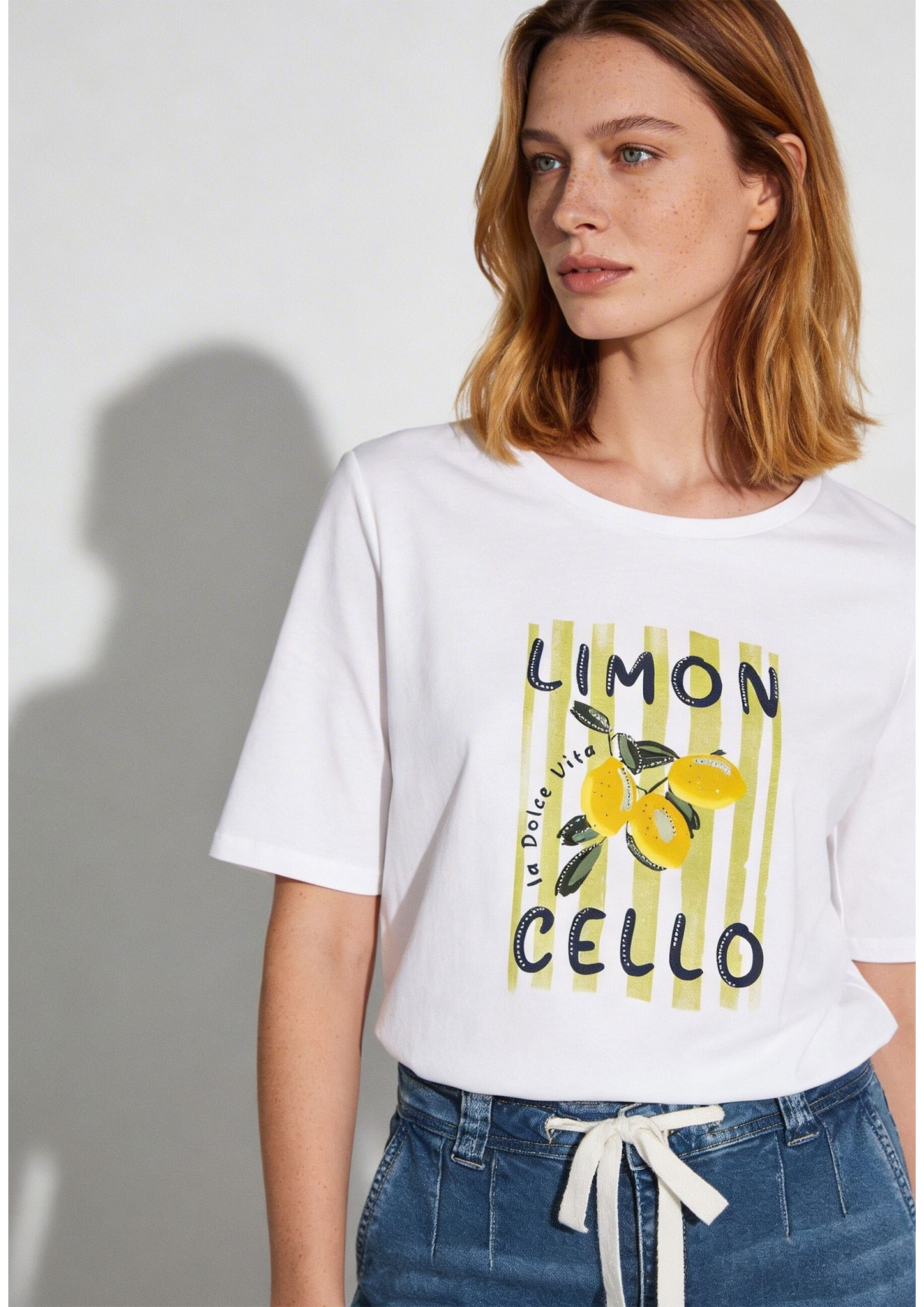 Dieses weiße T-Shirt von MORE & MORE bringt mit seinem "LIMON CELLO"-Print sofort Summer Vibes in Ihren Look. Dank des bequemen Schnitts und des soften Materials ist das Shirt perfekt für entspannte City-Days, Urlaubsmomente oder Ihren Everyday-Style.