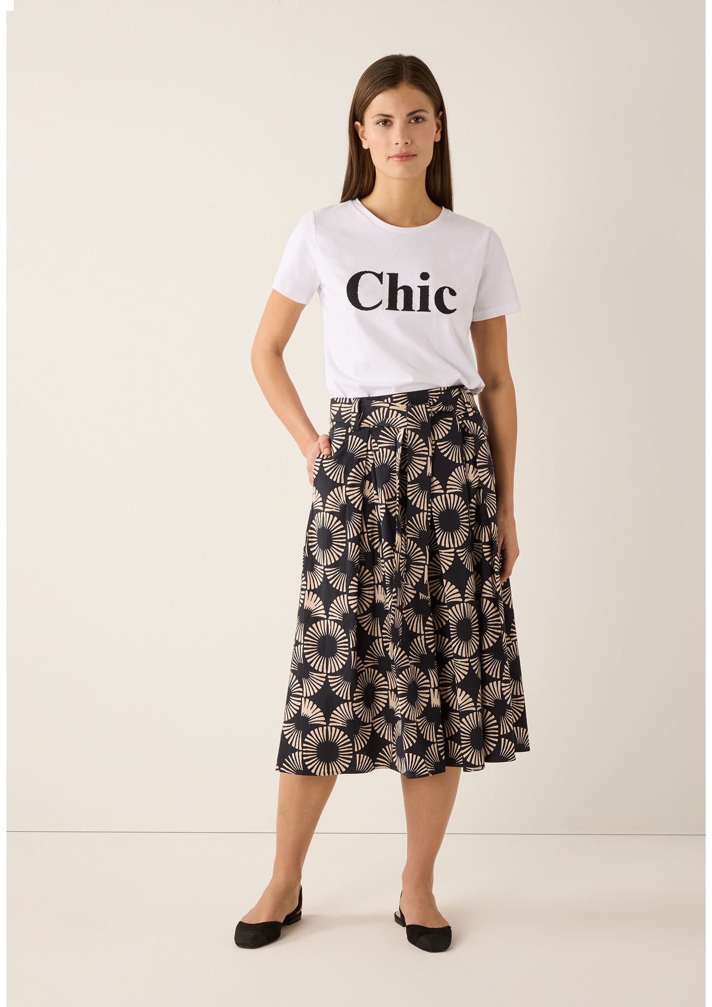 Das weiße Kurzarmshirt von MORE & MORE präsentiert sich mit markanter Perlenaufschrift auf der Front und sorgt für einen minimalistischen Statement-Look. Das zeitlose Design macht es zum vielseitigen Basic für stilvolle Casual-Outfits - perfekt kombinierbar zu Hose und Rock, oder auch zum klassischen Businessanzug.