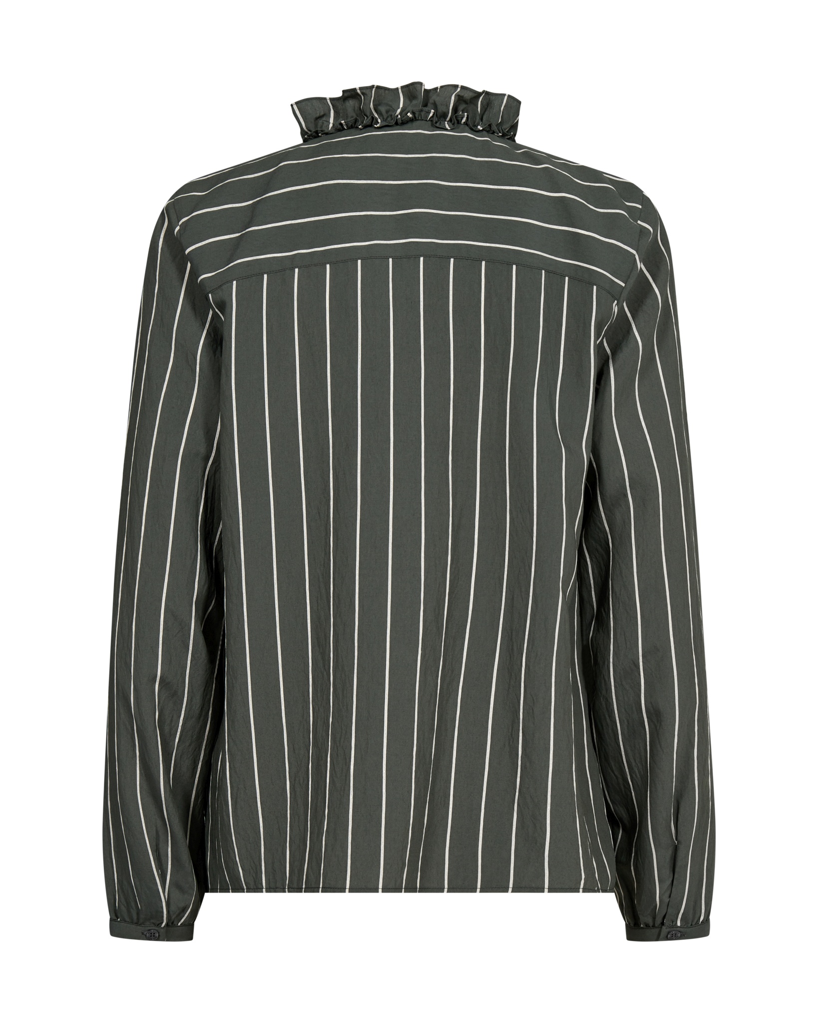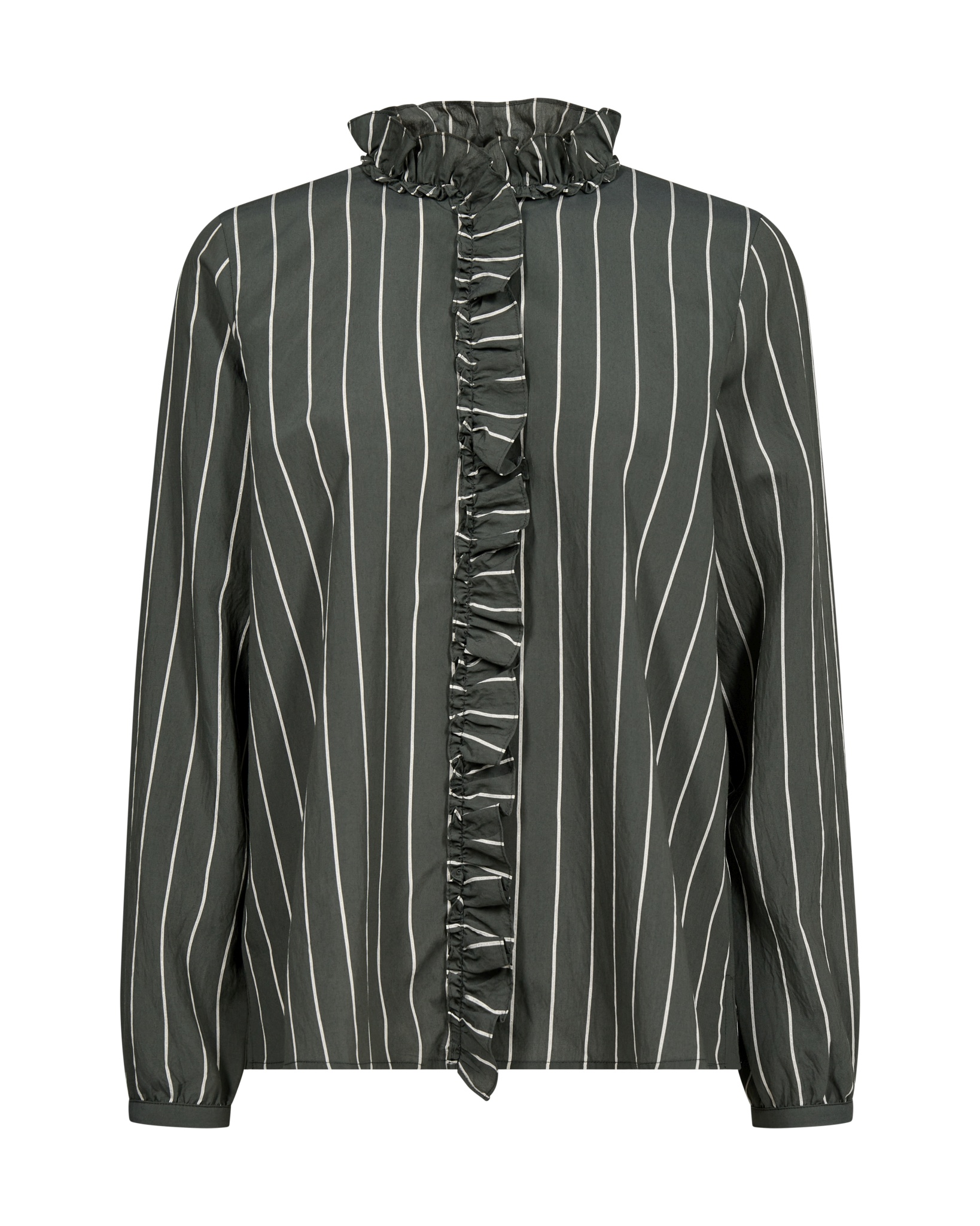 Dieses elegante gestreifte Hemd in normaler Passform verbindet zeitlose Raffinesse mit femininem Charme. Der verdeckte Knopfverschluss wird von zarten Rüschen umrahmt, die sich um den Halsausschnitt herum fortsetzen und ihm einen raffinierten Touch verleihen. Dieses vielseitige Kleidungsstück mit geknöpften Manschetten lässt sich mühelos mit einer maßgeschneiderten Hose für einen eleganten Look oder einer Jeans für ein schickes, legeres Ensemble kombinieren.