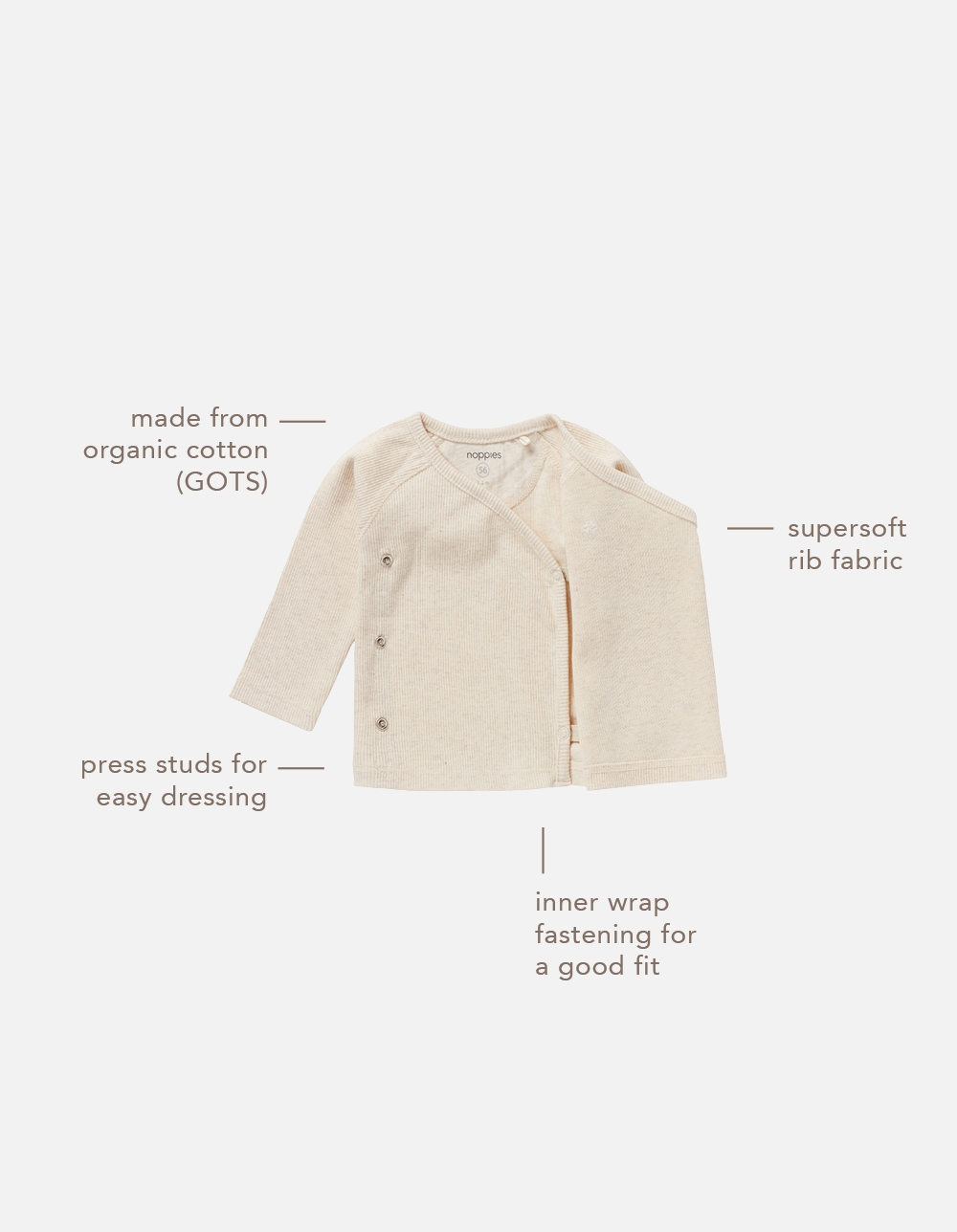 Das An- und Ausziehen kann für ein Baby ziemlich stressig sein, daher ist ein Wickeloberteil ideal. Dank der praktischen Druckknöpfe muss dieses Oberteil aus der Noppies Baby Kollektion nicht über den Kopf des Babys gezogen werden. Es besteht aus einem gerippten Stoff und hat lange Ärmel.Kombinieren Sie es mit der passenden Hose und Mütze. Dieses Wickeloberteil ist aus GOTS-zertifizierter Bio-Baumwolle hergestellt. Das ist nicht nur superweich für Ihr Baby, sondern erfüllt auch hohe internationale Produktions- und Umweltstandards.