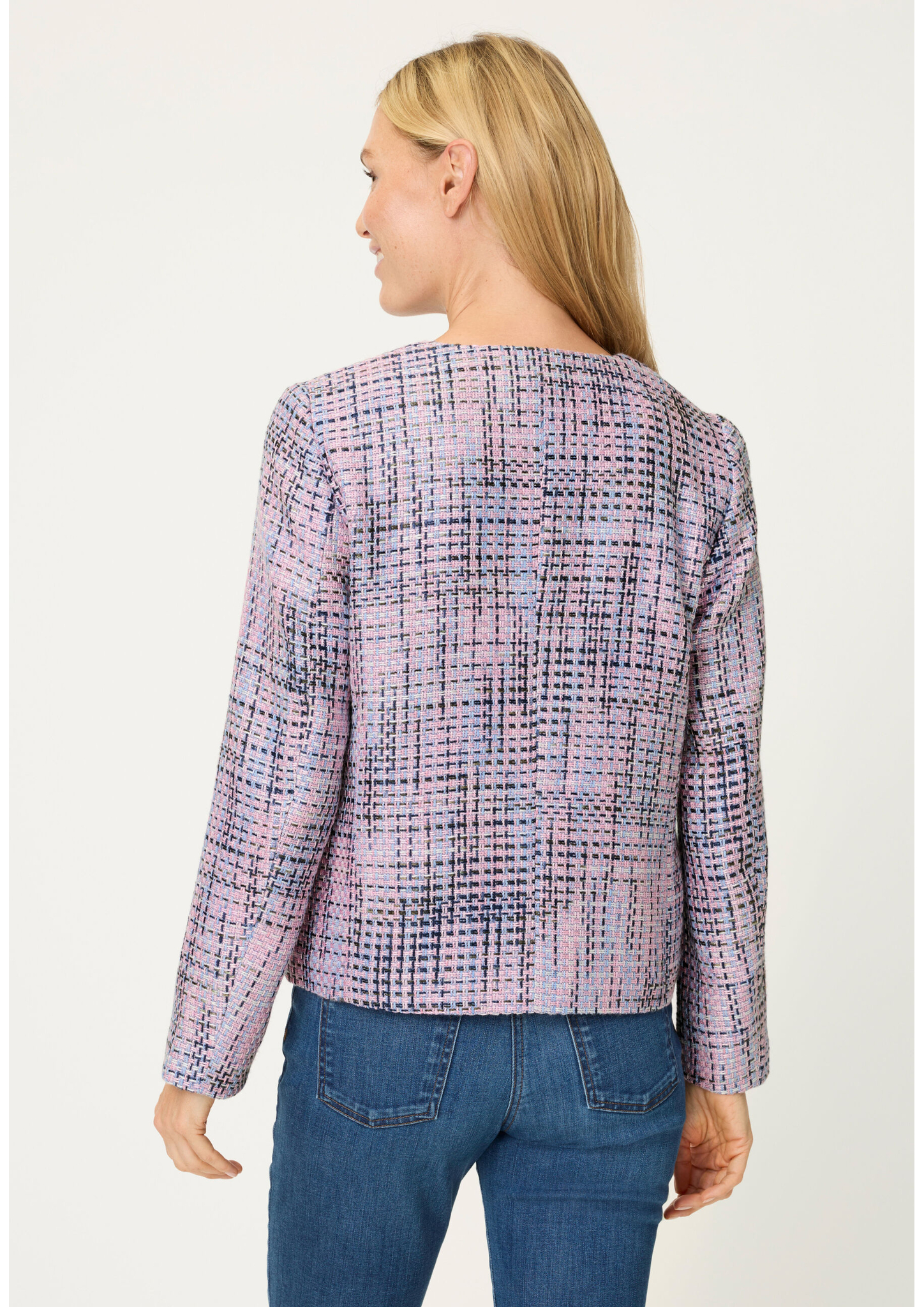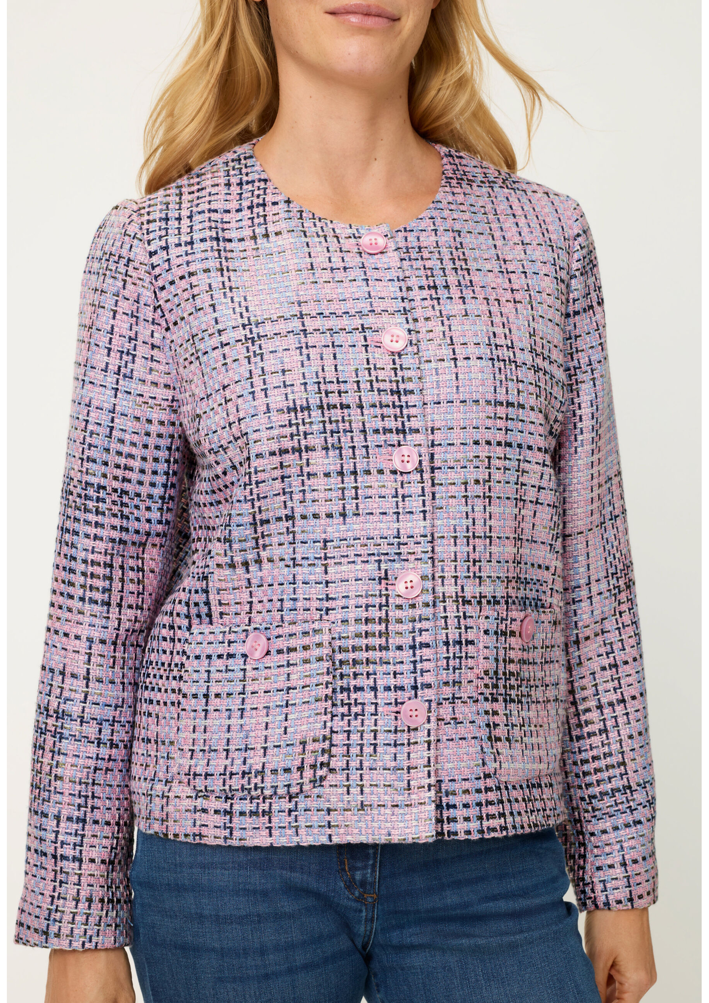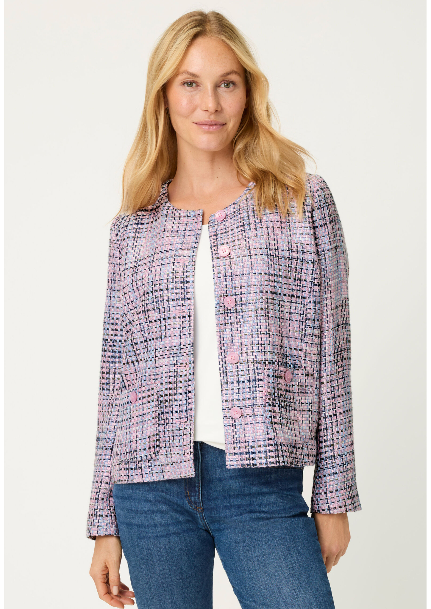 Diese moderne leichte Jacke überzeugt mit einem stilvollen Jaquard-Muster und einem femininen Rundhalsausschnitt. Die durchgehende Knopfleiste und die klaren Linien verleihen ihr eine elegante Note. Dank der hochwertigen Materialmischung trägt sie sich angenehm leicht. Länge ca. 56 cm.