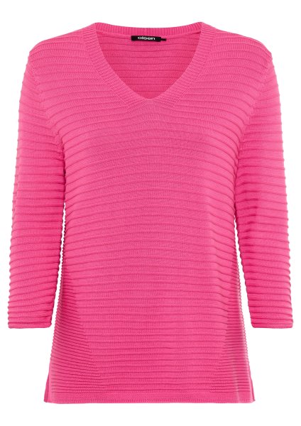 Dieser Pullover vereint Komfort und Stil in harmonischer Balance. Gefertigt aus einem hochwertigen, weich gedrehten Baumwollmix bietet er ein angenehmes Tragegefühl und eine edle Struktur. Der klassische V-Ausschnitt und die 3/4-Ärmel verleihen dem Design eine feminine Note, während seitliche Schlitze am geraden Saum für moderne Leichtigkeit sorgen. Länge ca. 60 cm.