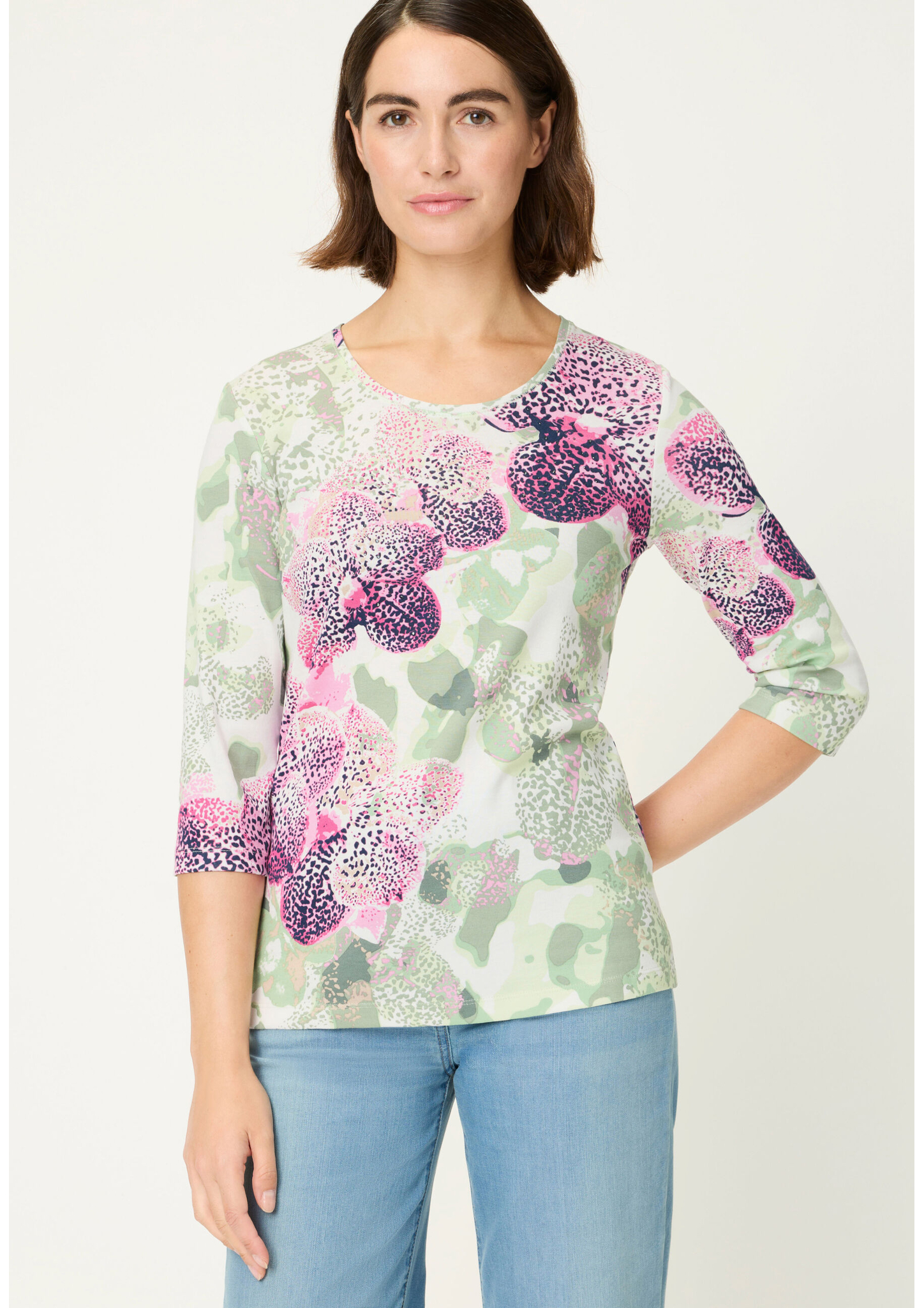 Dieses Shirt vereint Komfort und Glamour: Der kunstvolle Panneaux-Print wird durch funkelnde Rhinestones veredelt und sorgt so für eine stilvolle, feminine Note. Der Rundhalsausschnitt und die 3/4-Ärmel machen das Design zu einem vielseitigen Allrounder für Alltag und Freizeit. Dank des elastischen Saums sitzt das Shirt stets perfekt, während die weiche Baumwolle ein angenehmes Tragegefühl bietet. Länge ca. 62 cm.