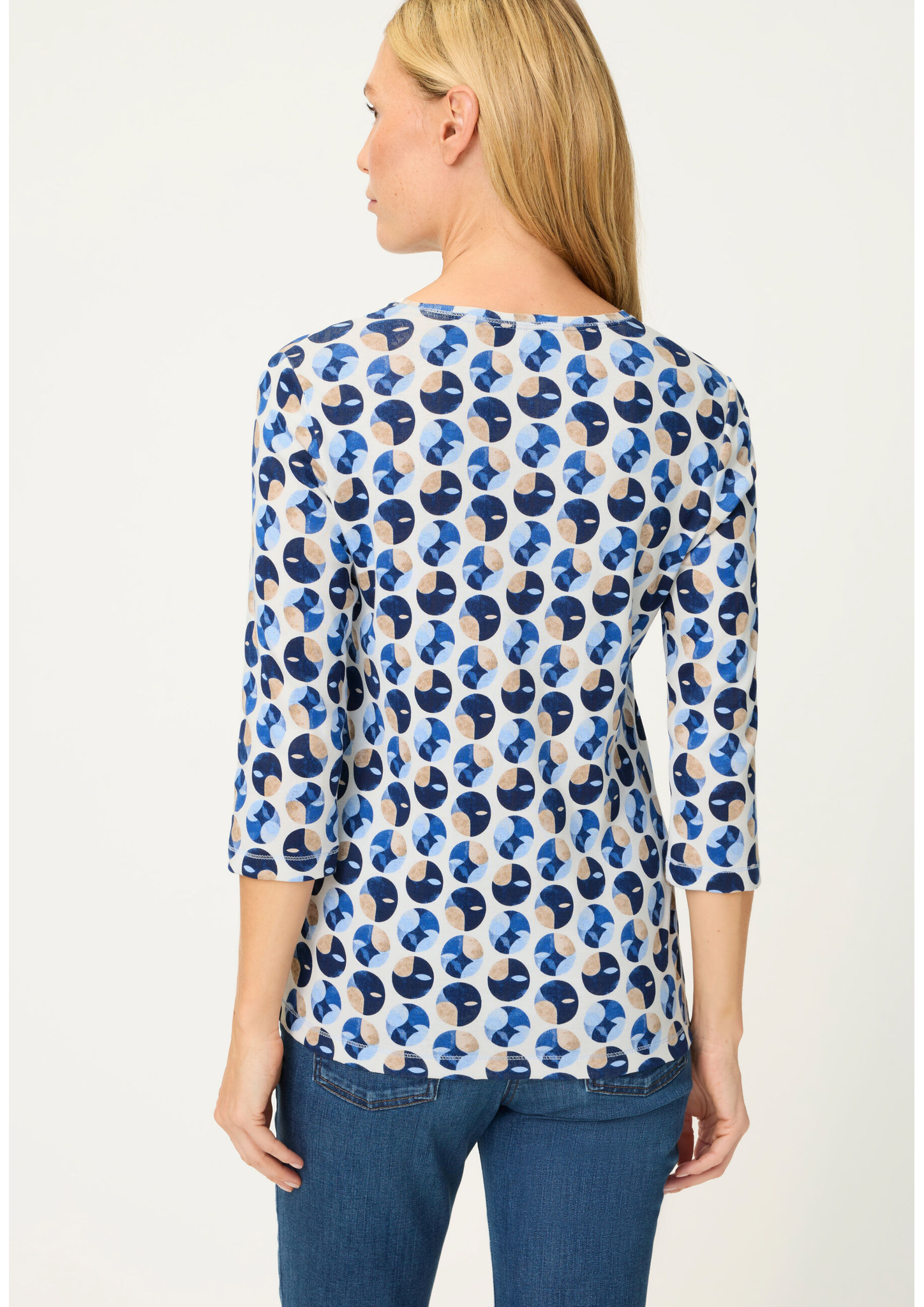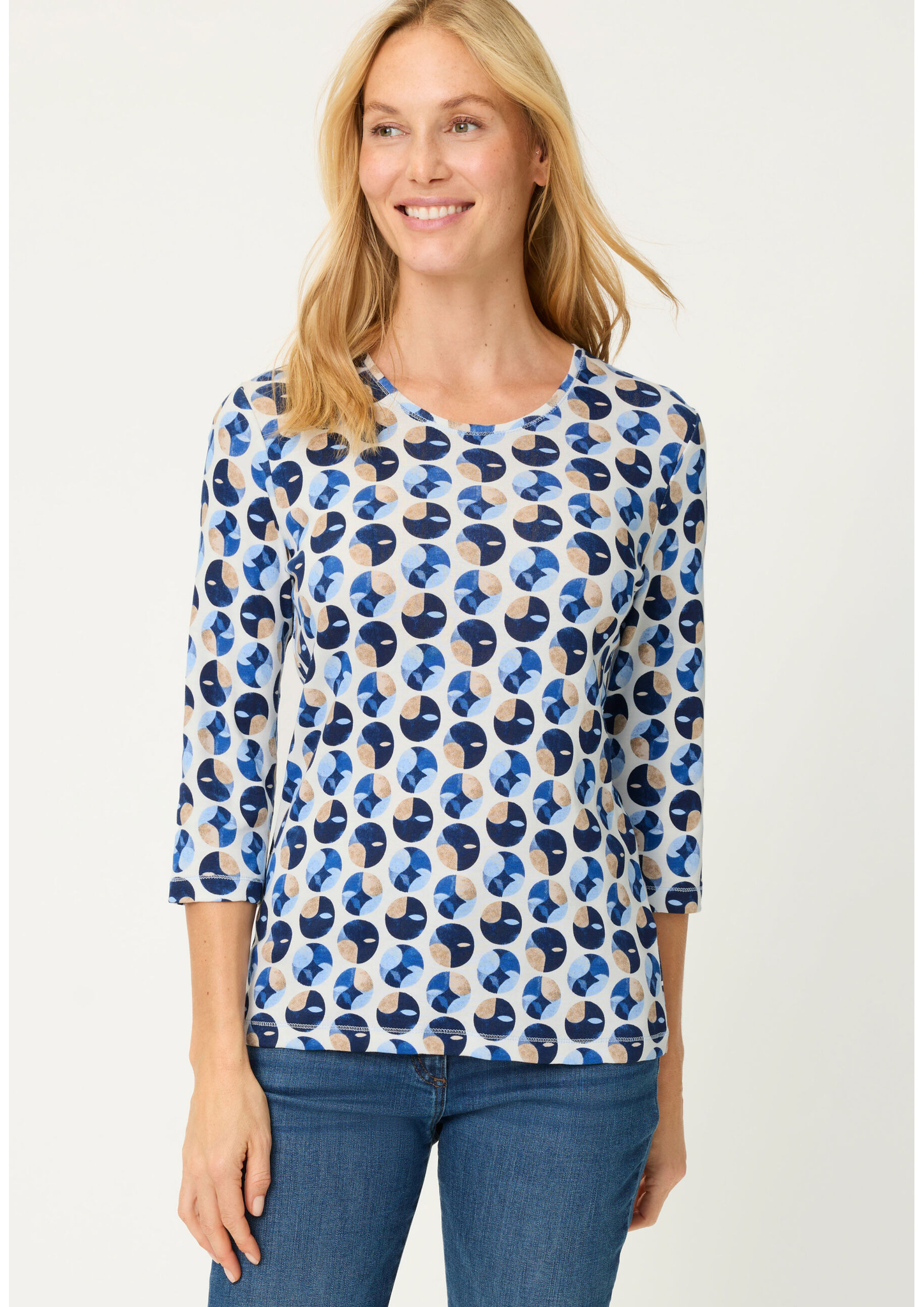 Dieses T-Shirt überzeugt mit einem stilvollen Allover-Dessin, das jedem Outfit einen modernen Touch verleiht. Der klassische Rundhalsausschnitt und die 3/4-Ärmel sorgen für eine feminine Silhouette und angenehmen Tragekomfort. Gefertigt aus reiner Baumwolle, bietet das Shirt ein weiches, atmungsaktives Gefühl auf der Haut. Ein vielseitiges Essential, das sich perfekt für den Alltag und gepflegte Freizeitlooks eignet. Länge ca. 62 cm.