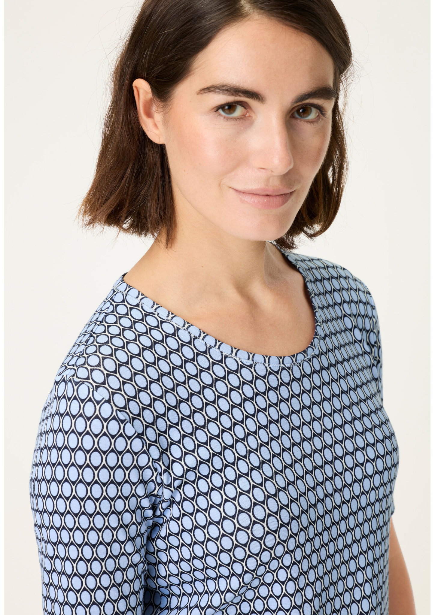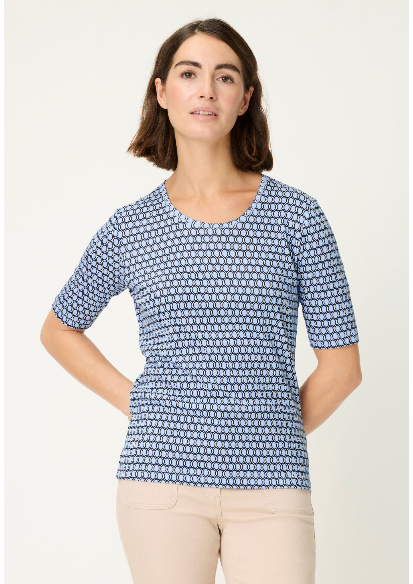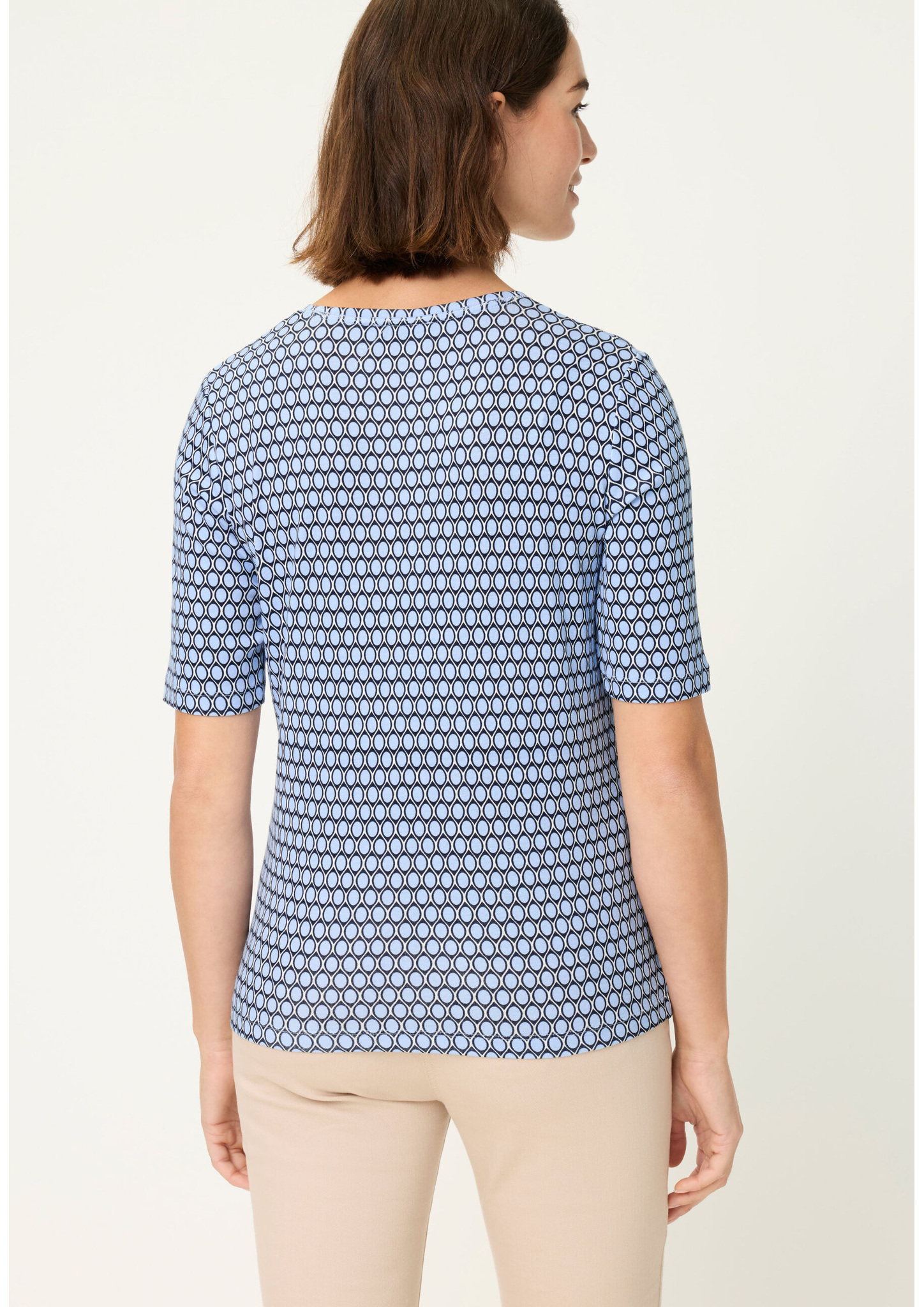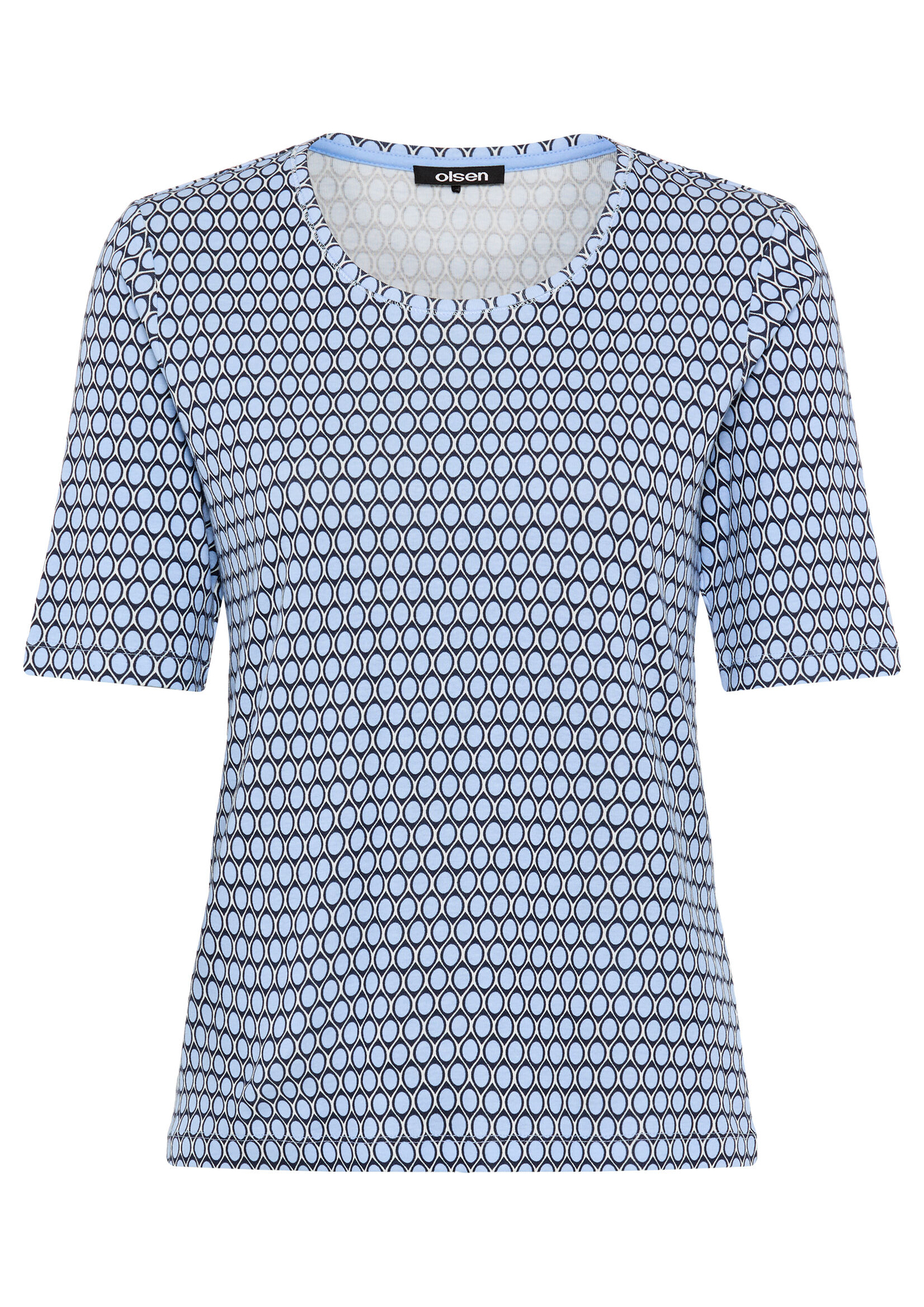 T-Shirt in der Olsen-Passform „Edda“ mit femininem Rundhalsausschnitt und kurzem Ärmel. Das Allover-Dessin verleiht dem Basic einen modernen Look, während die reine Baumwollqualität für ein angenehm weiches Tragegefühl sorgt. Ein vielseitig kombinierbares Shirt, das in keinem Kleiderschrank fehlen darf. Länge ca. 60 cm.
