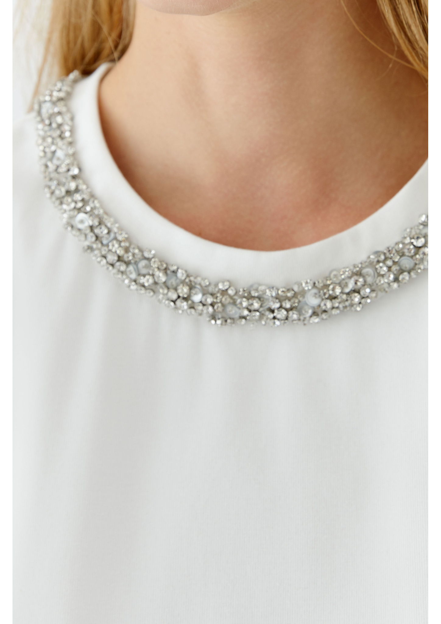 Elastischer Baumwolljersey Gerade geschnitten, reguläre Länge Rundhals, hinten mit Schlitz und kleinem Knöpfchen Blende mit Ziersteinen und Pailetten Leicht überschnittene Schulter mit Halbarm * Länge bei Größe 36: 58cm