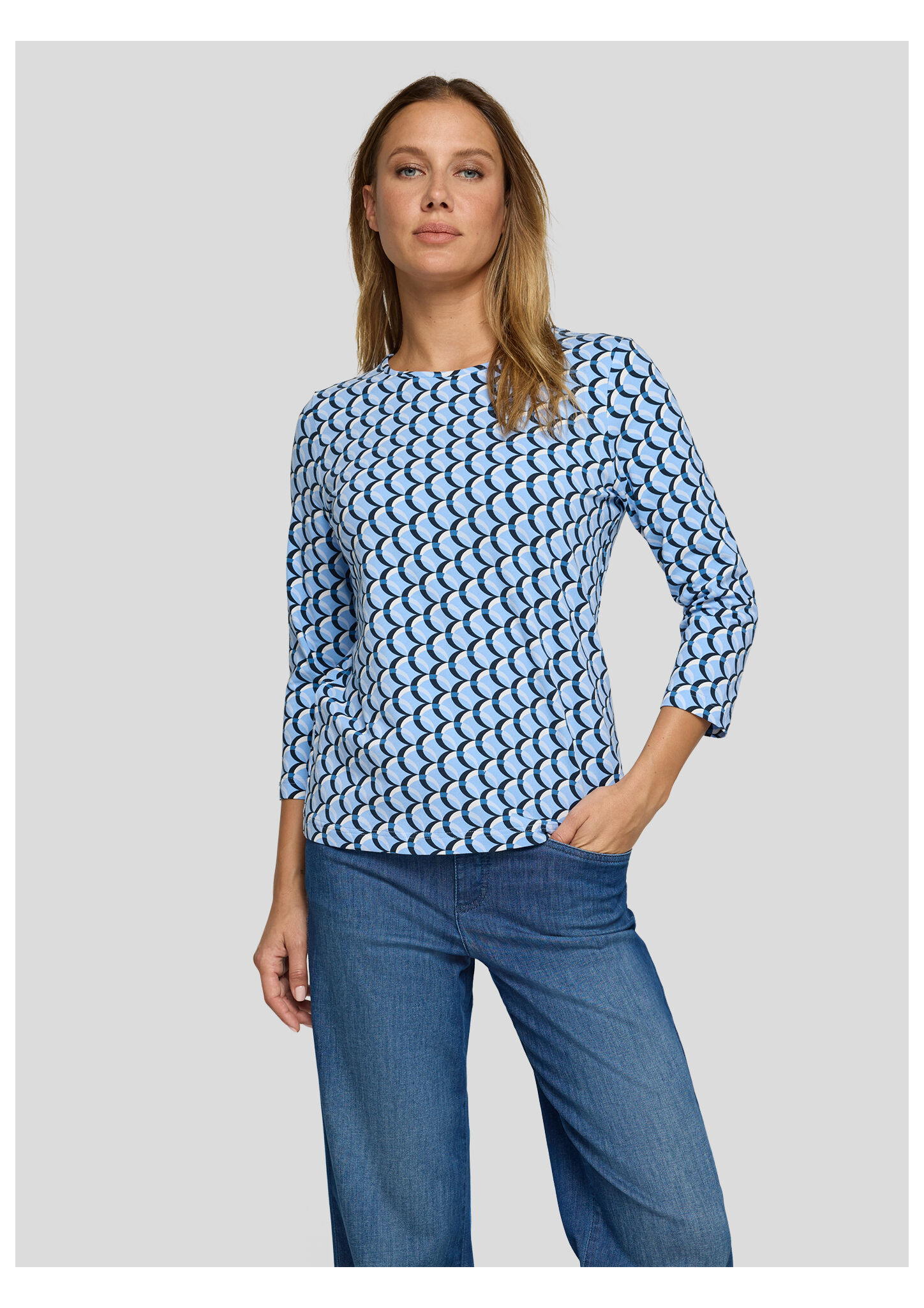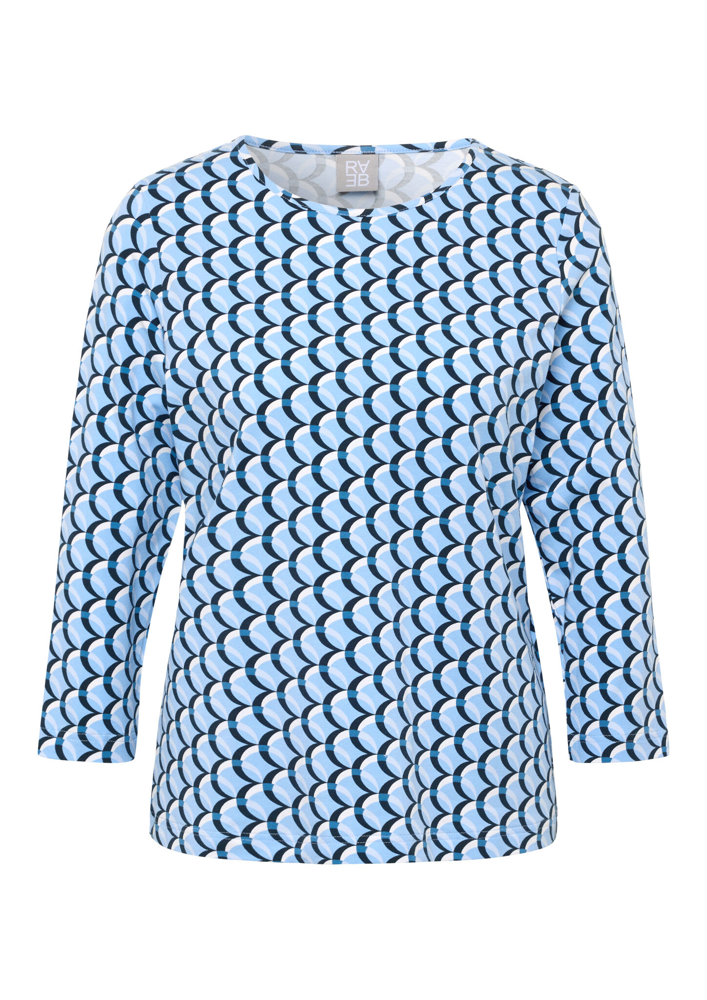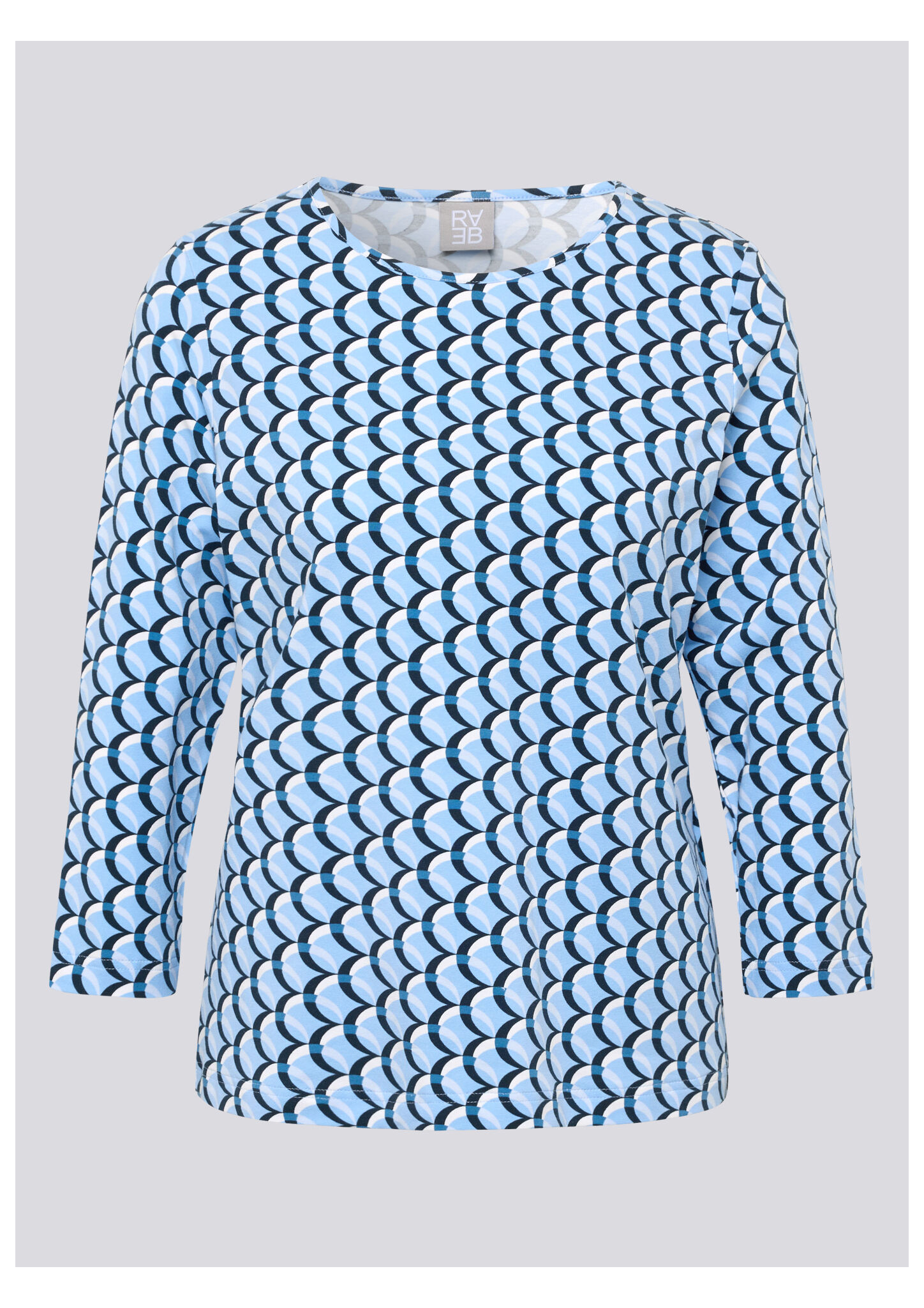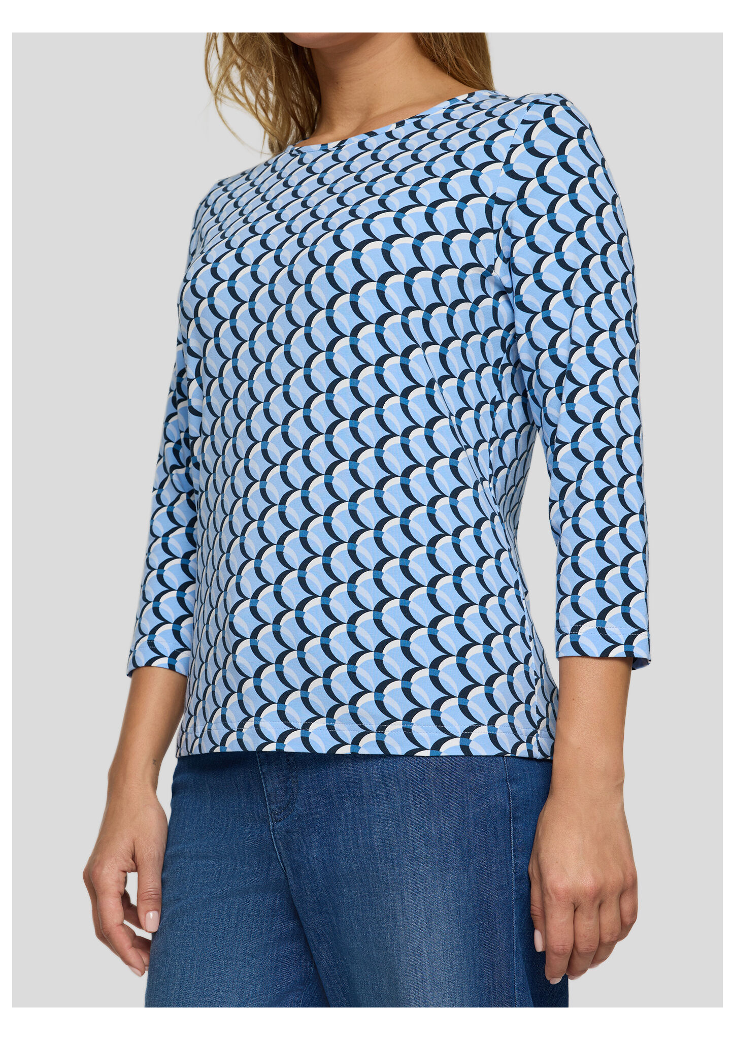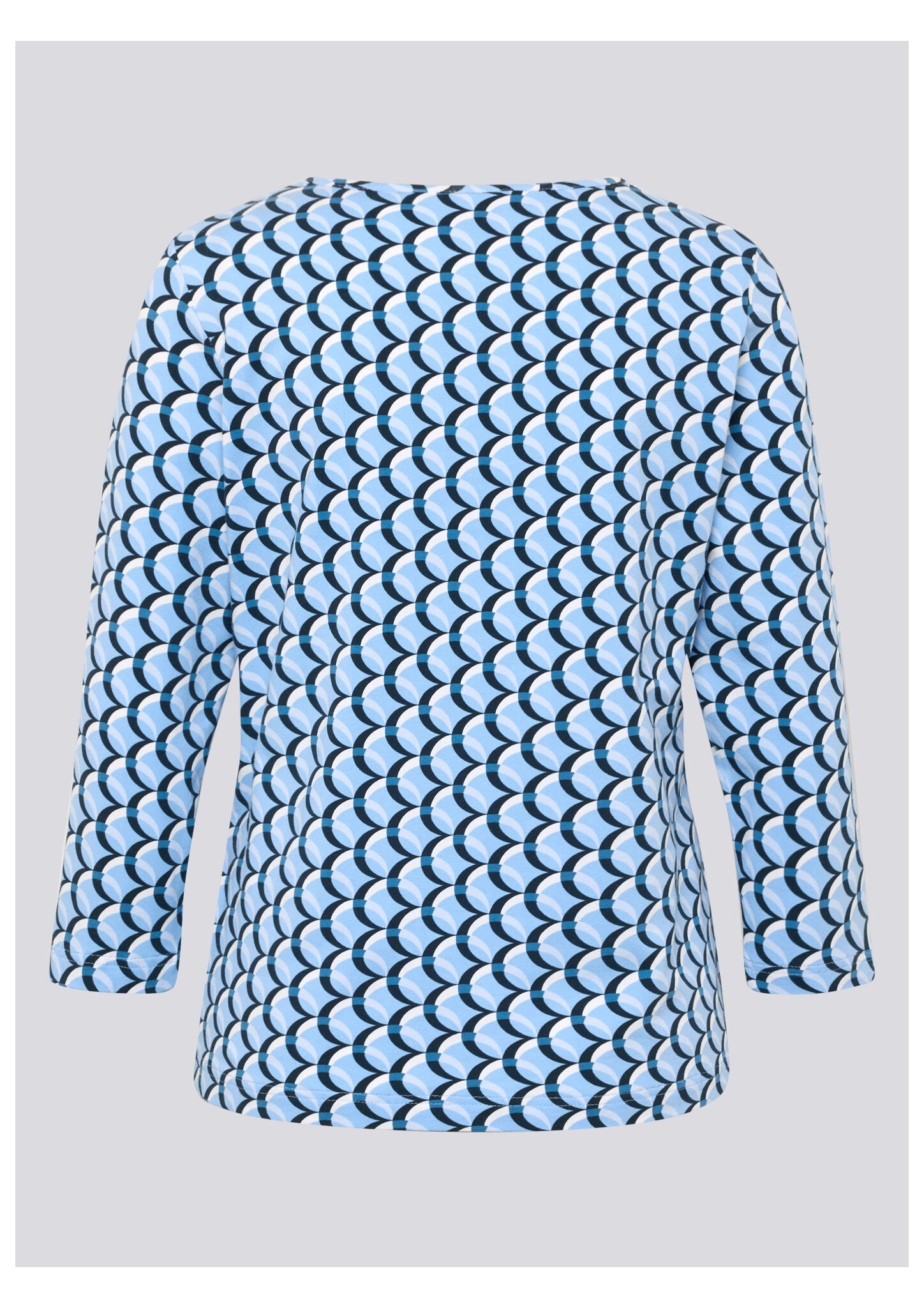 Dieses Jerseyshirt begeistert mit einem modernen, grafischen Allover-Design in abgestimmten Blautönen. Der klassische Rundhalsausschnitt und die 3/4-langen Ärmel machen es zum idealen Begleiter für Übergangszeiten und vielseitige Freizeit-Looks. Die elastische Qualität sorgt für angenehmen Tragekomfort und einen guten Sitz. Weiches Jersey-Material. Grafisches Allover-Muster. Bequemer Rundhalsausschnitt. 3/4-lange Ärmel. Elastischer, tragefreundlicher Stoff.