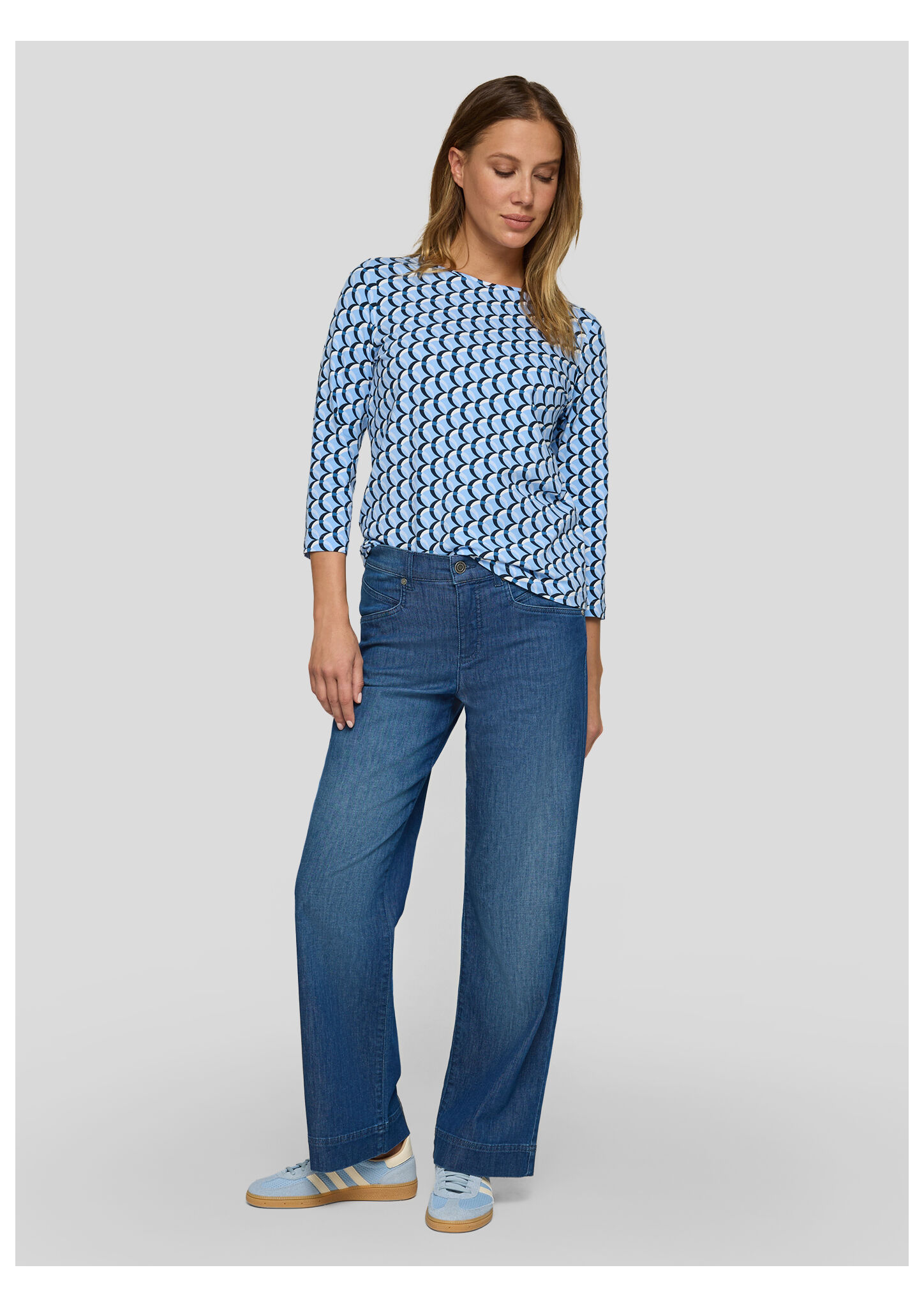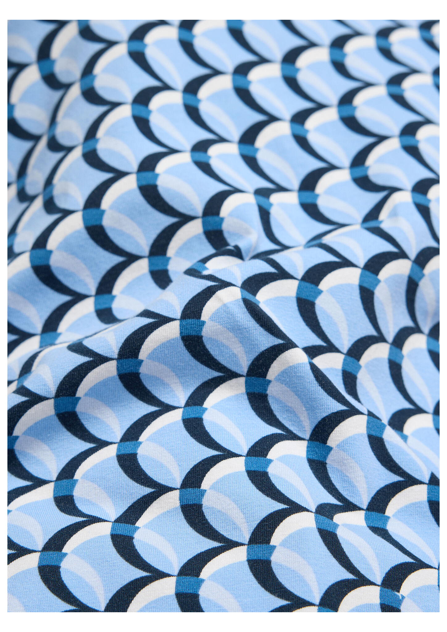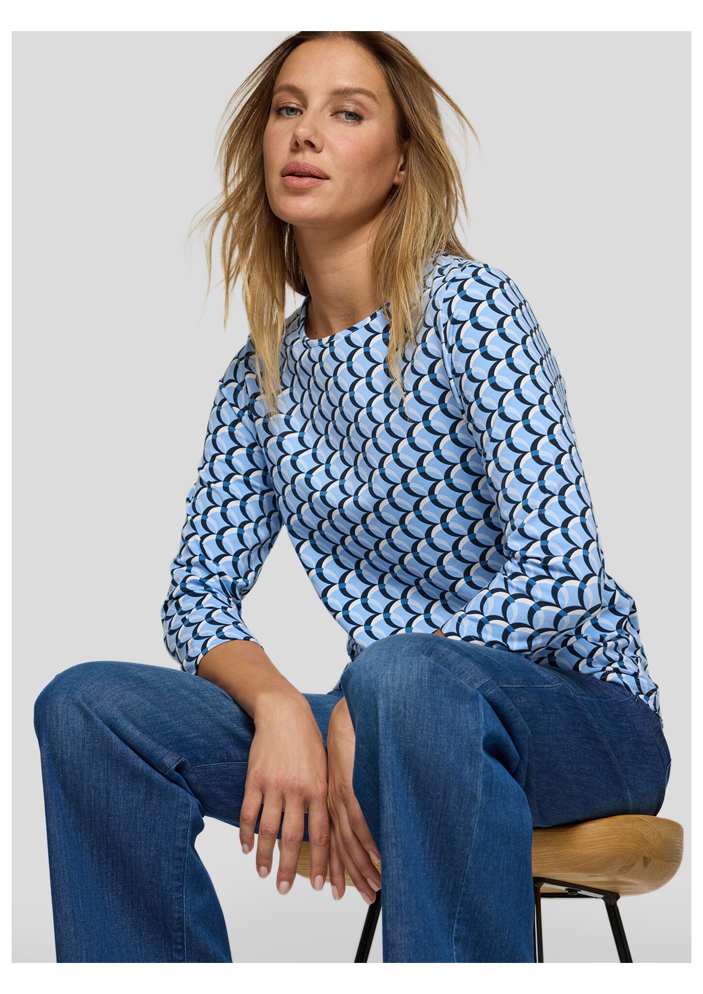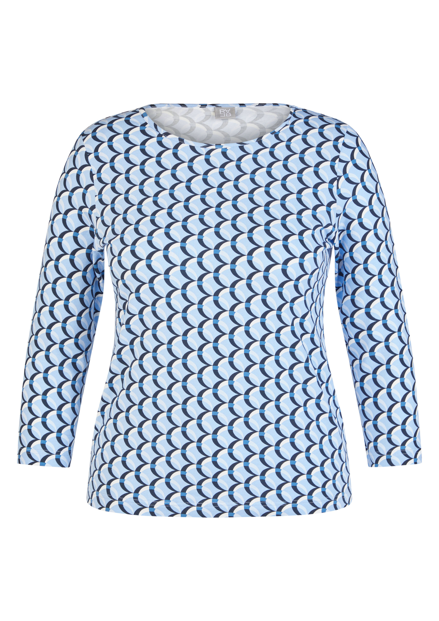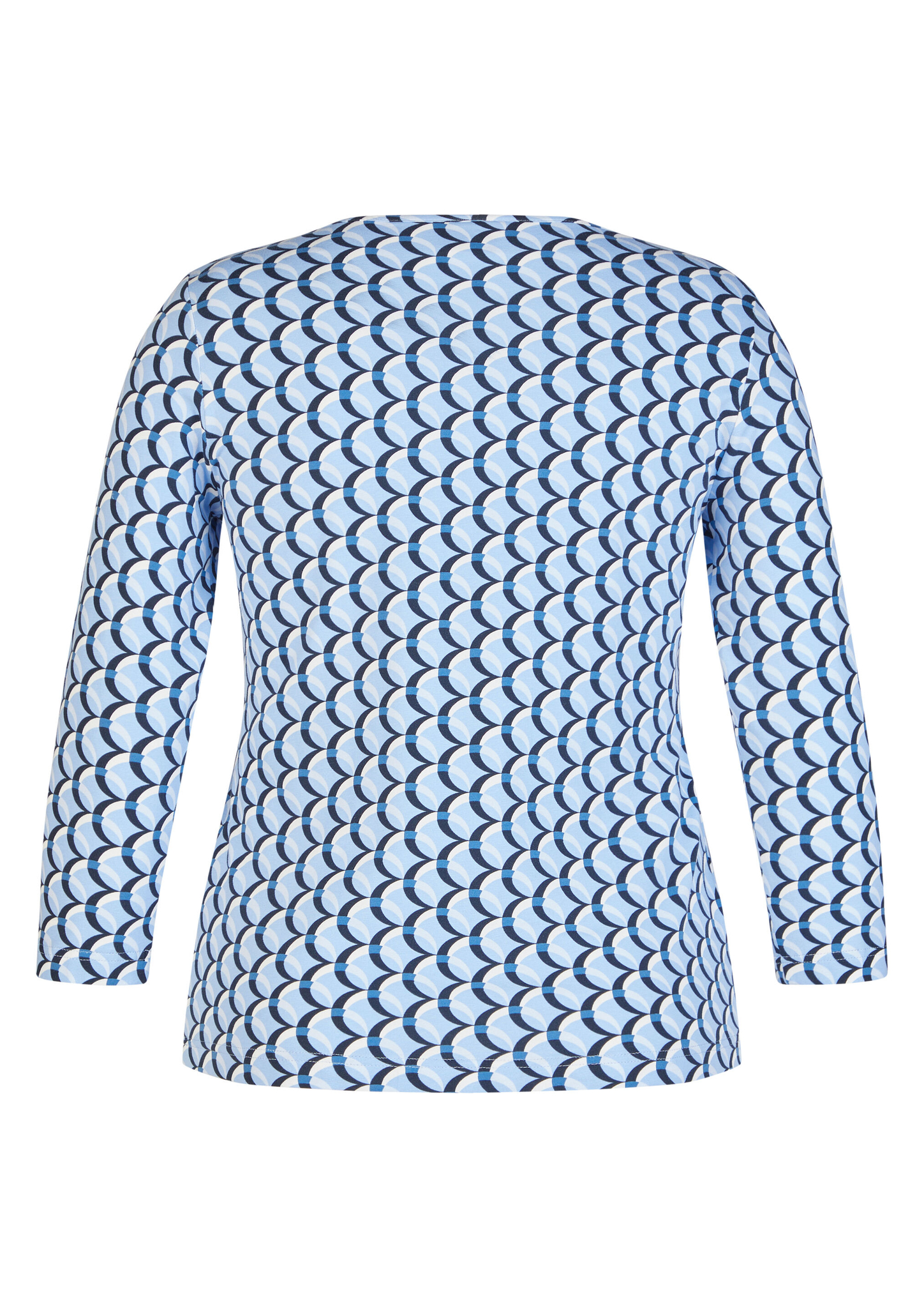 Dieses Jerseyshirt begeistert mit einem modernen, grafischen Allover-Design in abgestimmten Blautönen. Der klassische Rundhalsausschnitt und die 3/4-langen Ärmel machen es zum idealen Begleiter für Übergangszeiten und vielseitige Freizeit-Looks. Die elastische Qualität sorgt für angenehmen Tragekomfort und einen guten Sitz. Weiches Jersey-Material. Grafisches Allover-Muster. Bequemer Rundhalsausschnitt. 3/4-lange Ärmel. Elastischer, tragefreundlicher Stoff.