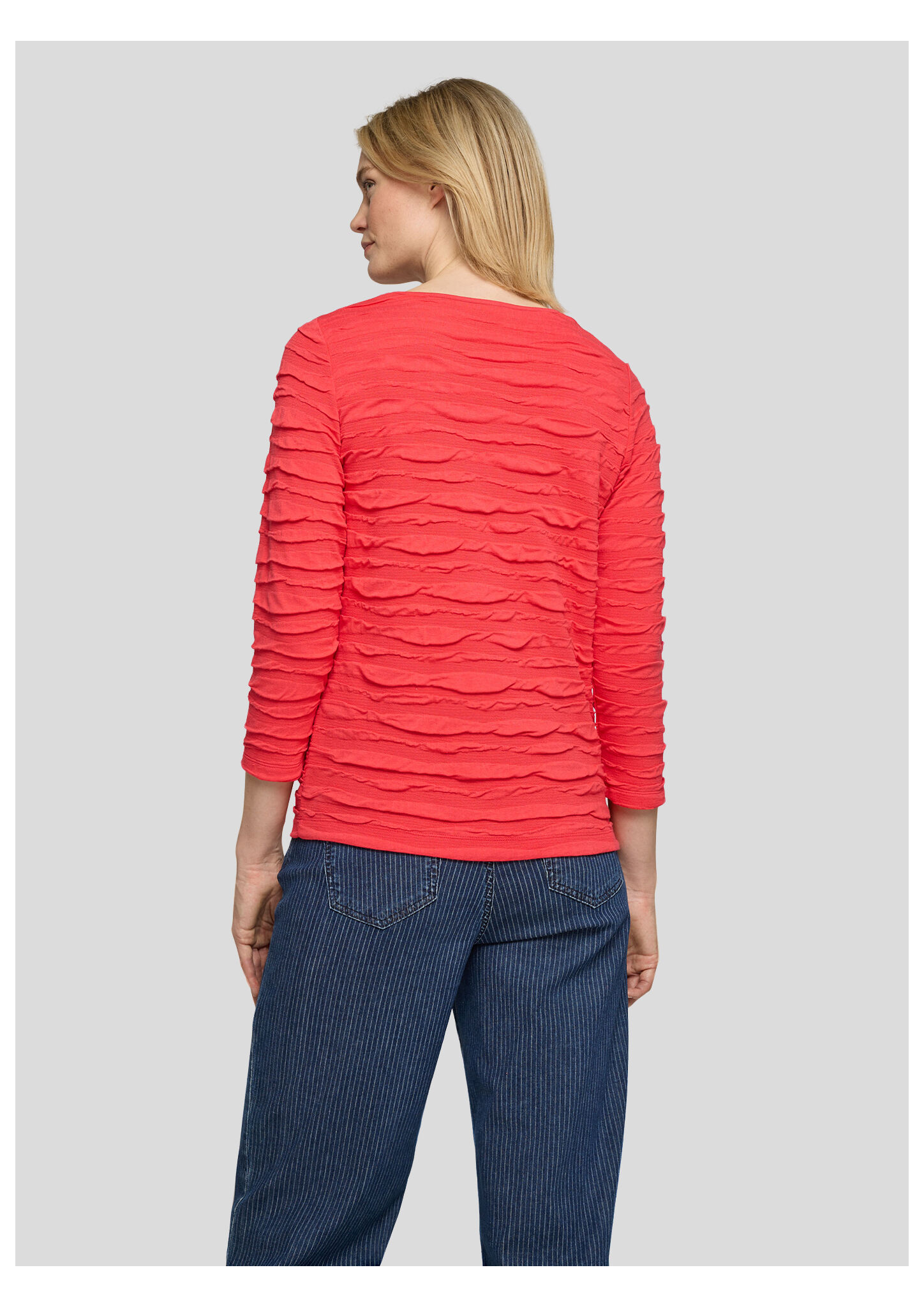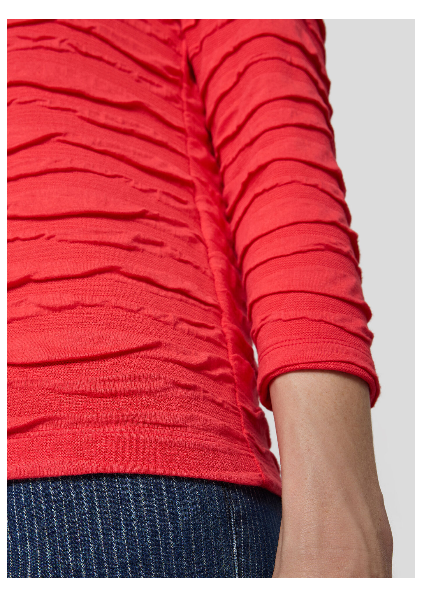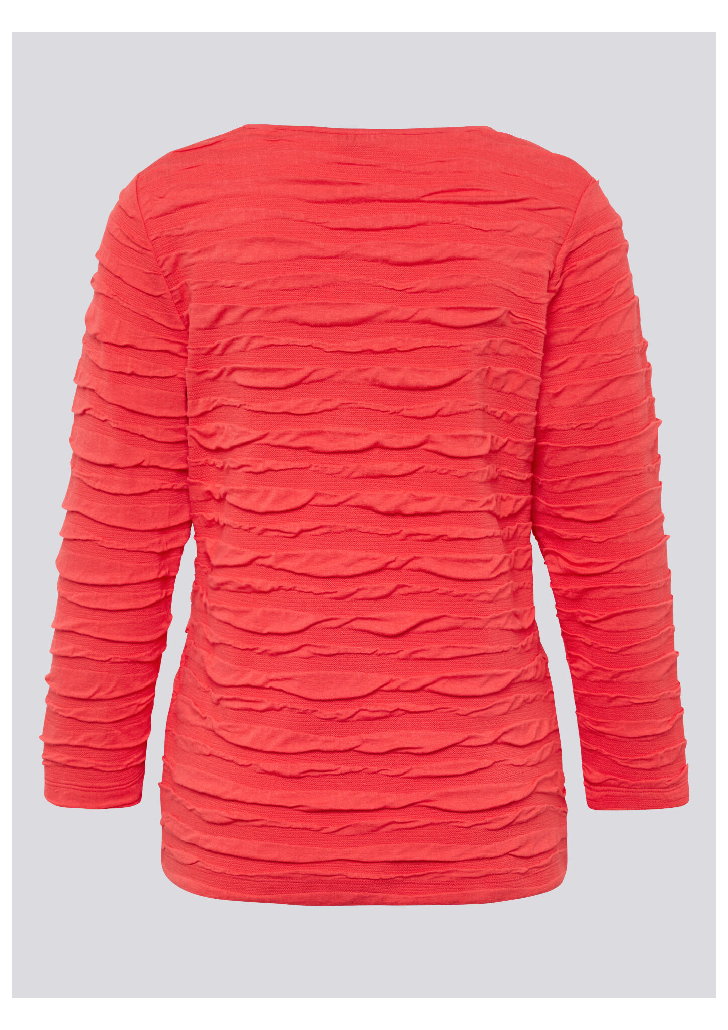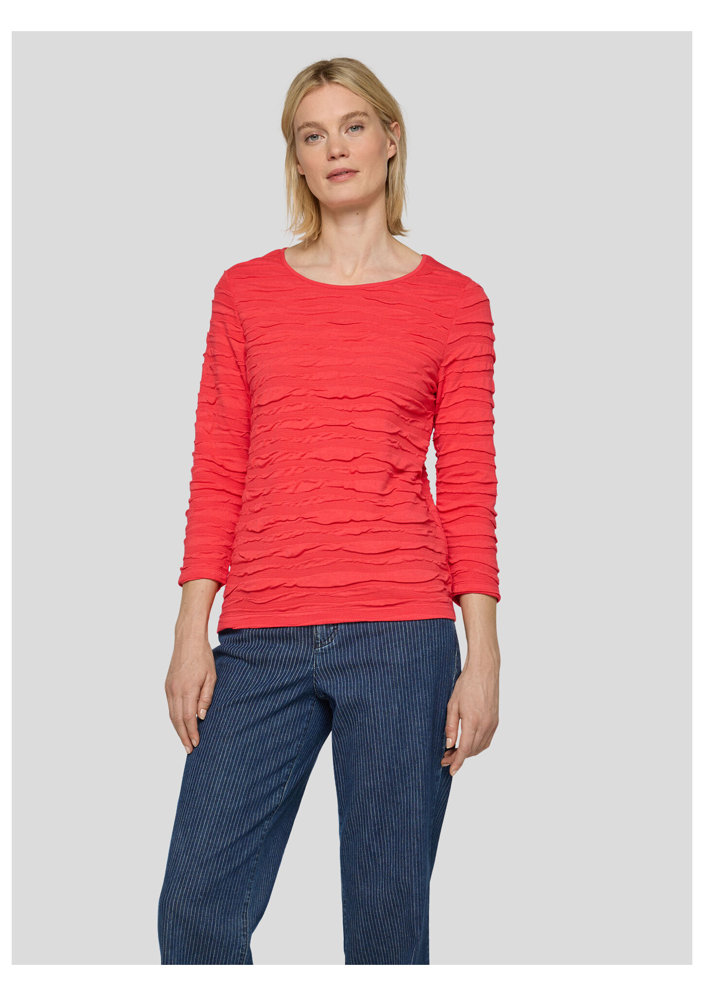 Dieses Shirt setzt auf einen besonderen Oberflächeneffekt: Die unregelmäßige Crinkle-Struktur sorgt für eine spannende Optik und macht das Modell zum Blickfang. Der weiche Viskose-Mix liegt angenehm auf der Haut, während Elasthan für extra Komfort sorgt. Perfekt zu Jeans oder unifarbenen Hosen kombinierbar. Crinkle-Effekt mit 3D-Struktur. Elastischer Viskose-Mix Bequeme, figurumspielende Form. Rundhalsausschnitt. Ärmel in 3/4-Länge.