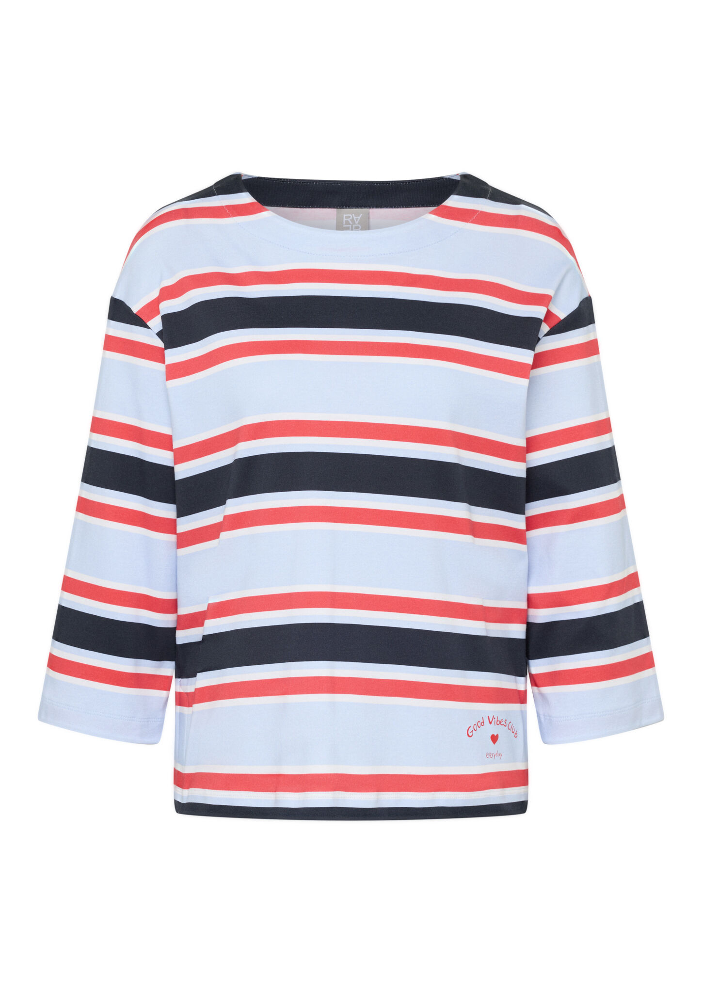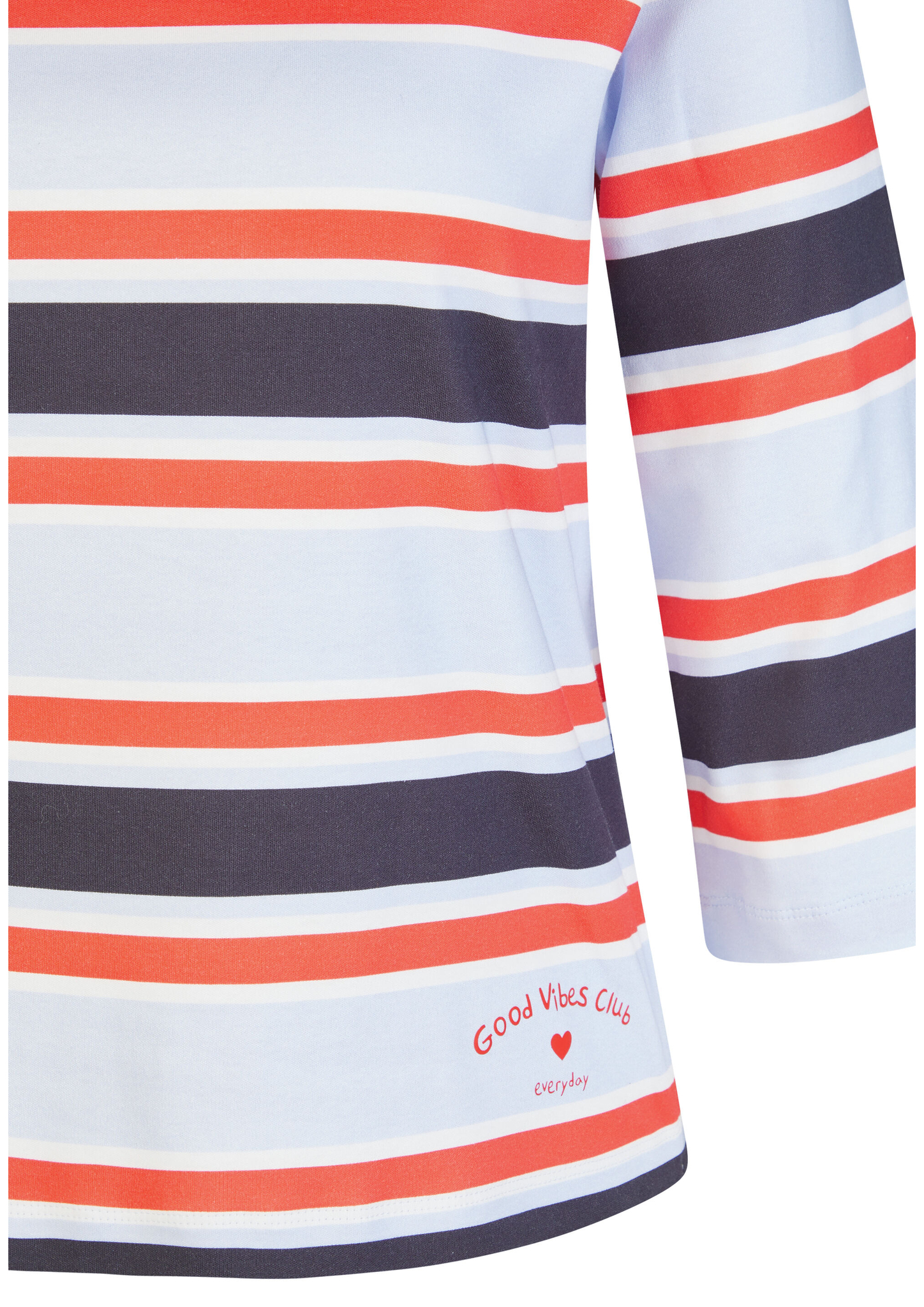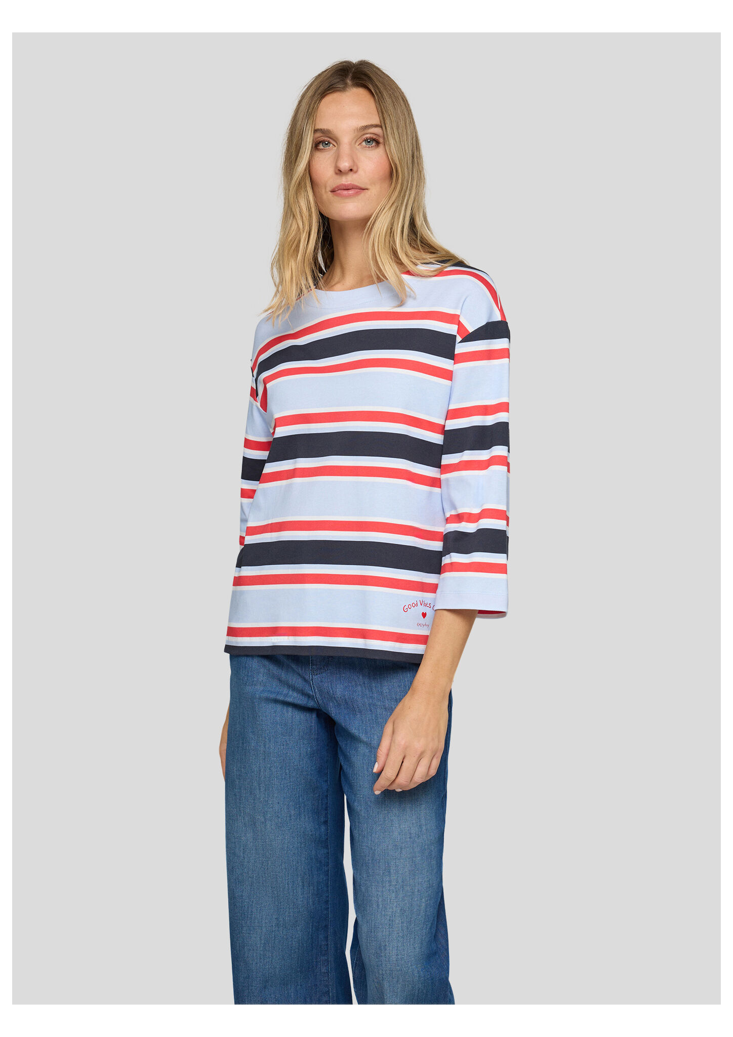 Dieses Ringelshirt begeistert mit einem frischen Streifenmuster in Hellblau, Weiß, Rot und Marine. Der sportive Look wird durch den platzierten Schriftzug _Good Vibes Club _ everyday_ auf der Vorderseite modisch ergänzt. Der lockere Schnitt und die 3/4-Ärmel sorgen für angenehmen Tragekomfort. Hergestellt aus reiner Baumwolle, liegt das Shirt weich auf der Haut _ ideal für legere Alltags-Outfits. Reine Baumwolle in weicher Qualität. Platziertes Print-Detail am Saum. 3/4-Ärmel für leichten Look. Klassischer Rundhalsausschnitt. Bequeme, lässige Passform.