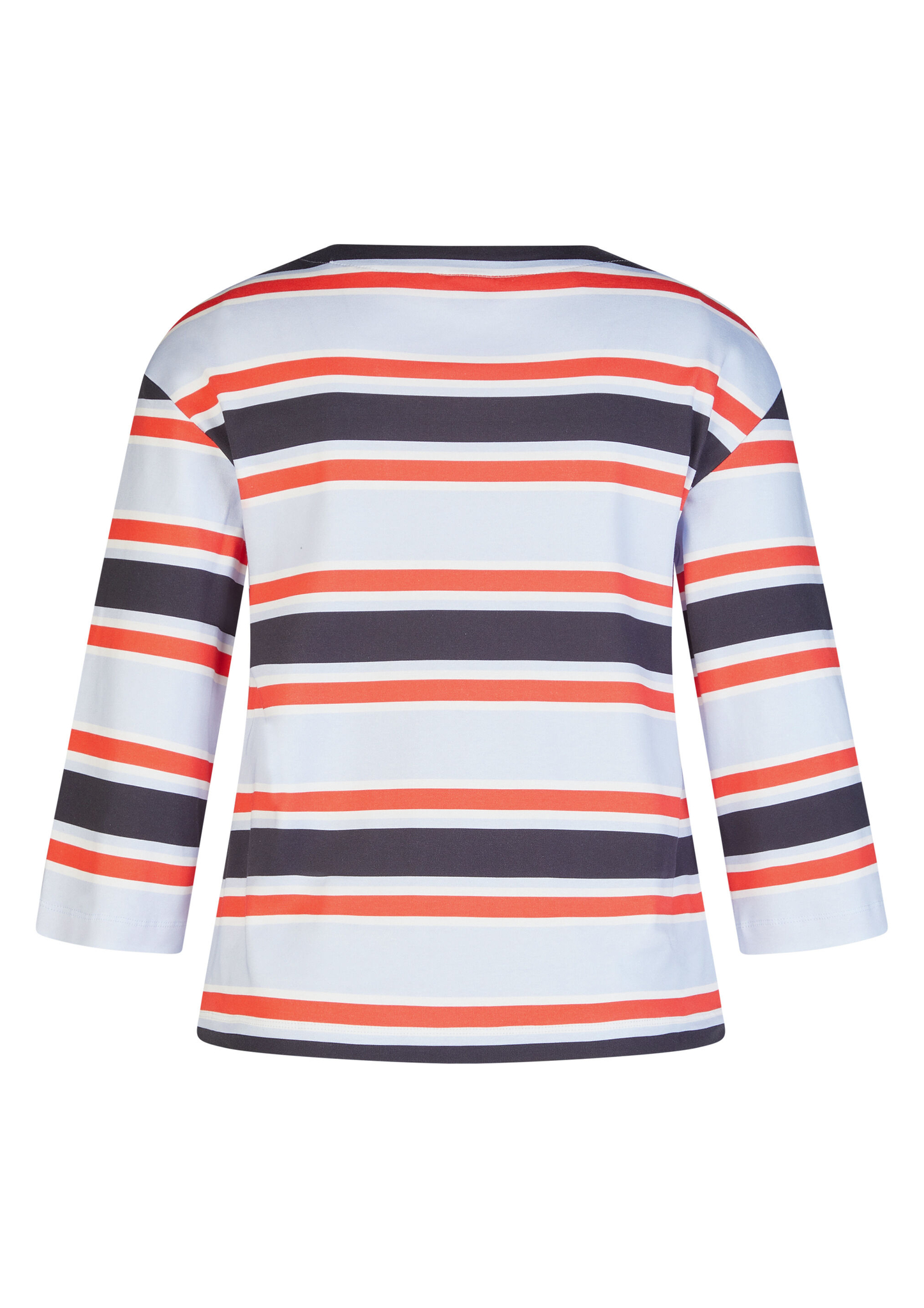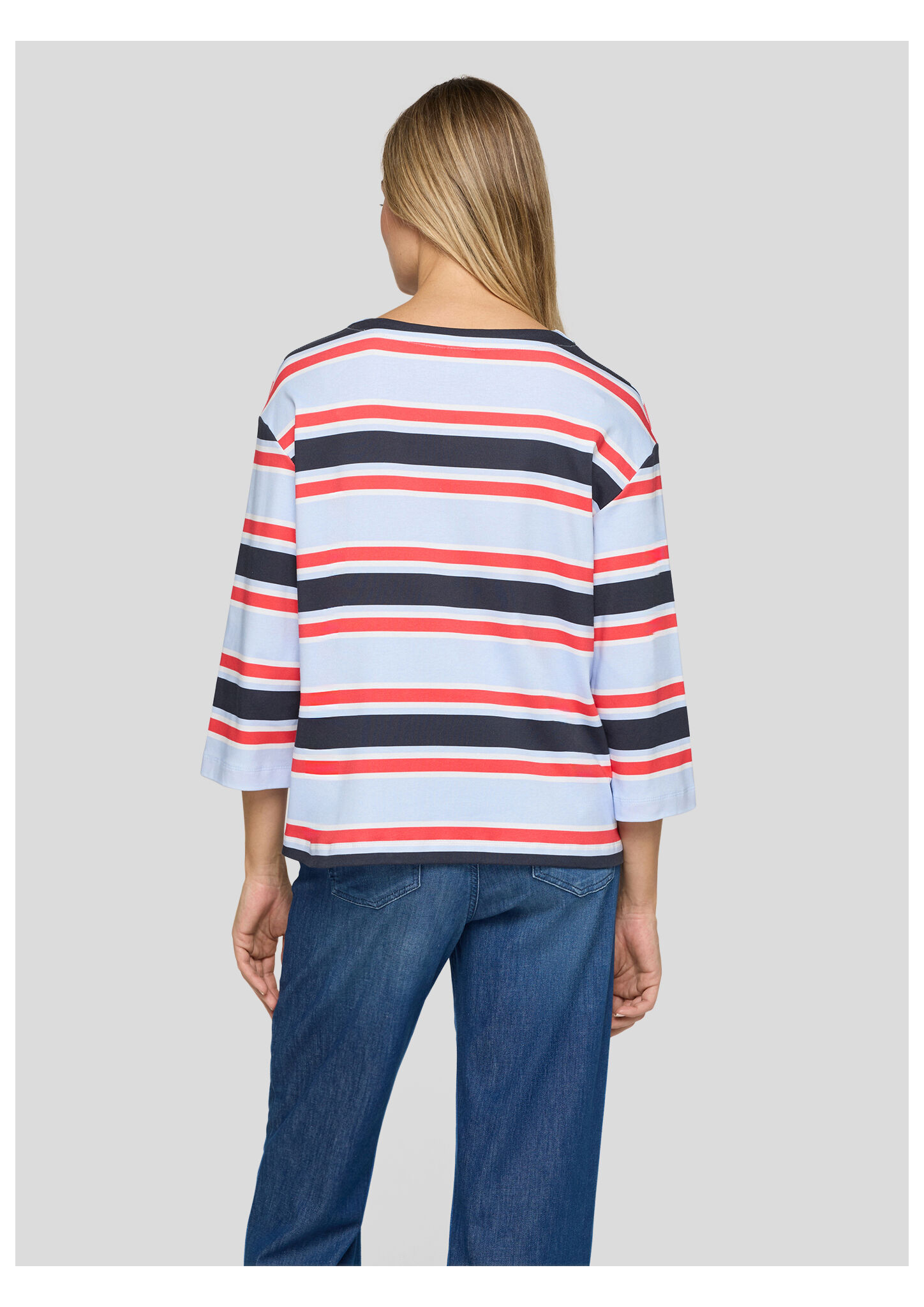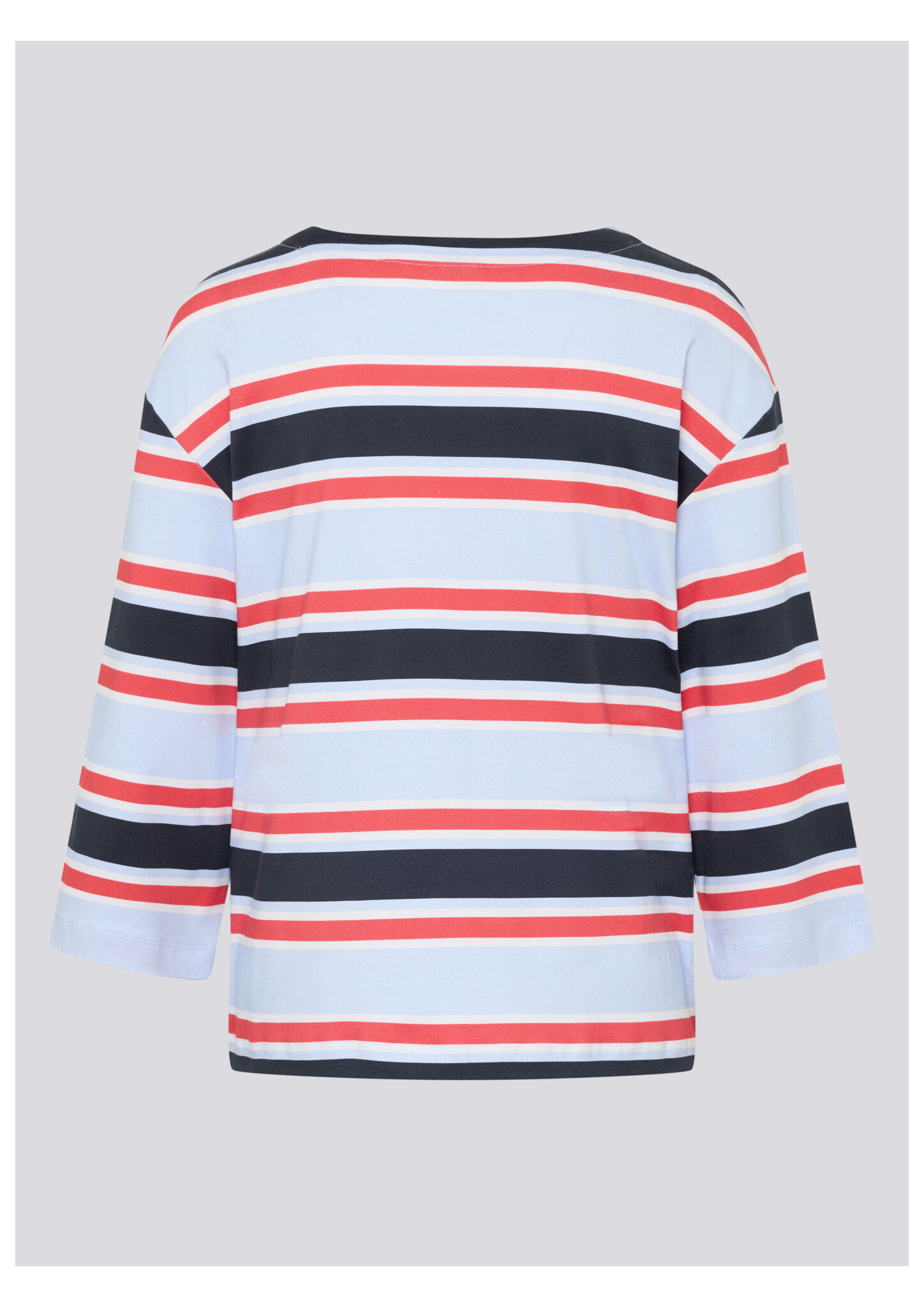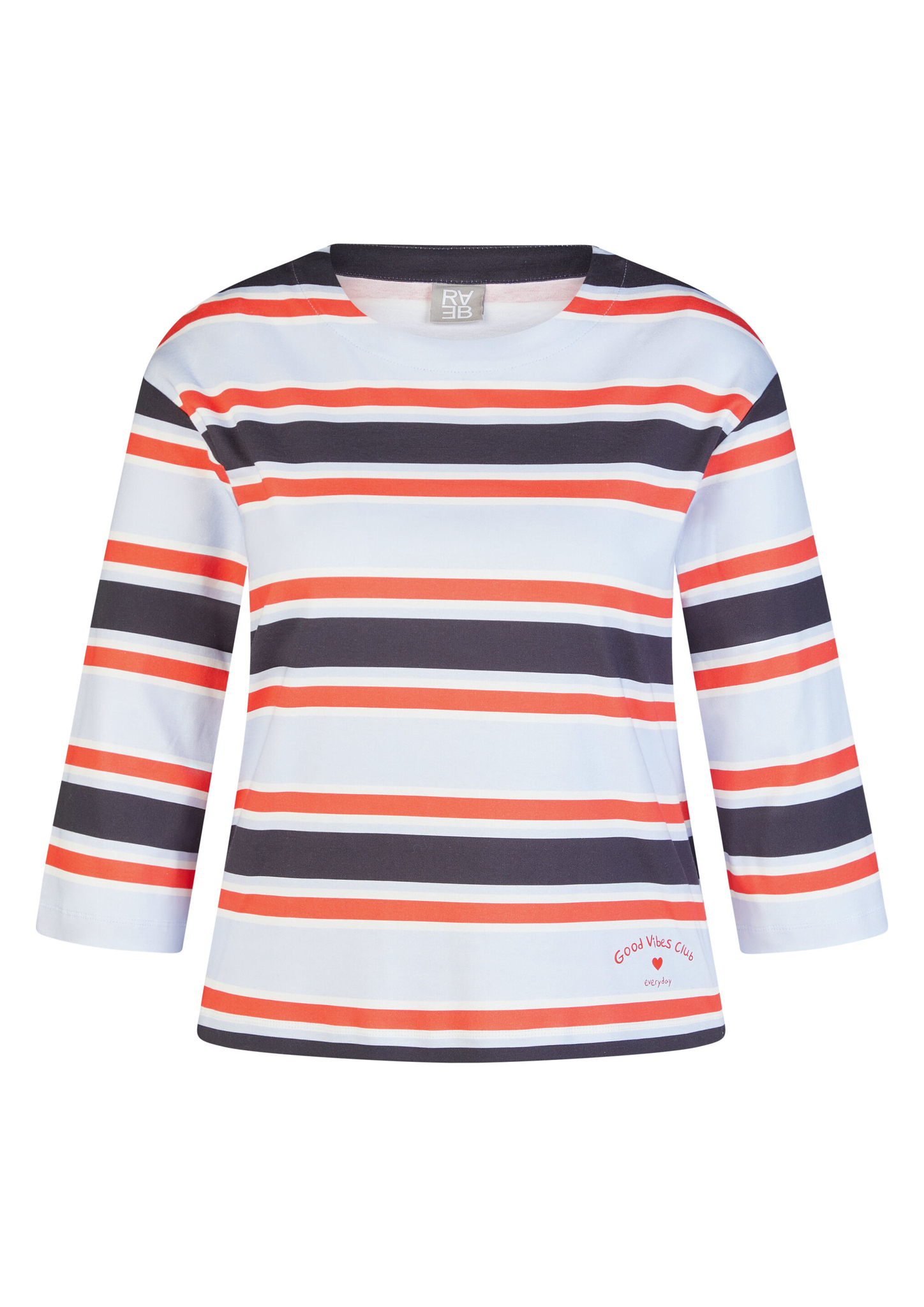 Dieses Ringelshirt begeistert mit einem frischen Streifenmuster in Hellblau, Weiß, Rot und Marine. Der sportive Look wird durch den platzierten Schriftzug _Good Vibes Club _ everyday_ auf der Vorderseite modisch ergänzt. Der lockere Schnitt und die 3/4-Ärmel sorgen für angenehmen Tragekomfort. Hergestellt aus reiner Baumwolle, liegt das Shirt weich auf der Haut _ ideal für legere Alltags-Outfits. Reine Baumwolle in weicher Qualität. Platziertes Print-Detail am Saum. 3/4-Ärmel für leichten Look. Klassischer Rundhalsausschnitt. Bequeme, lässige Passform.