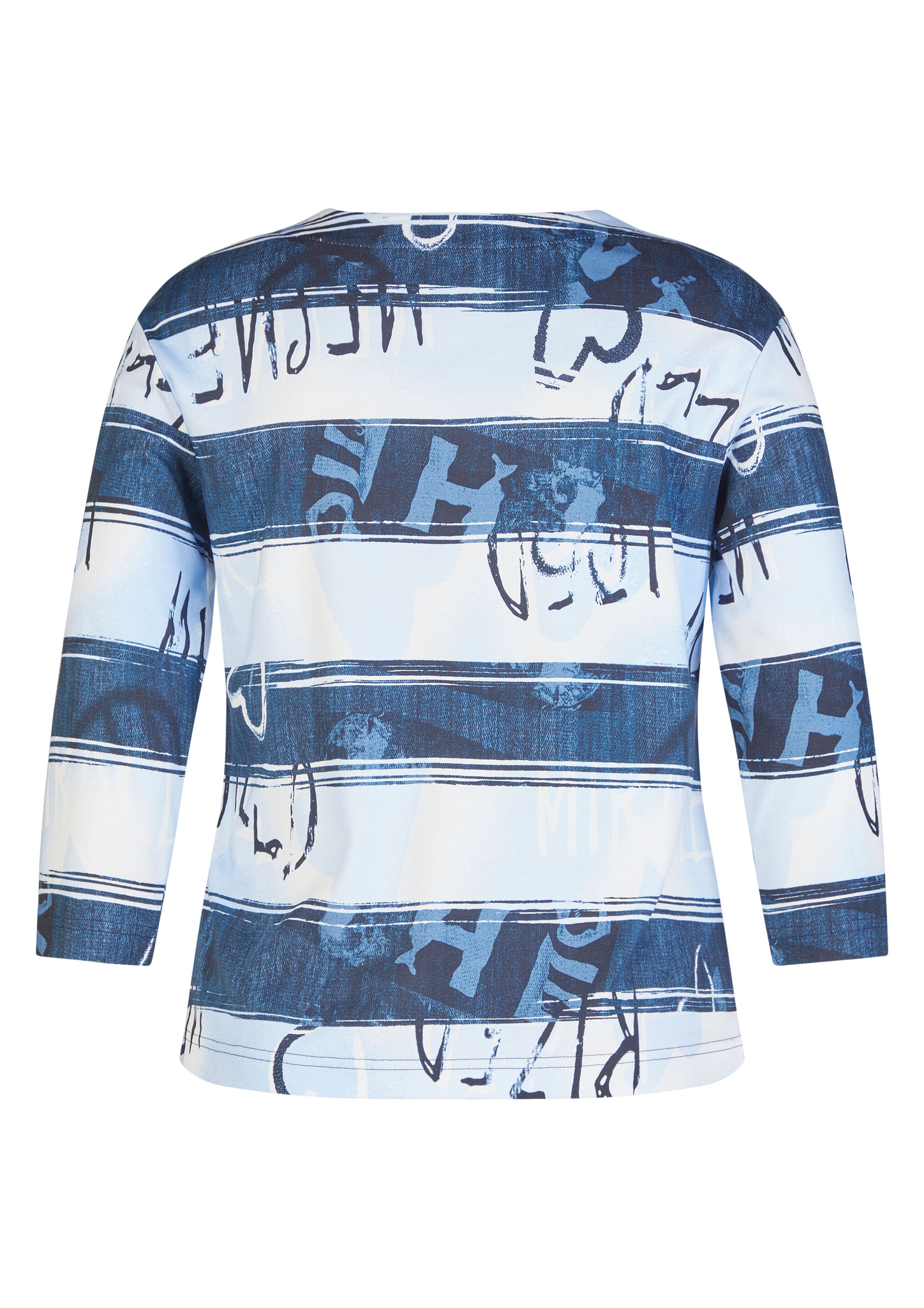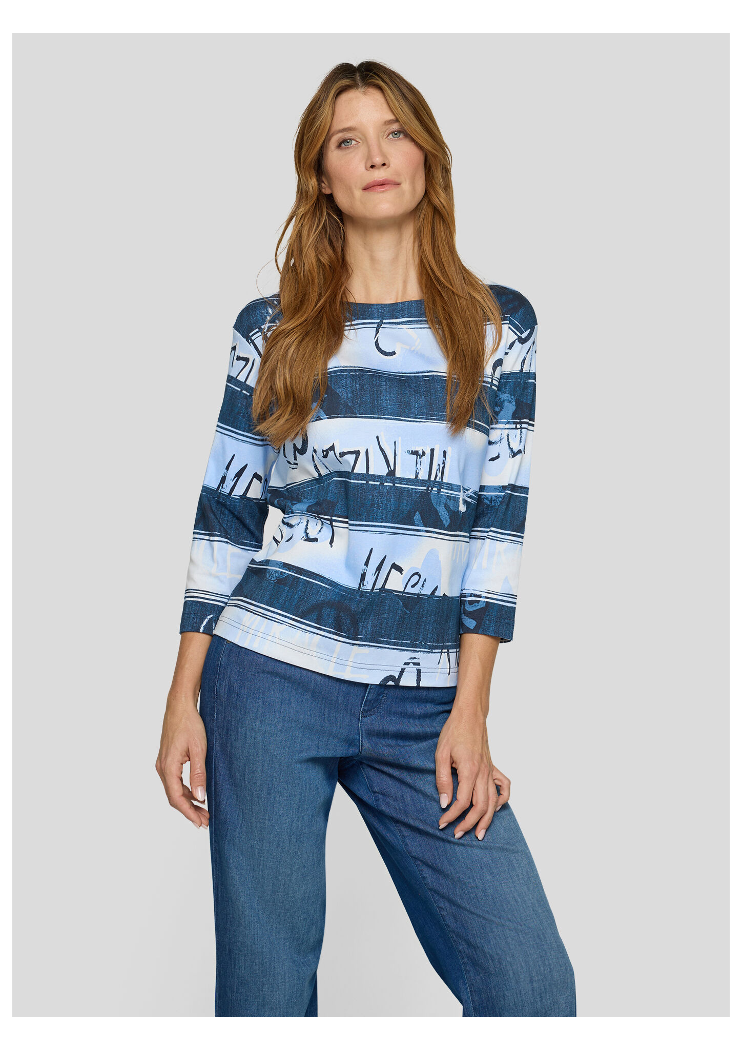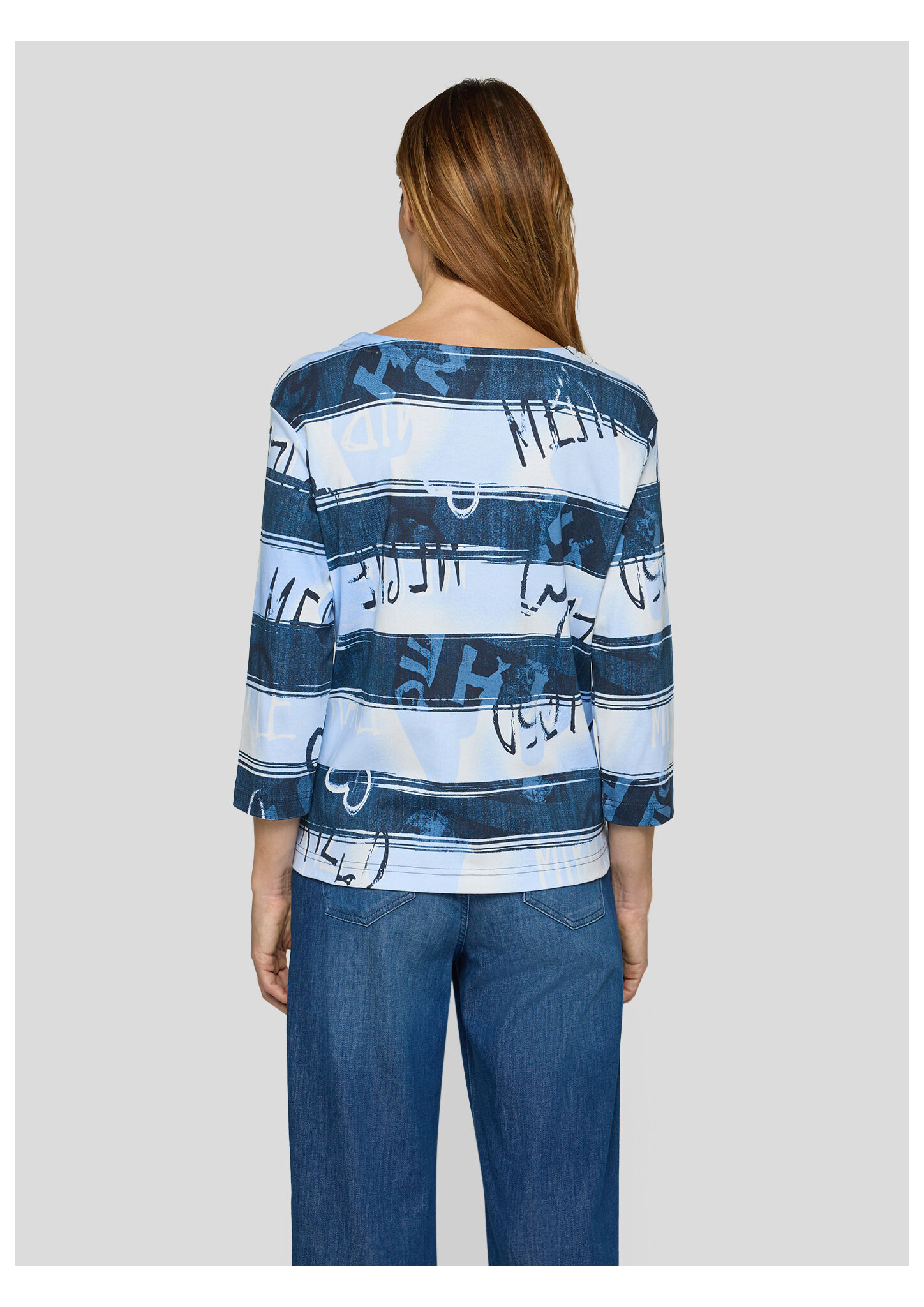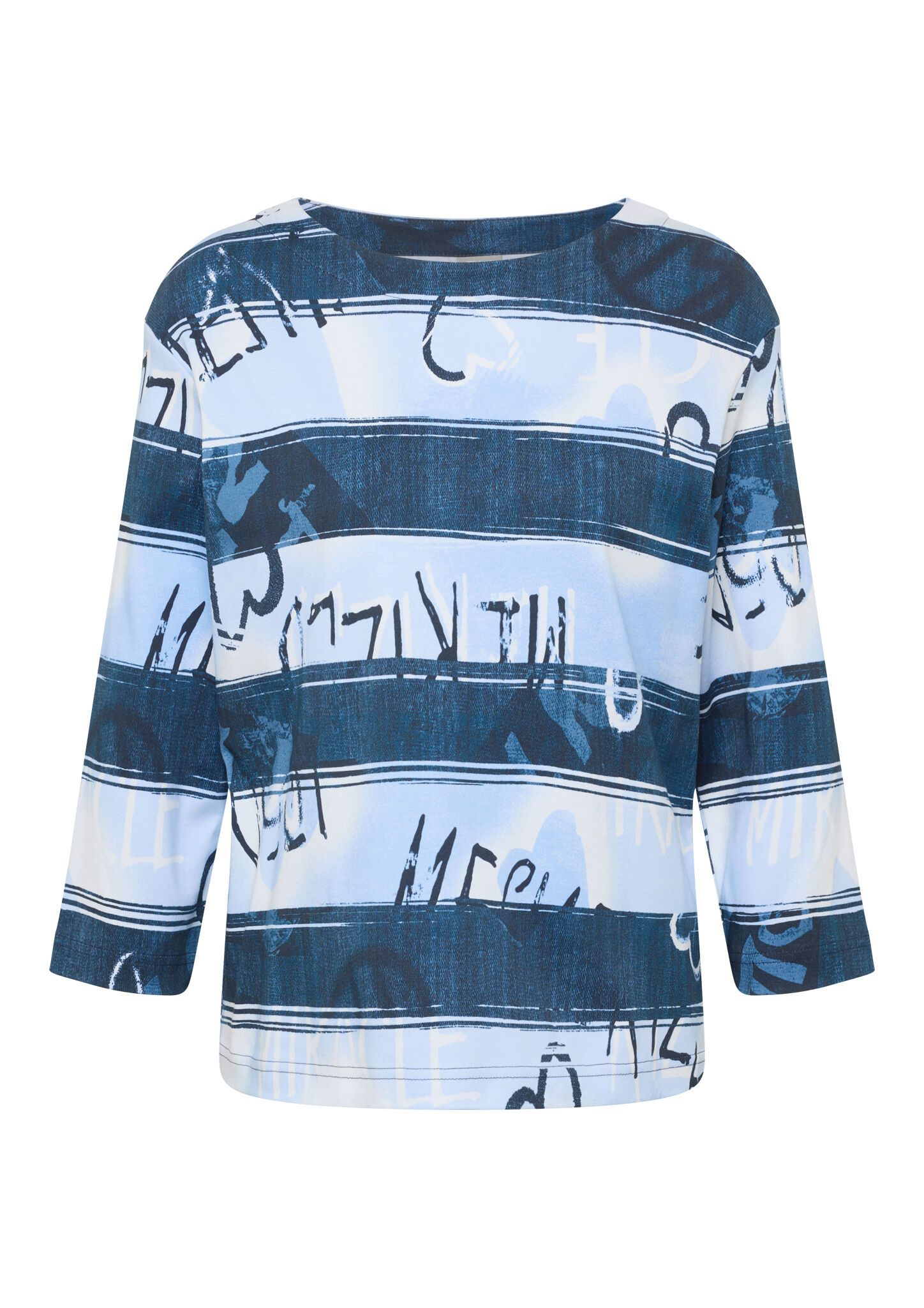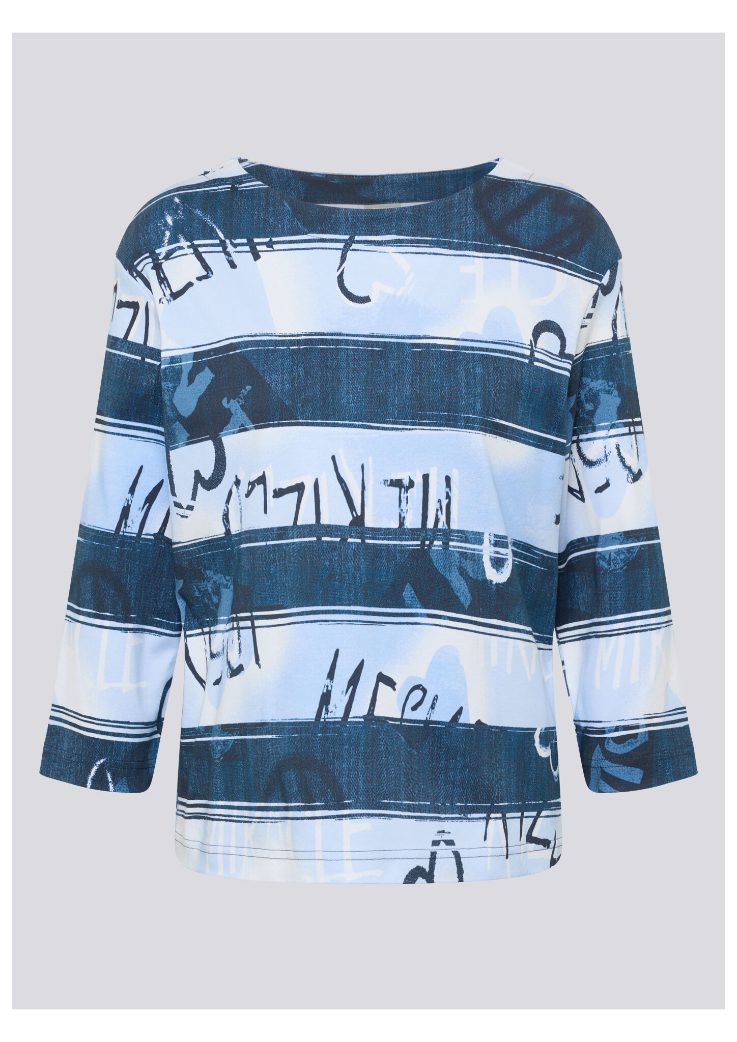 Dieses Shirt überzeugt mit einem modernen Allover-Print in Streifenoptik mit abstraktem Schriftzug. Der hochwertige Baumwolljersey trägt sich angenehm weich auf der Haut und sorgt für ein bequemes Tragegefühl. Der klassische Rundhalsausschnitt und die 3/4-Ärmel unterstreichen den legeren Charakter _ perfekt für entspannte Casual-Looks. Reine Baumwolle in Jersey-Qualität. 3/4-lange Ärmel. Rundhalsausschnitt. Locker geschnitten. Allover-Streifen mit Schriftzug.