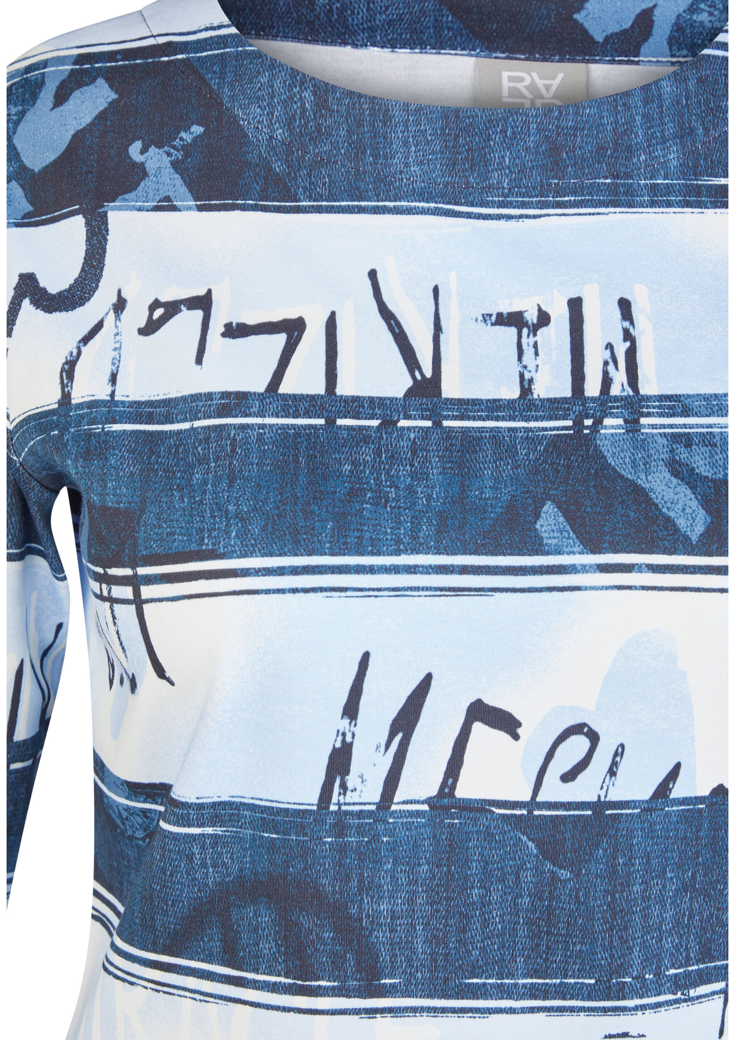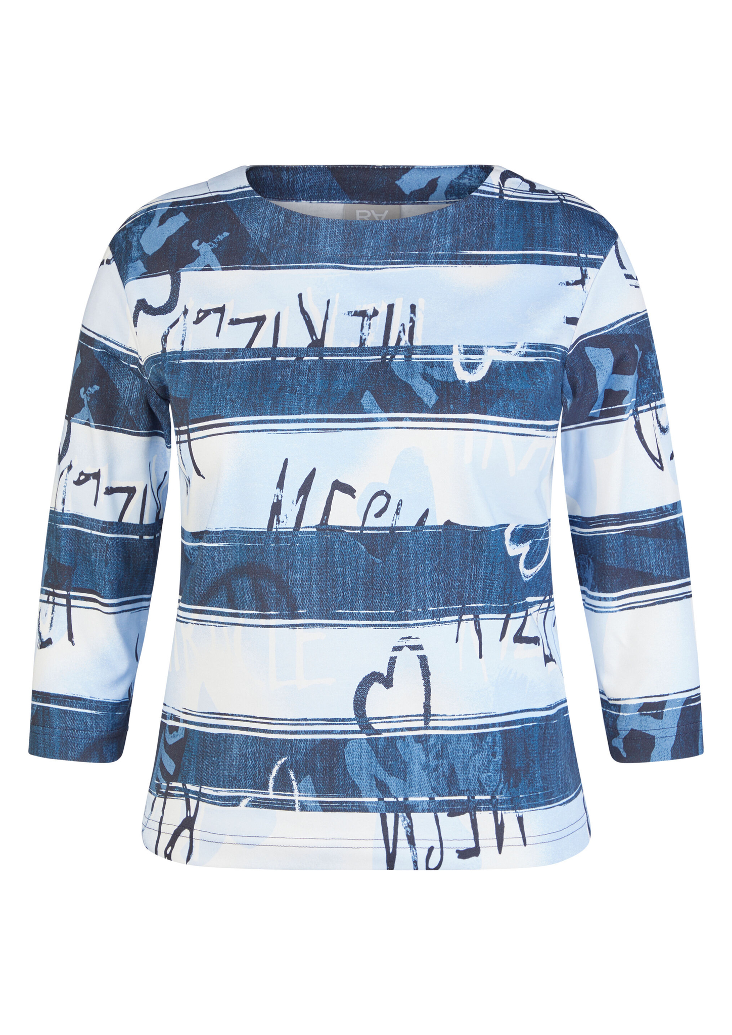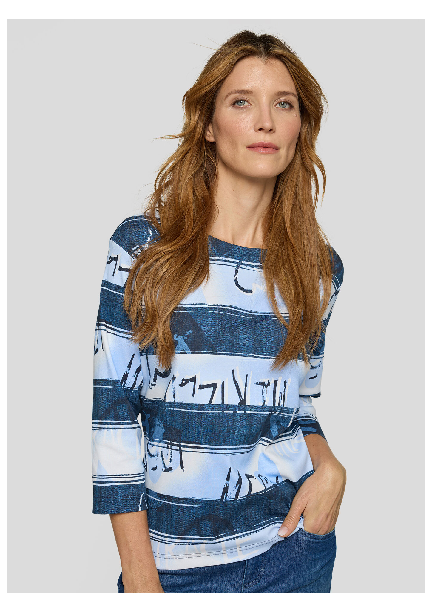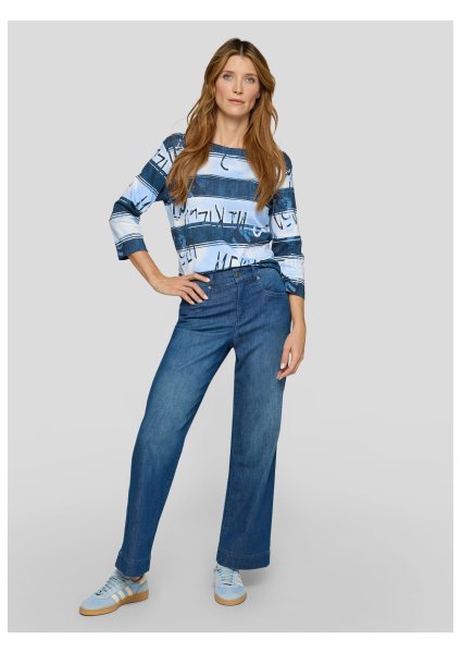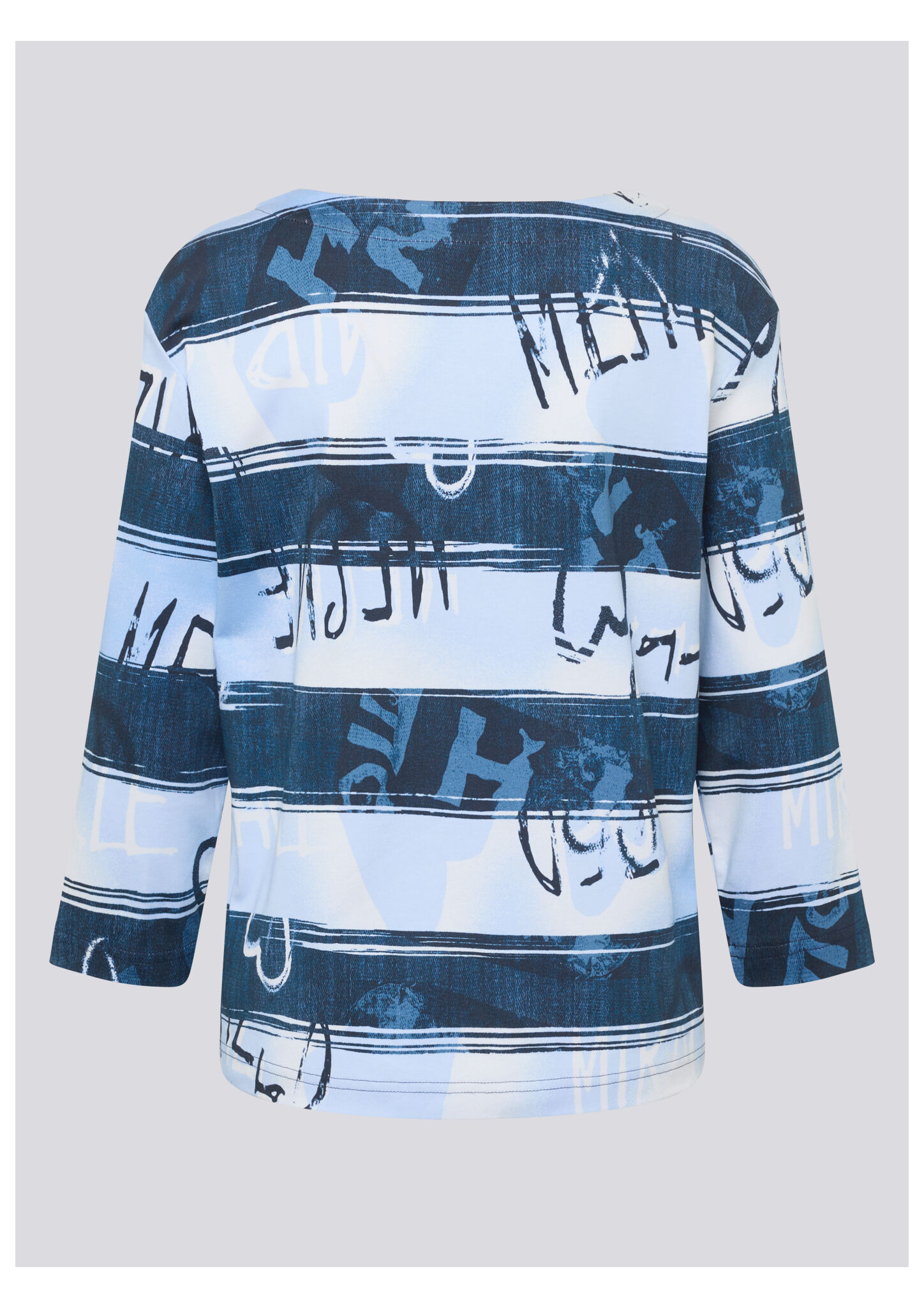 Dieses Shirt überzeugt mit einem modernen Allover-Print in Streifenoptik mit abstraktem Schriftzug. Der hochwertige Baumwolljersey trägt sich angenehm weich auf der Haut und sorgt für ein bequemes Tragegefühl. Der klassische Rundhalsausschnitt und die 3/4-Ärmel unterstreichen den legeren Charakter _ perfekt für entspannte Casual-Looks. Reine Baumwolle in Jersey-Qualität. 3/4-lange Ärmel. Rundhalsausschnitt. Locker geschnitten. Allover-Streifen mit Schriftzug.