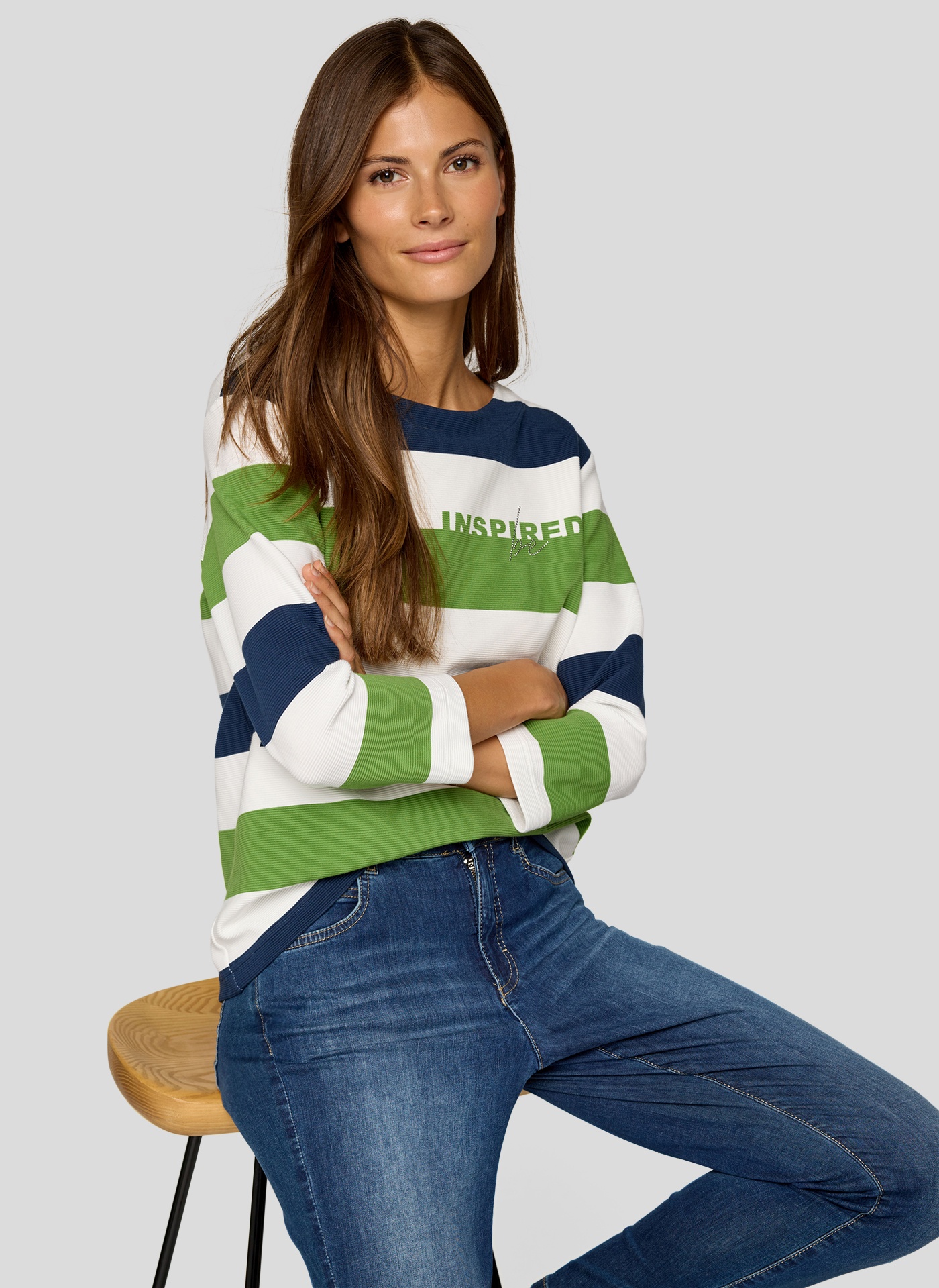 Dieses sportlich-moderne Sweatshirt begeistert mit seinem auffälligen Blockstreifen-Design, ergänzt durch stylische Schriftzüge, und bietet dabei angenehmen Tragekomfort im Alltag.