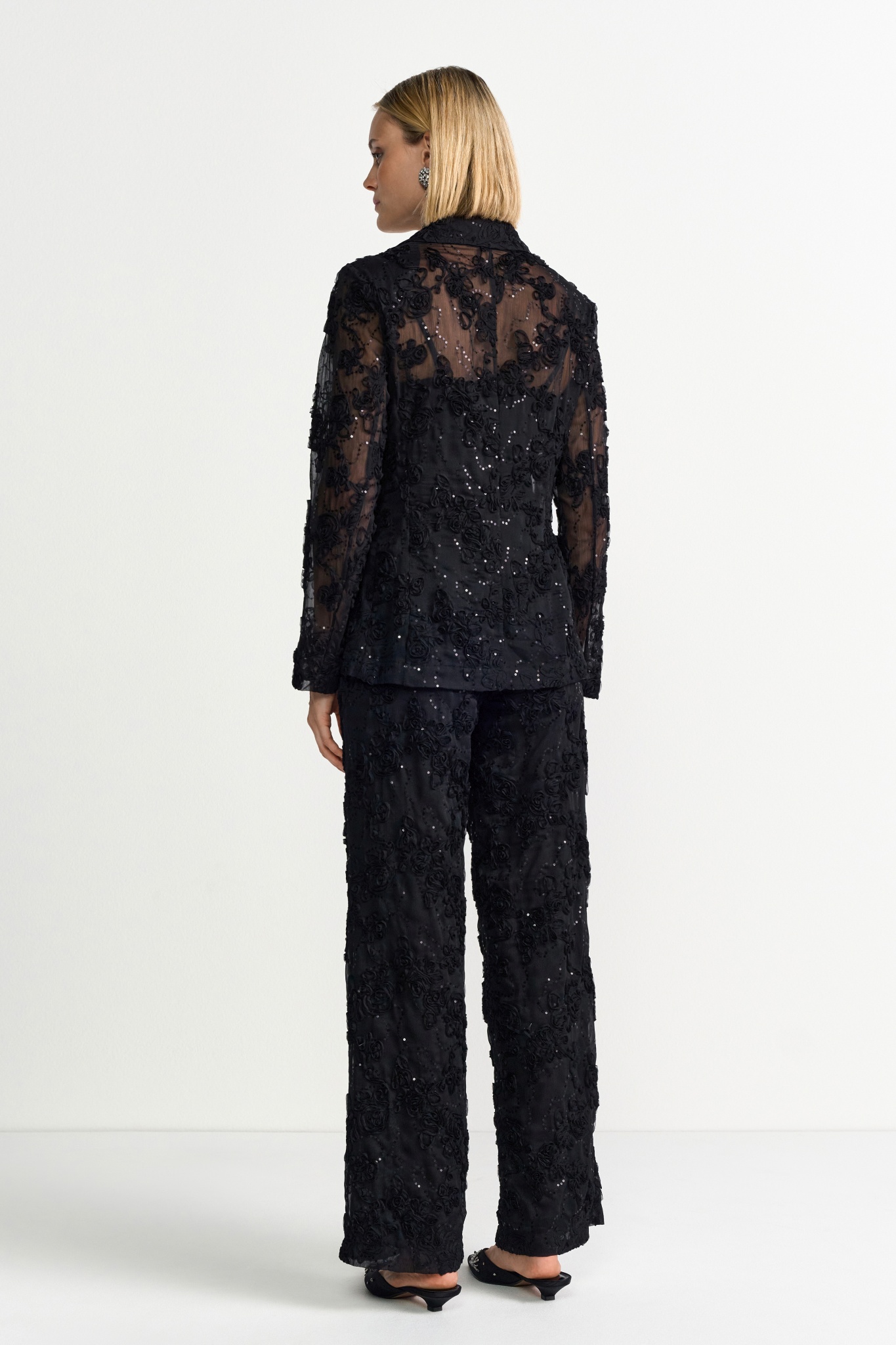Materialzusammensetzung "Rich & Royal Dieser schwarze Blazer kombiniert klassisches Tailoring mit floralen 3D-Applikationen und feinen Pailletten."