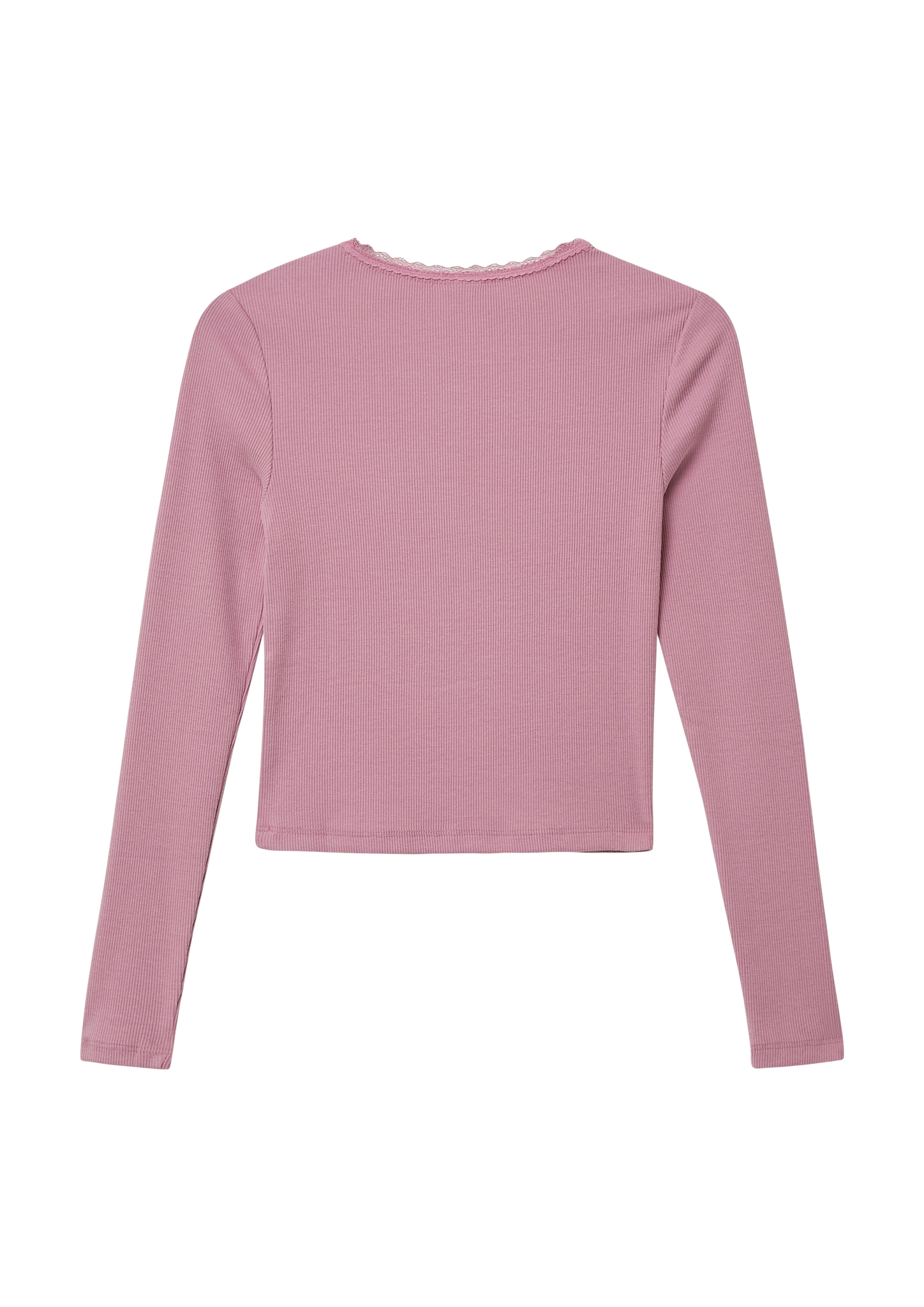 Dieses langärmlige Slim Fit-Shirt aus elastischer Rippware begeistert mit elegantem Spitzendetail. Der angeraute Baumwollmix sorgt für Wärme und Komfort. Der paspelierte Rundhalsausschnitt und die verkürzte Länge verleihen dem Top einen modischen Touch – perfekt für Schule und Freizeit.