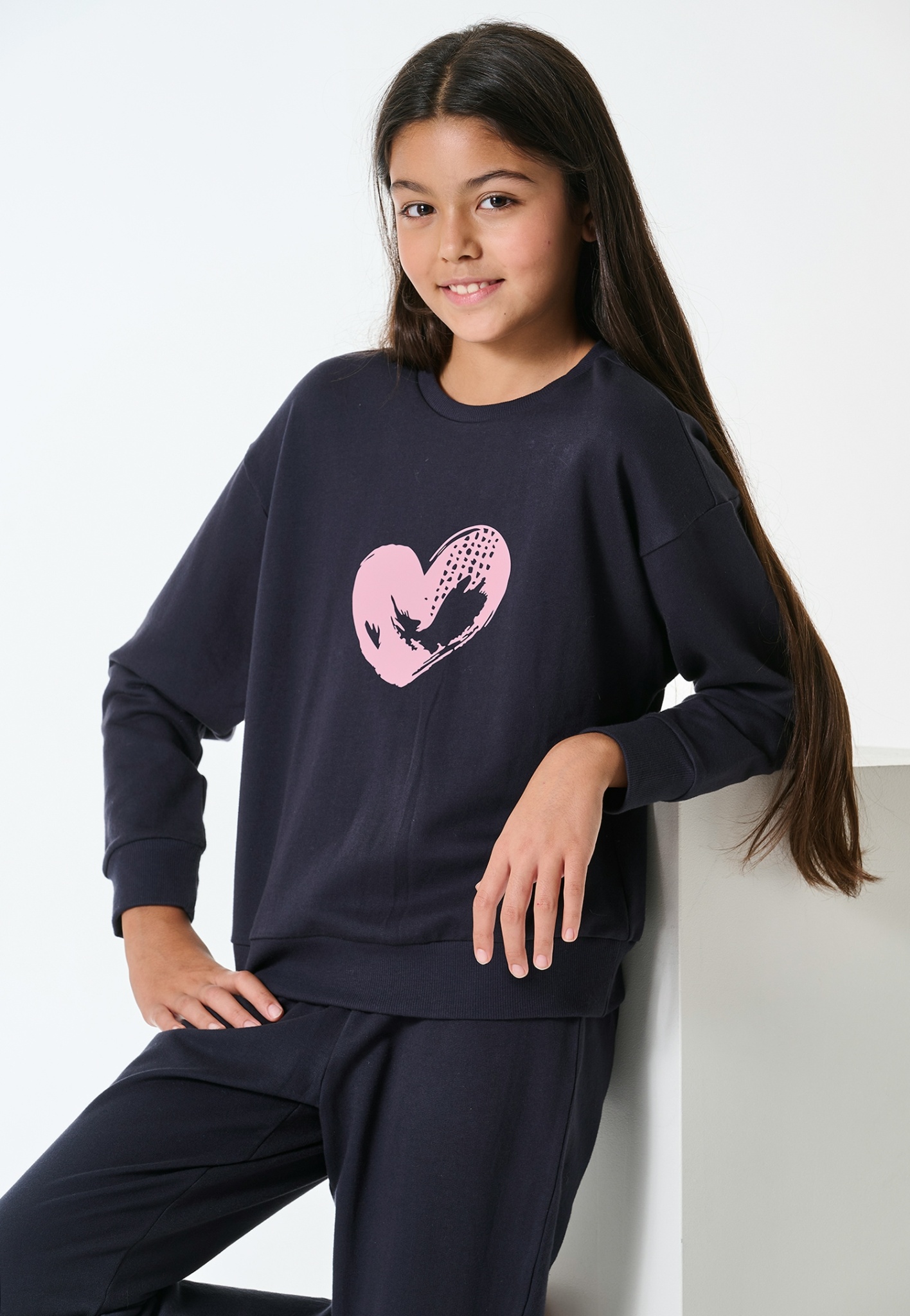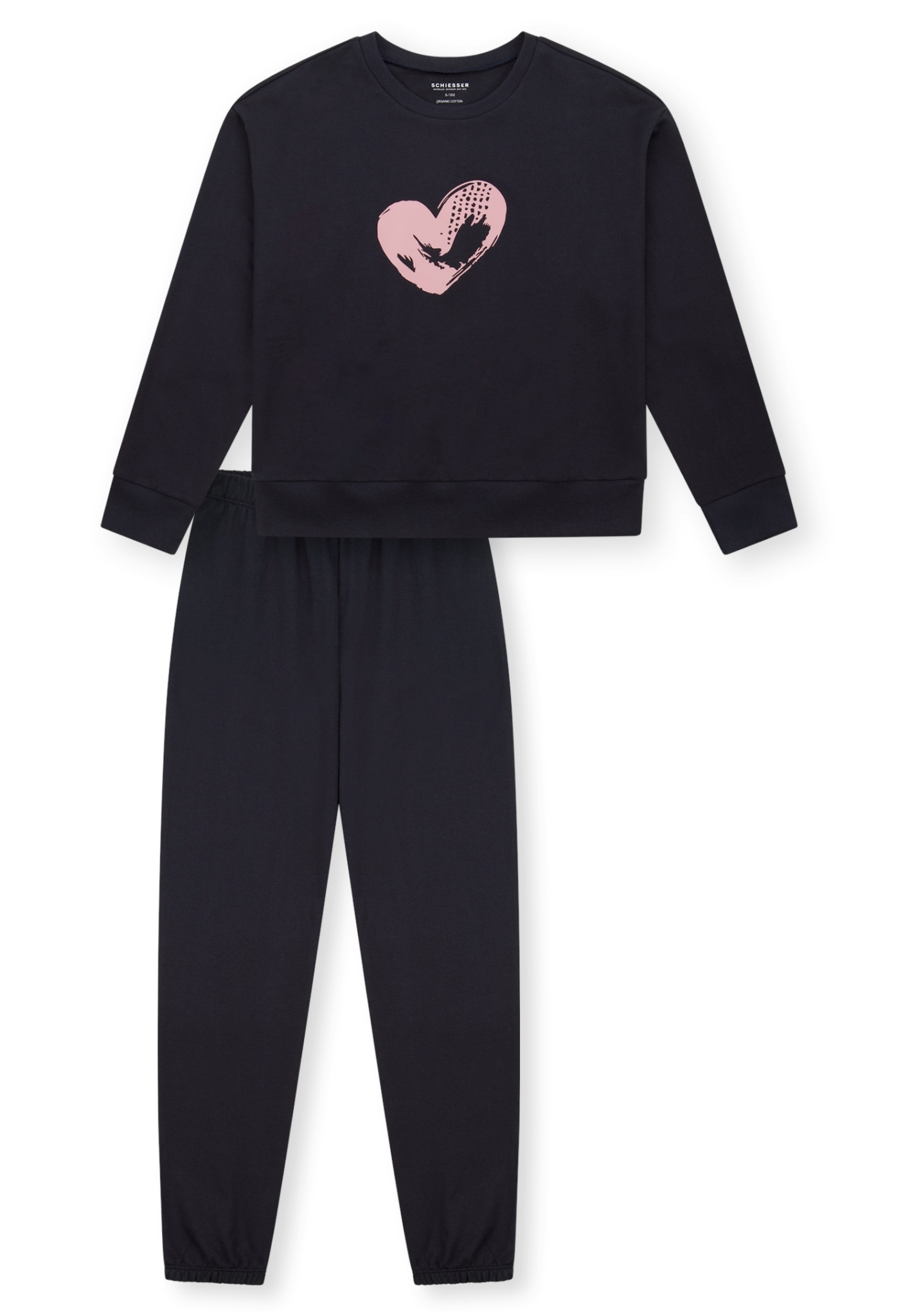 - langer, navy-blauer Mädchenschlafanzug mit rosa-farbenem Herzmotiv auf der Brust