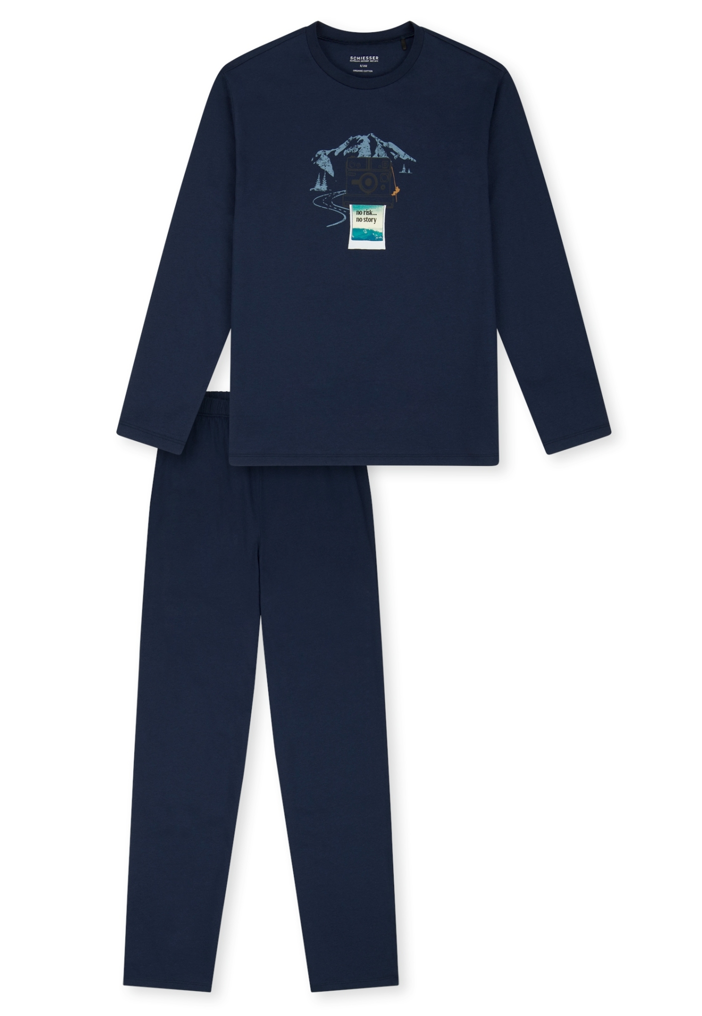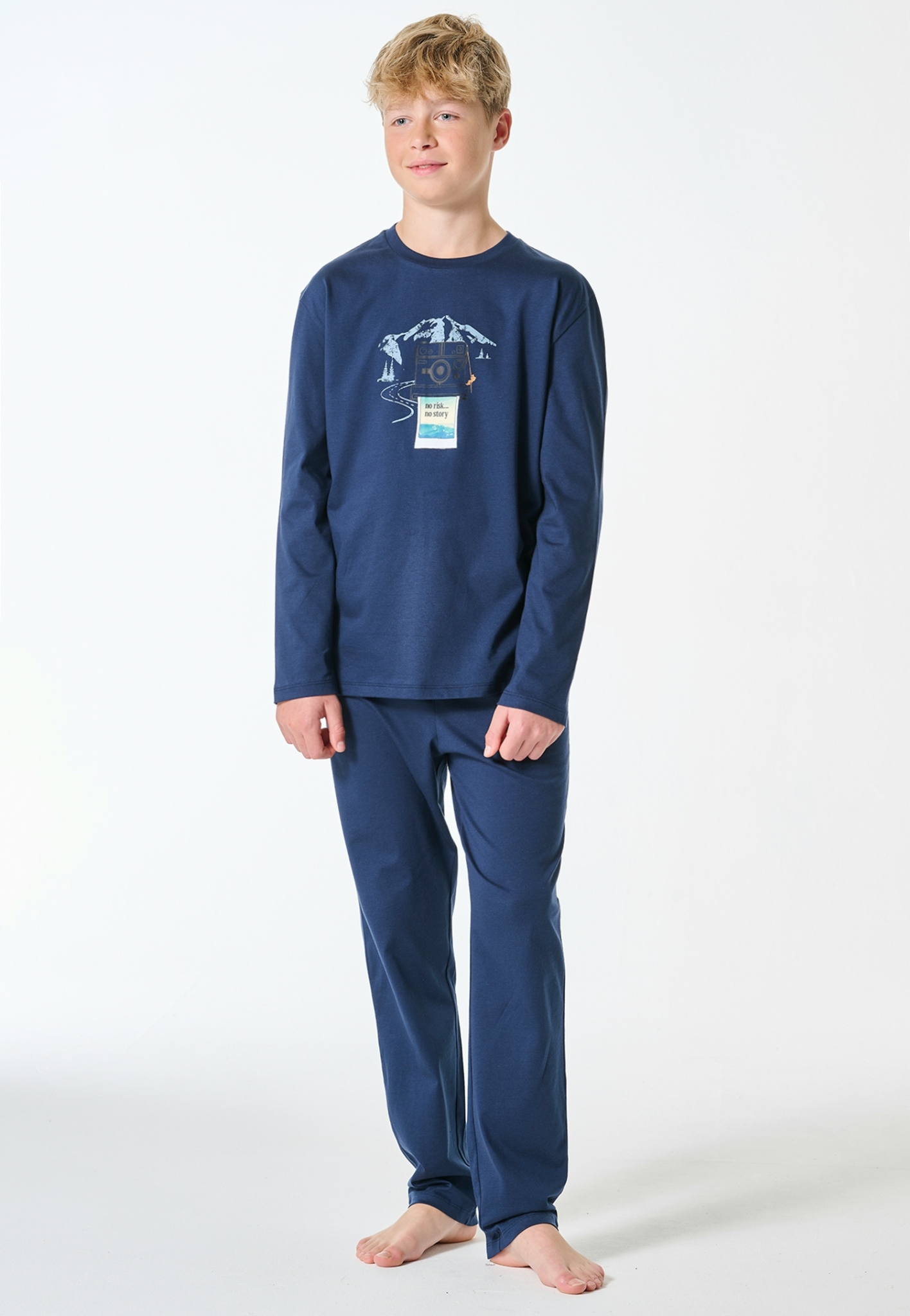 - langer, dunkelblauer Jungenschlafanzug mit Foto-Berg-Motiv und Schriftzug