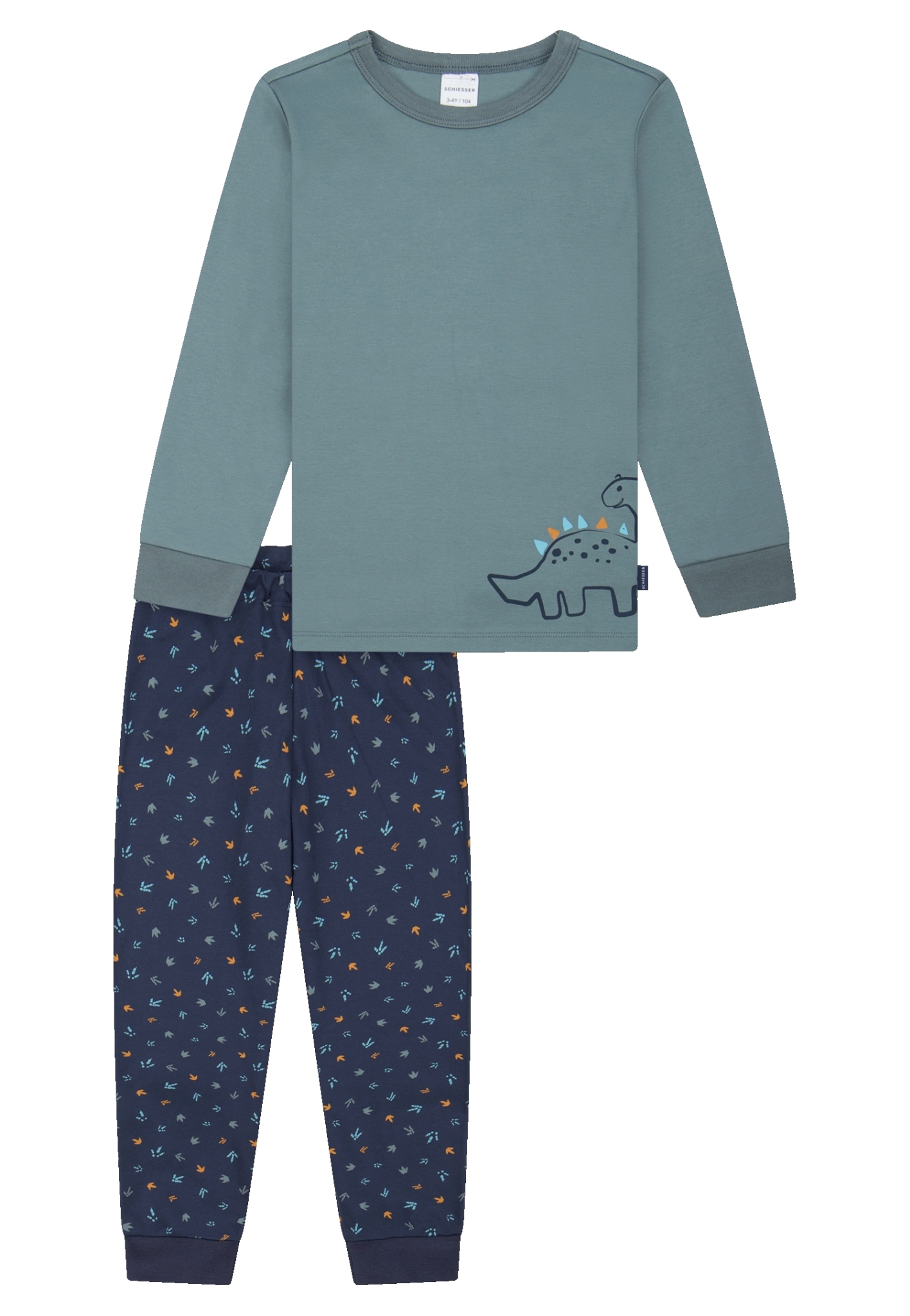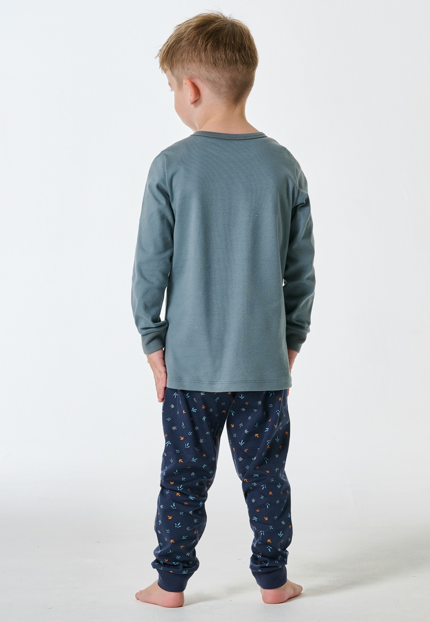 - langer Jungenschlafanzug mit mineral-grünem Shirt und Dino-Motiv, Hose in Dunkelblau mit Dino-Muster