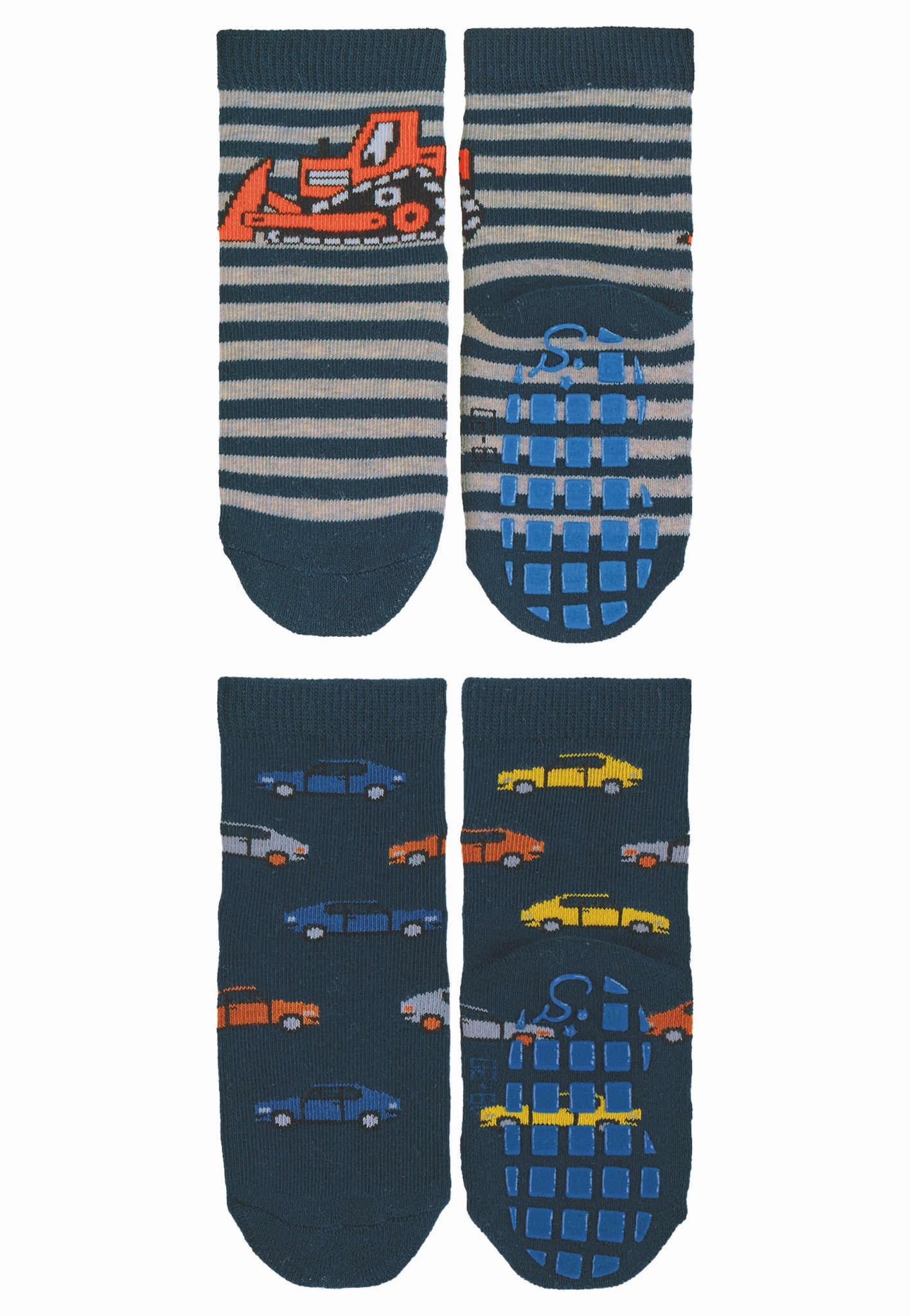 ABS-Söckchen im Doppelpack, bestehend aus ABS-Söckchen mit Motiv Bagger und Autos, mit Vollplüsch im Sohlenbereich.