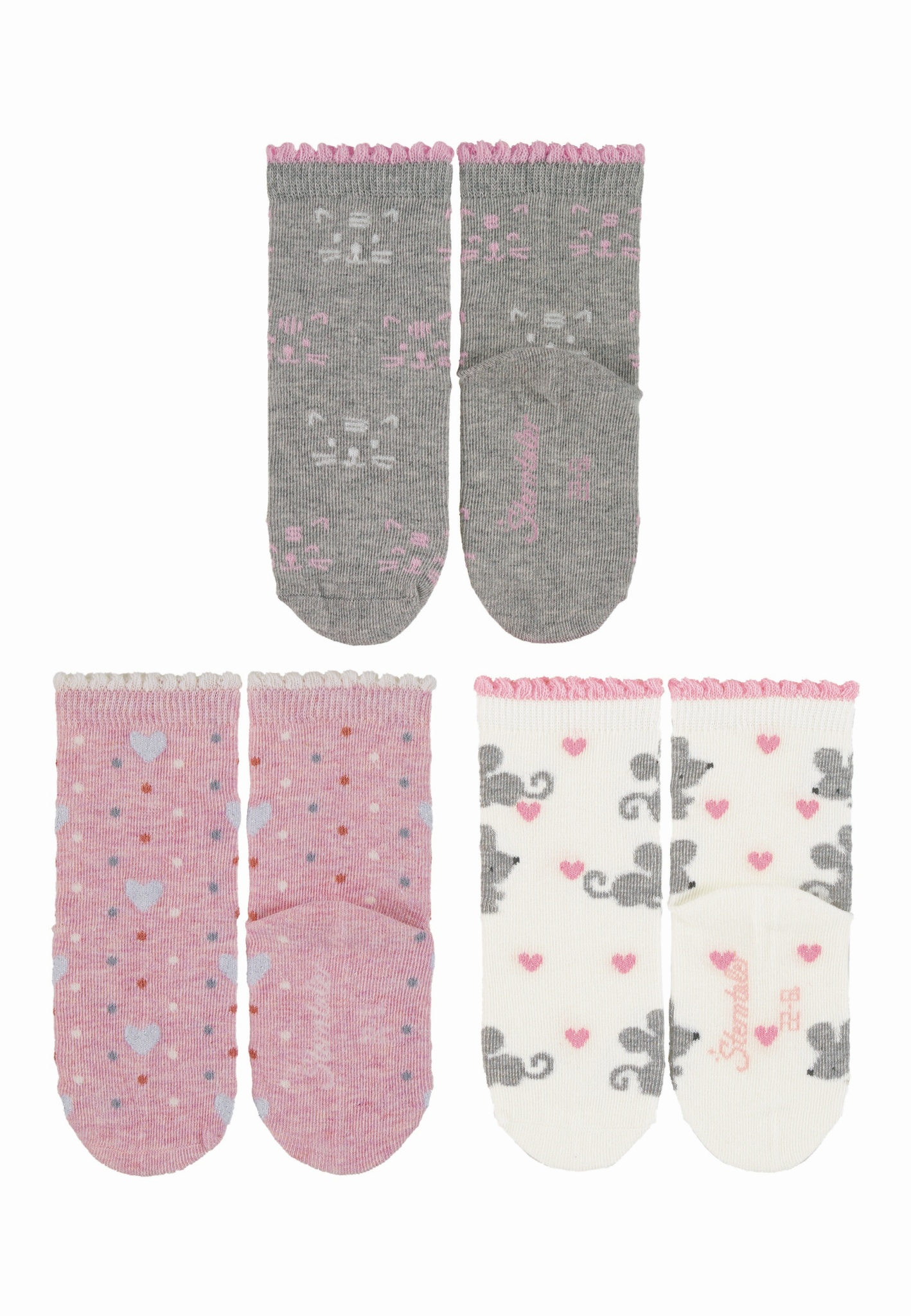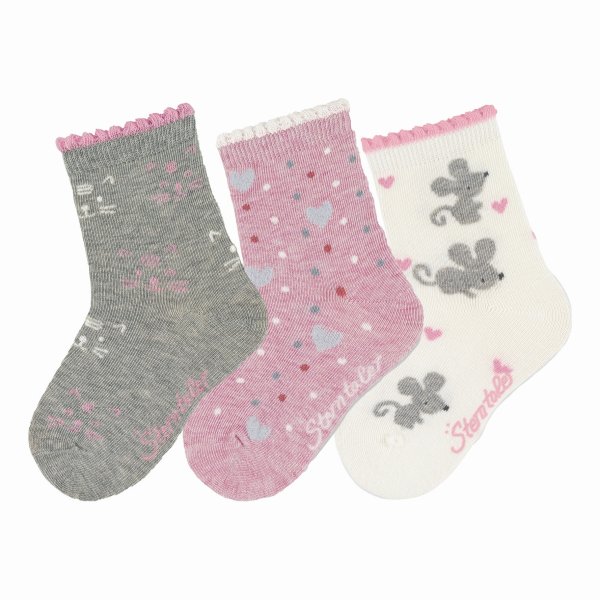 Söckchen im 3er-Pack mit Motiven Katzengesicht, Punkte/Herzen und Mäuse.