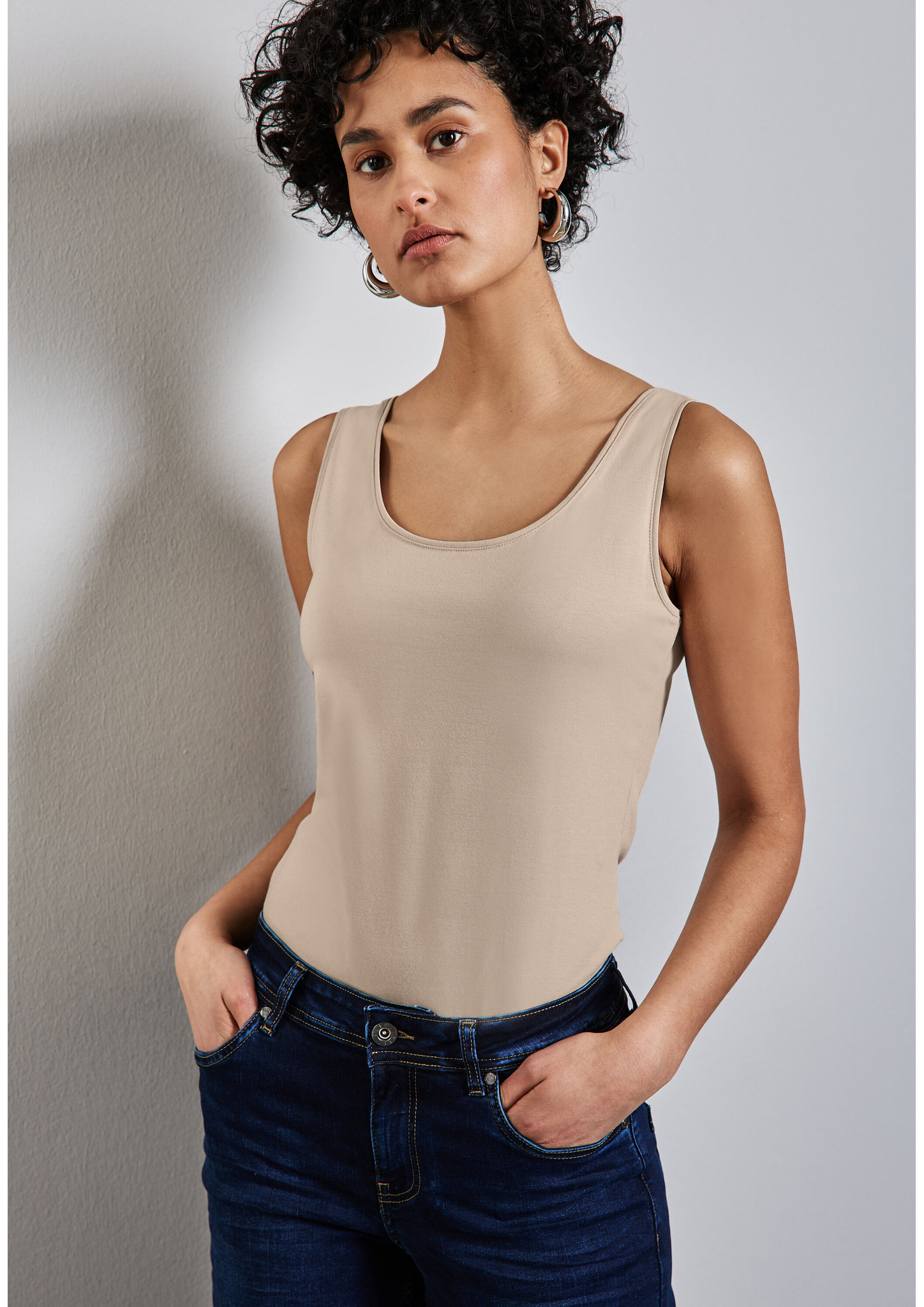 Das Basic Top im Style Anni von Street One für Damen ist ein zeitloser Klassiker mit Rundhalsausschnitt und in Unifarbe. Der Materialmix mit Stretchanteil garantiert dir angenehme Bewegungsfreiheit – ideal als Basic für deinen Kleiderschrank. Damentop Rundhalsausschnitt Ärmellos Unifarbe Materialmix mit Stretchanteil Material: 48% Baumwolle, 48% Modal, 4% Elasthan