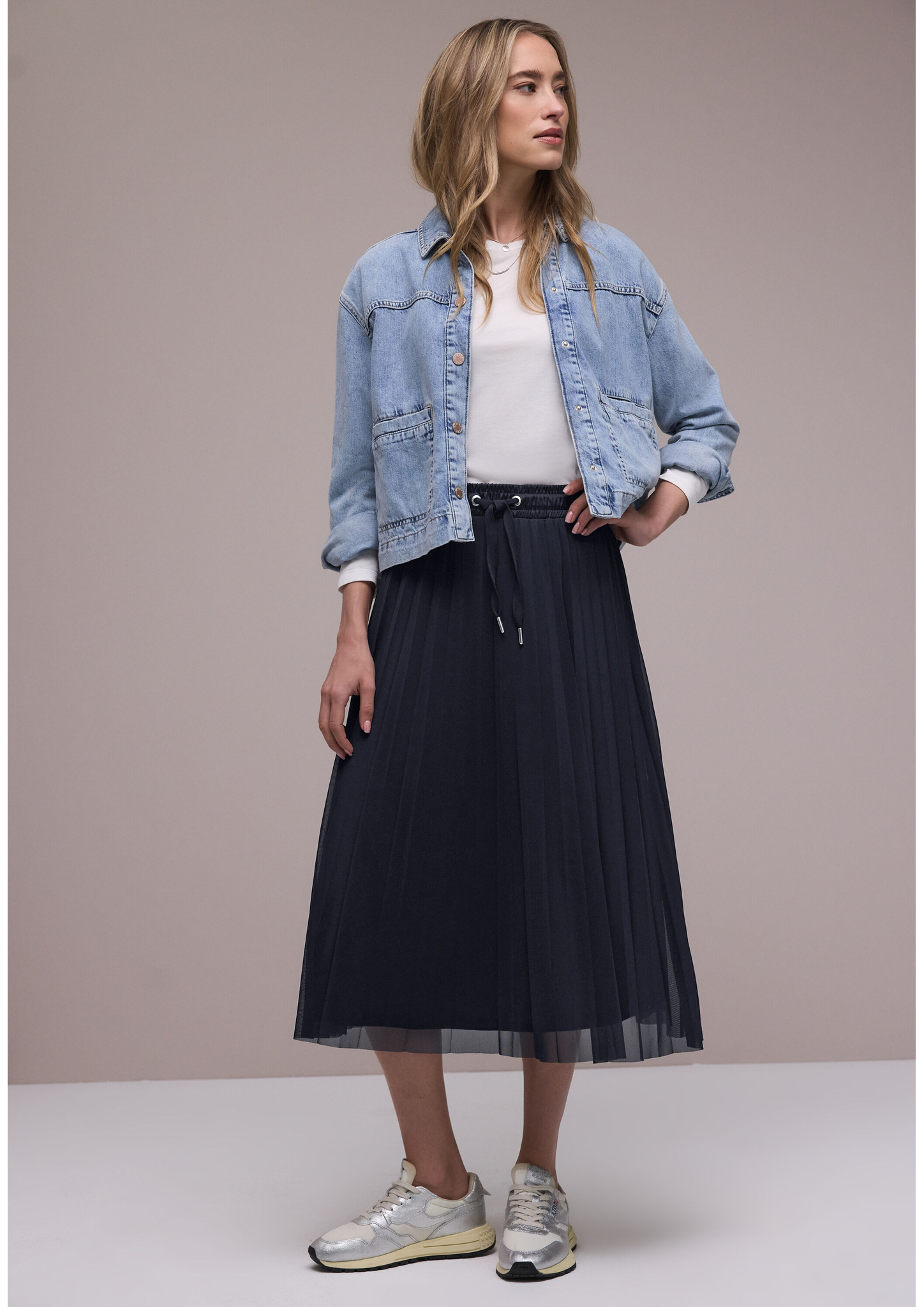 Der Plissée Jogg Skirt von Street One für Damen kombiniert sportliches Flair mit einem weich fallenden Meshplissée. Die Mid-Waist-Passform und der elastische Bund mit Tunnelzug sorgen für angenehmen Komfort. Das unifarbene Design macht den Rock vielseitig kombinierbar. Ein modernes Piece in Midi-Länge, das bequem und stilvoll zugleich ist. Mesh Rock Casual Midi-Länge Mid Waist Sportive Details Material: 95% Polyester, 5% Elasthan
