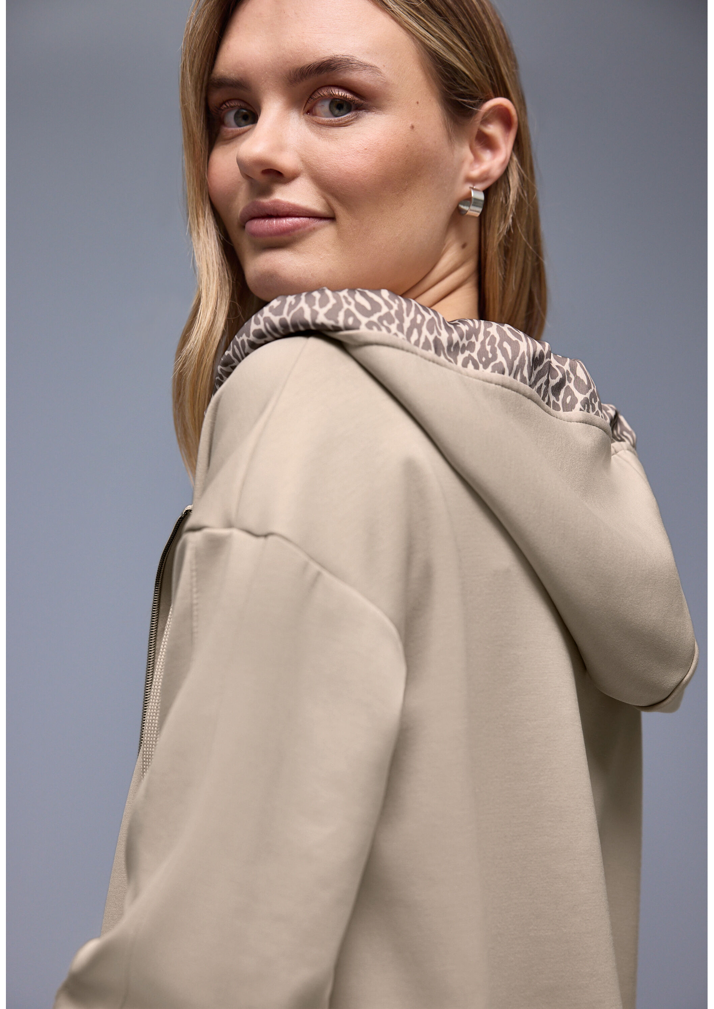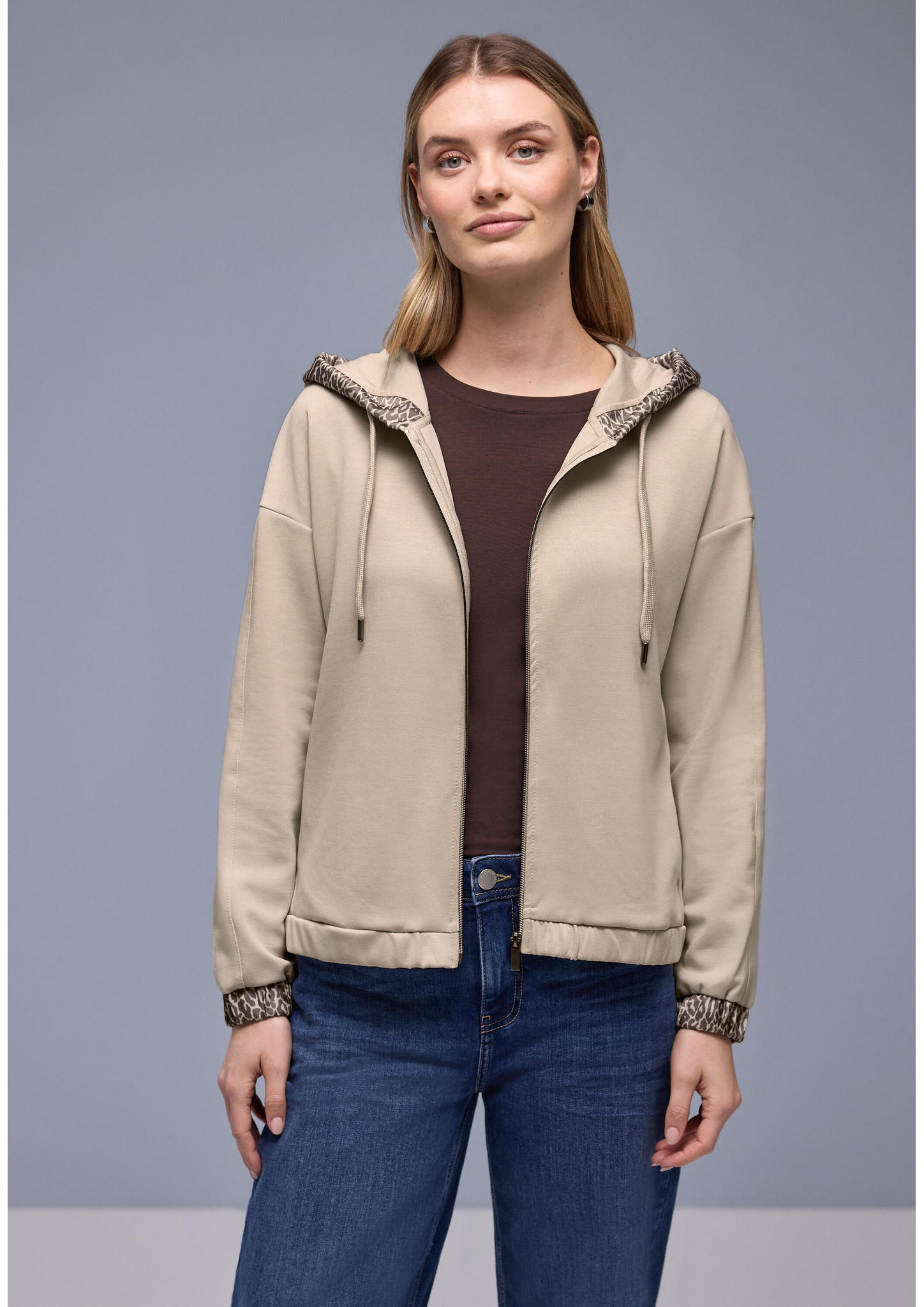 Diese Hoodie-Jacke von Street One für Damen kombiniert sportiven Style mit femininer Eleganz. Der seidige Glanz und die Leo-Akzente an Kapuze und Bündchen verleihen ihr einen besonderen Look. Seitliche Taschen, elastischer Bund und ein stretchiger Modalmix machen sie zu deinem neuen Lieblingsstück für lässige Alltagsmomente. Silk-Look Jacke Casual Kapuze Langarm Seidiger Glanz Material: 46% Modal, 46% Polyester, 8% Elasthan