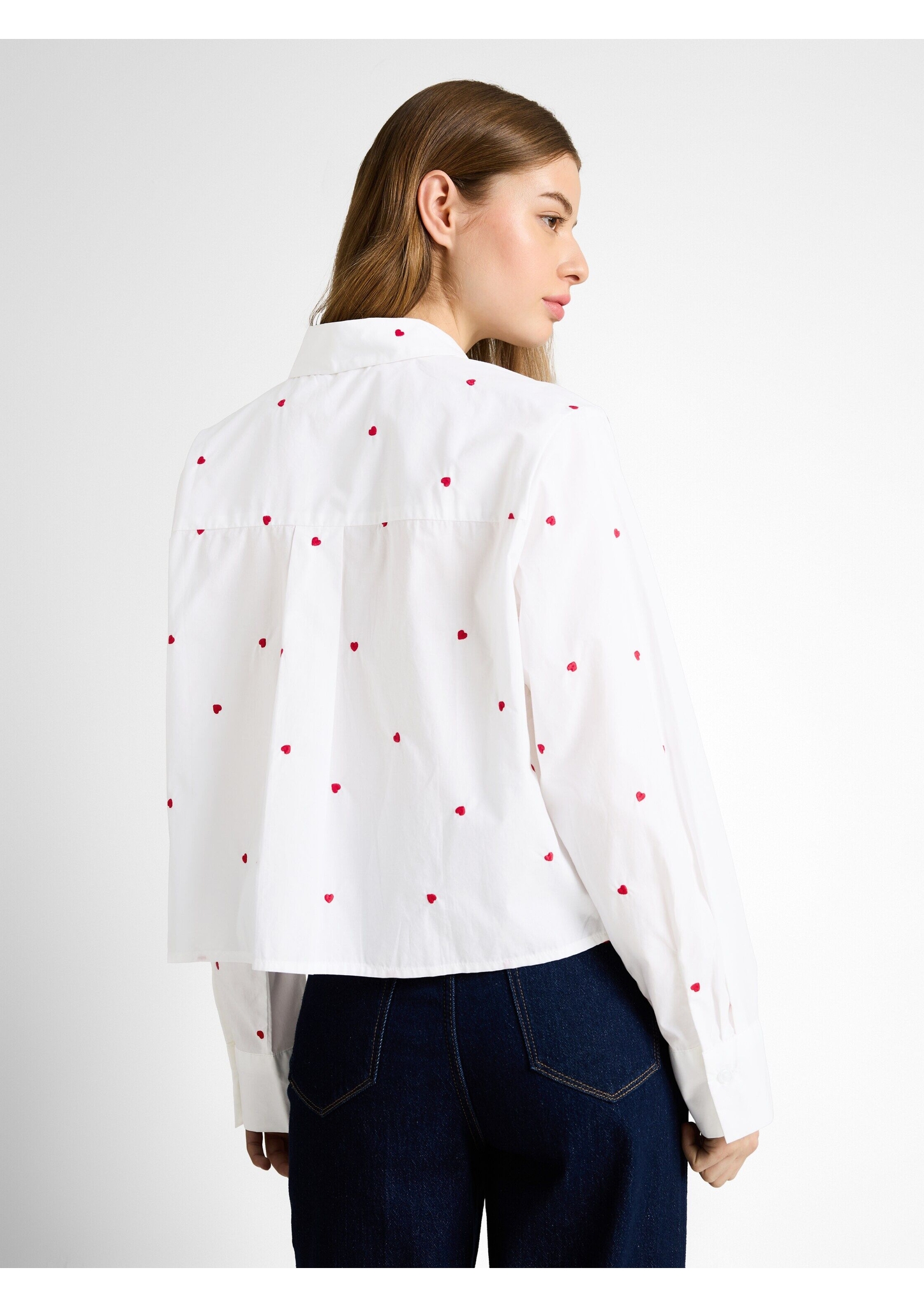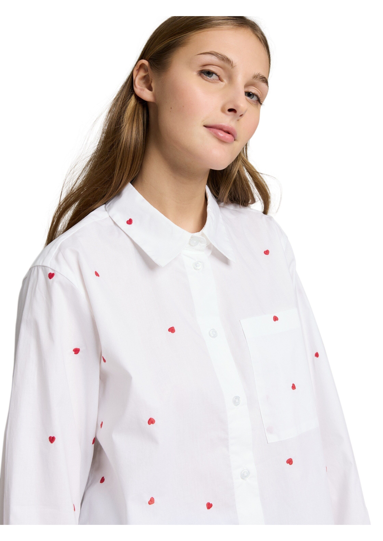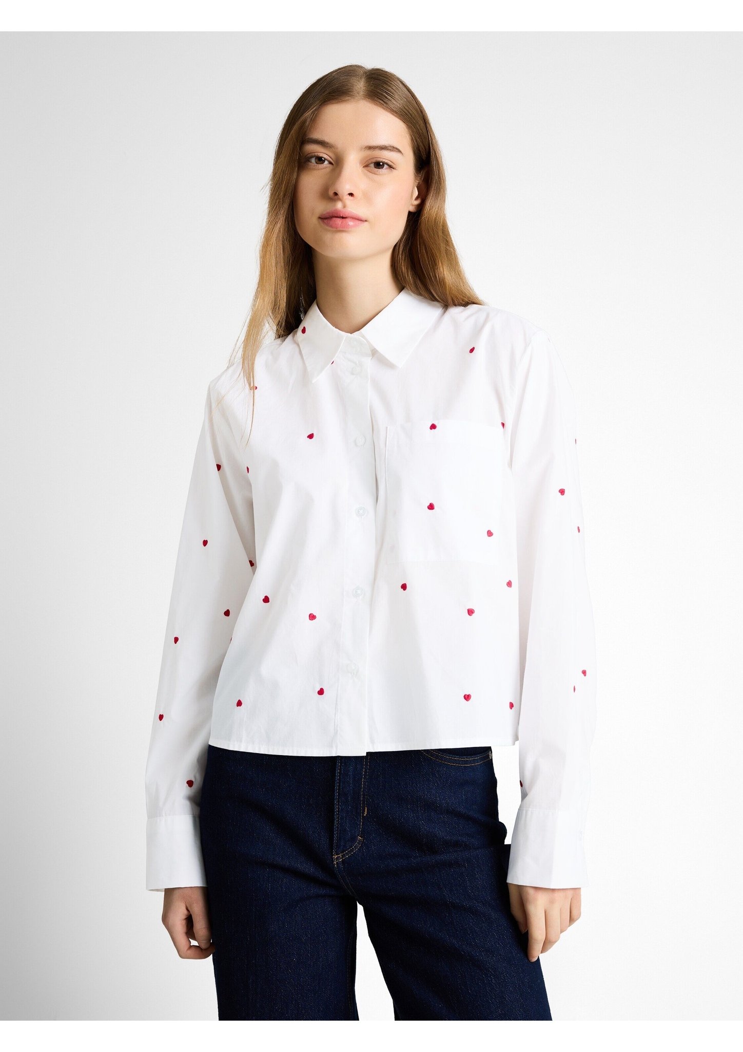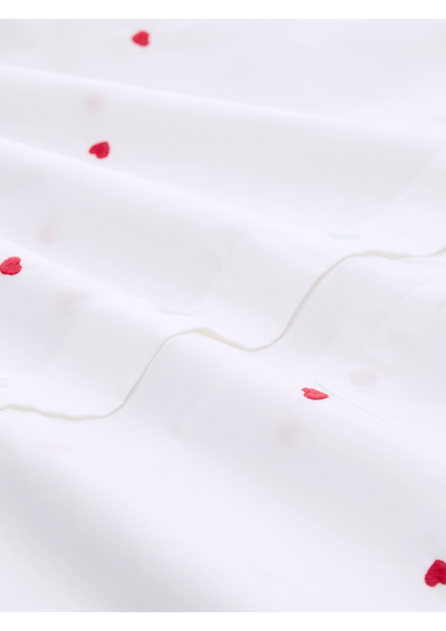 Hemdbluse mit Allover-Herz-Stickerei und aufgesetzter Brusttasche. Mit überschnittener Schulternaht für eine lockere Passform. Aus einem gewebten Popeline-Baumwollstoff.