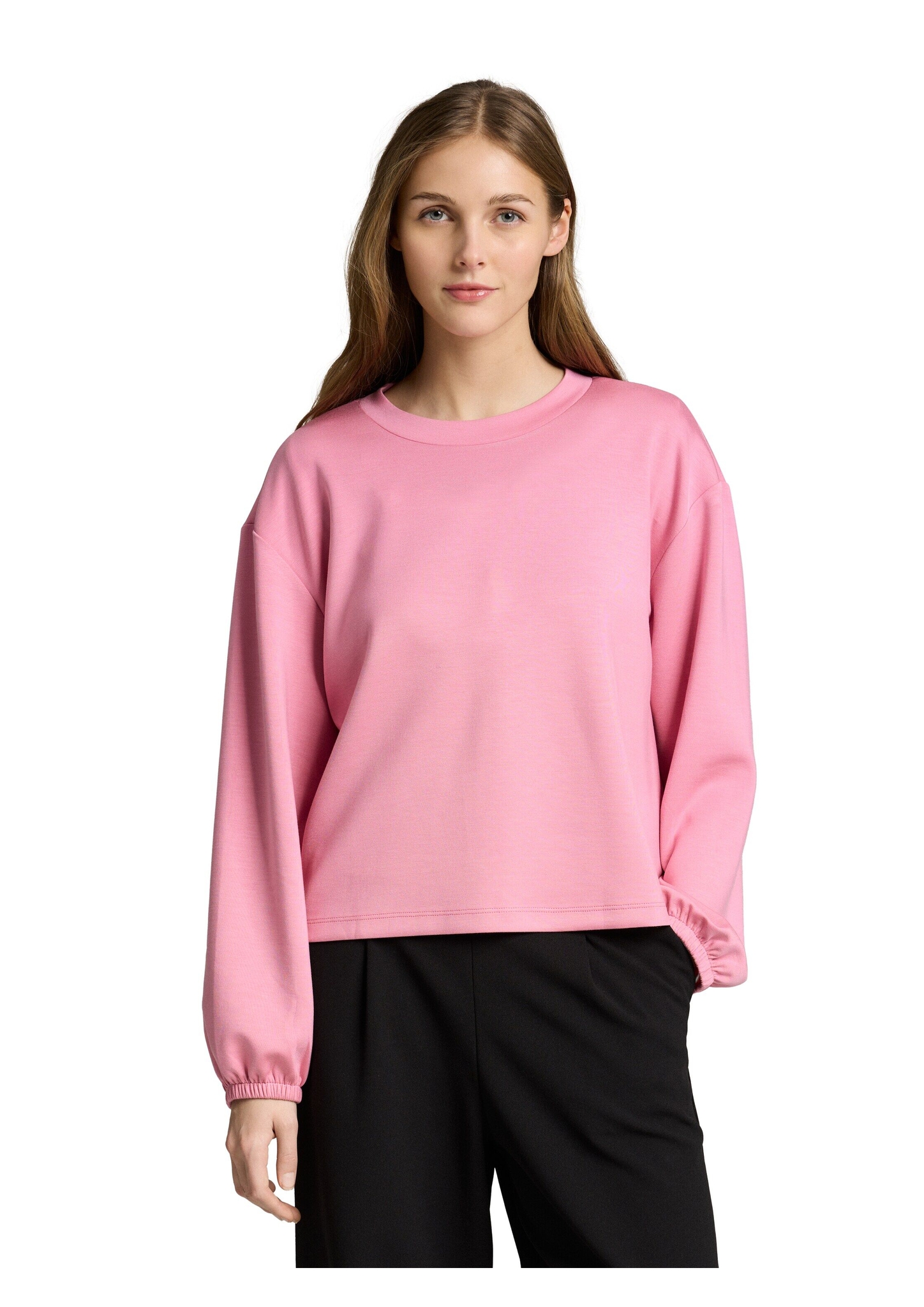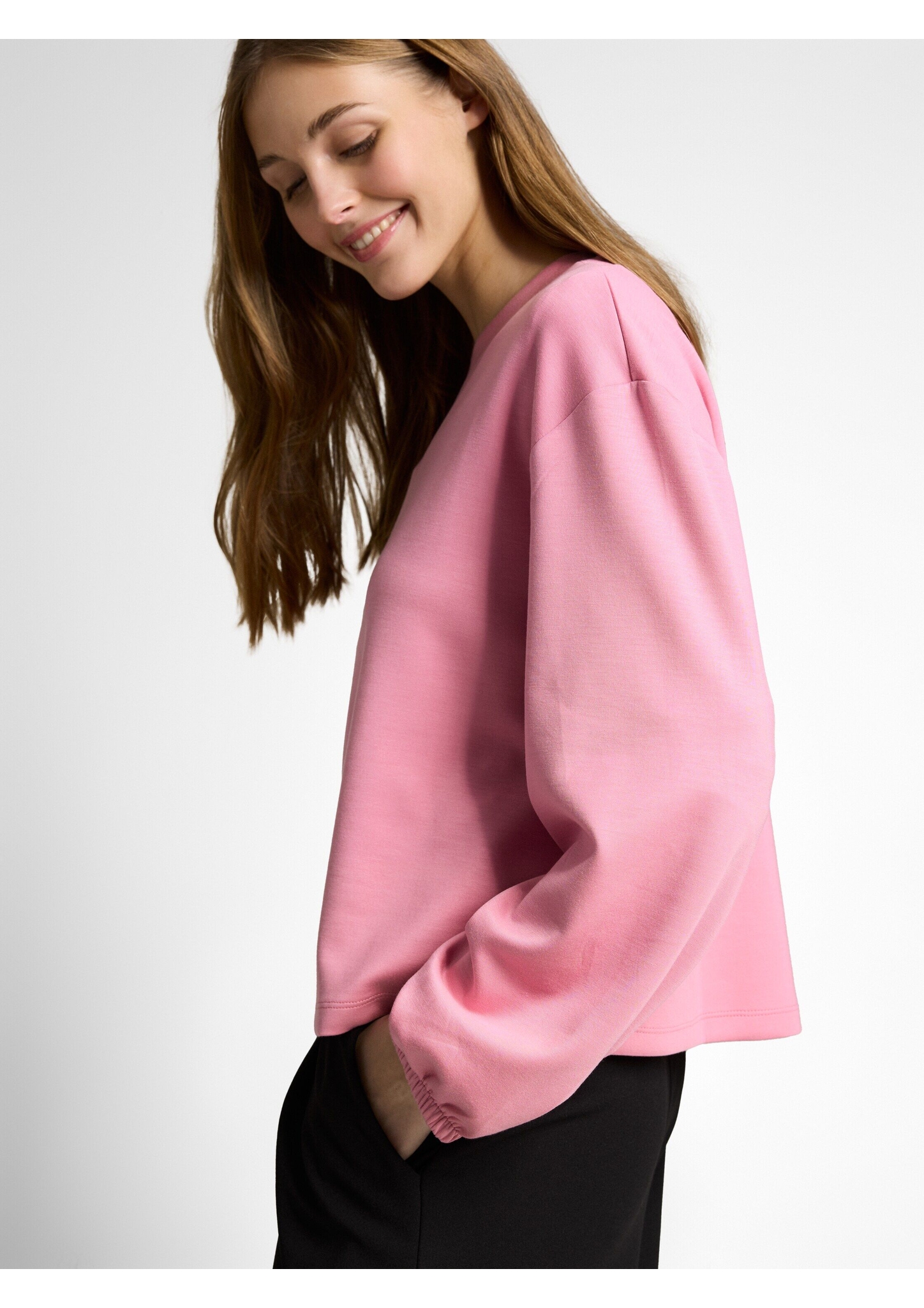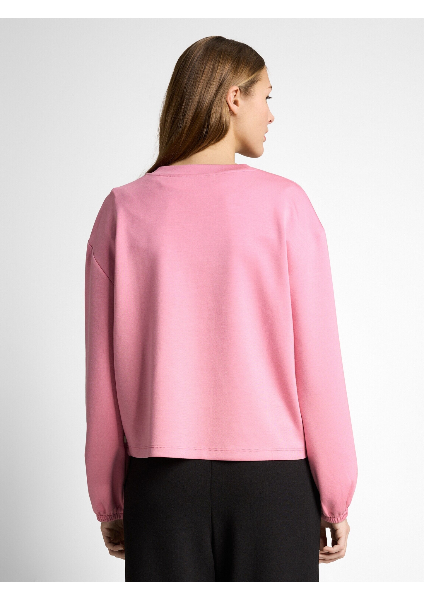 Longsleeve mit elastischem Gummibund am Ärmelsaum und überschnittener Schulternaht für eine lockere Passform. Aus einem weichen, knitterarmen und elastischen Scuba-Stoff.
