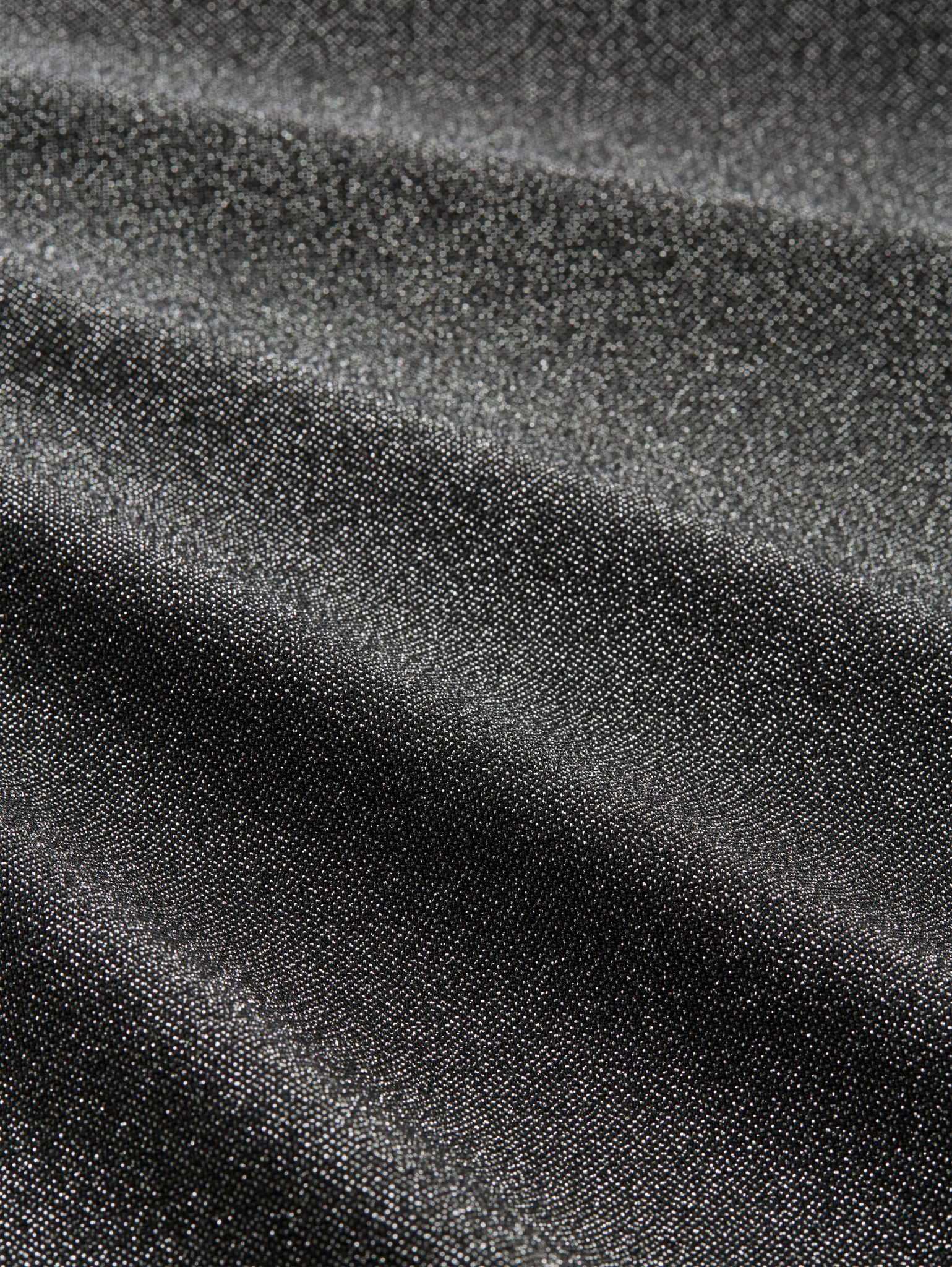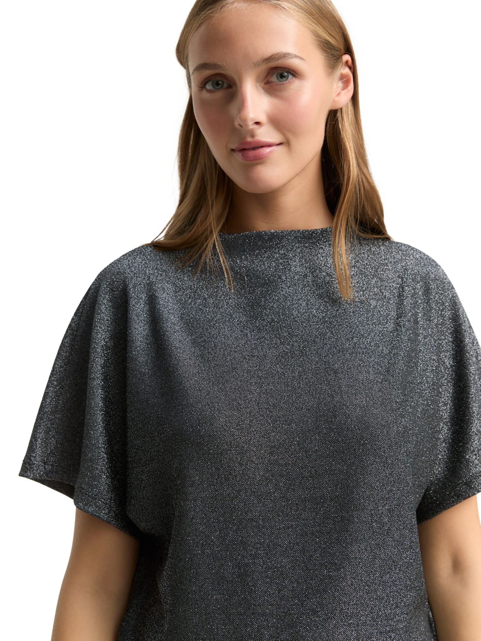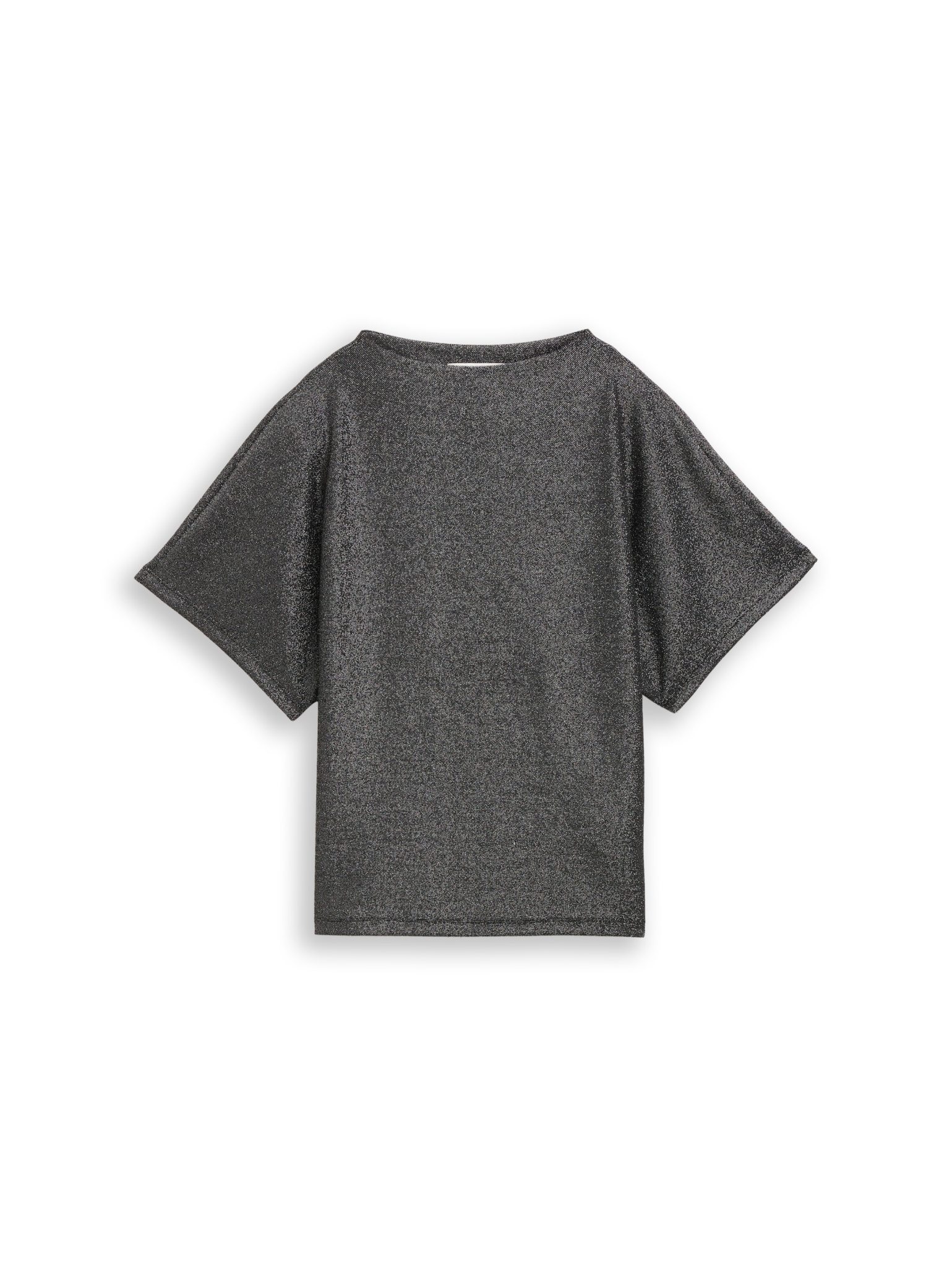 T-Shirt mit kurzem Stehkragen und Fledermausärmeln. Aus einem glitzernden Stoff in Metall-Optik.