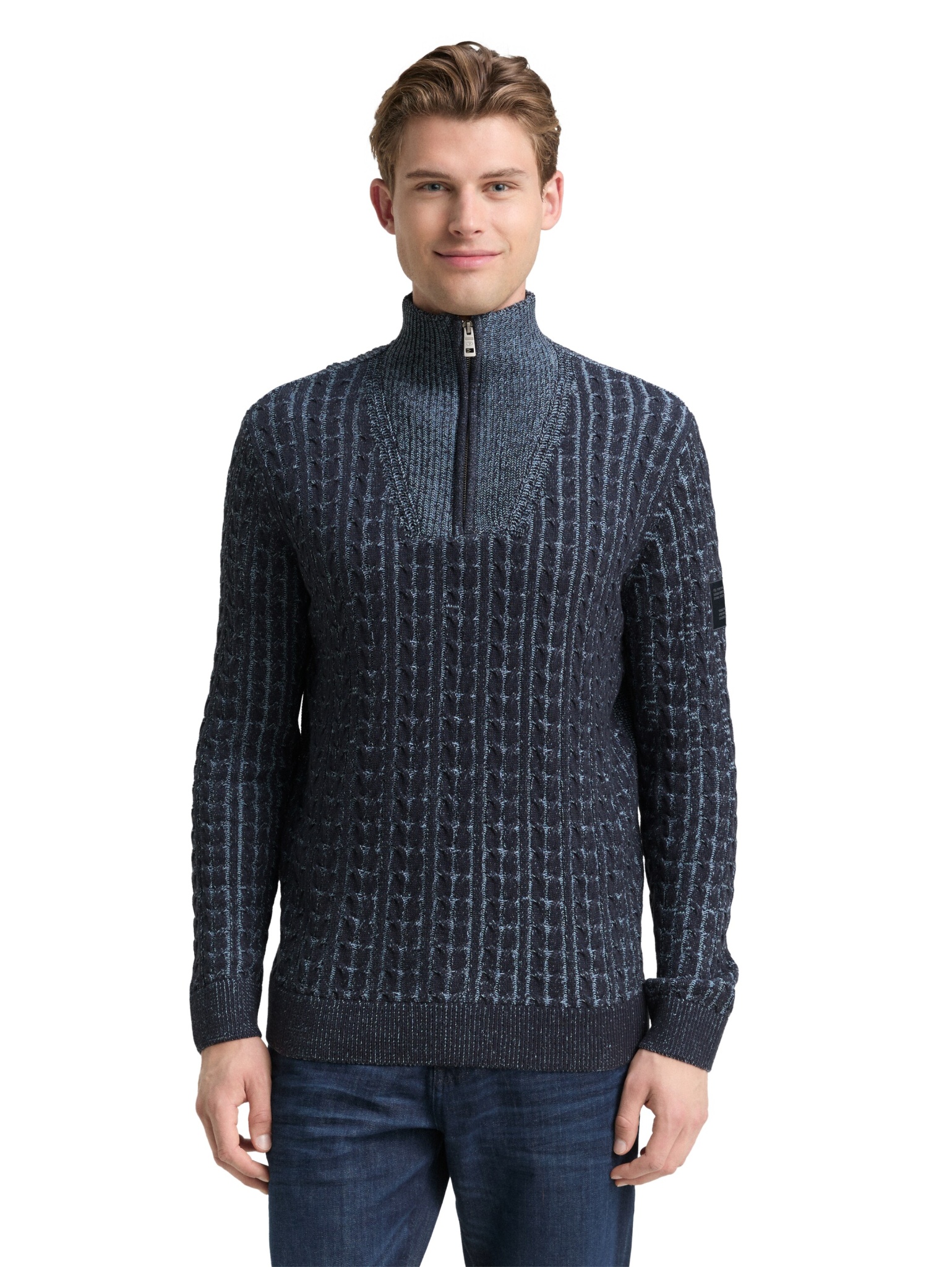 Pullover mit Troyer-Kragen und halbem Reißverschluss. Mit Zopfmuster vorne und an den Ärmeln, sowie Logo-Badge am oberen Ärmel.