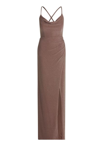 * Passform: Figurbetont * Gesamtlänge: 154 cm * Länge ab Taille: 112 cm * Ärmellänge: Ohne Arm * Ausschnittform: Wasserfall-Ausschnitt * Längeninfo: Maxi * Materialart: Jersey * Trägerart: Spaghettiträger * Verschluss: Reißverschluss * Muster: Uni * Futter: 100% Polyester * Besatz: 100% Polyamid