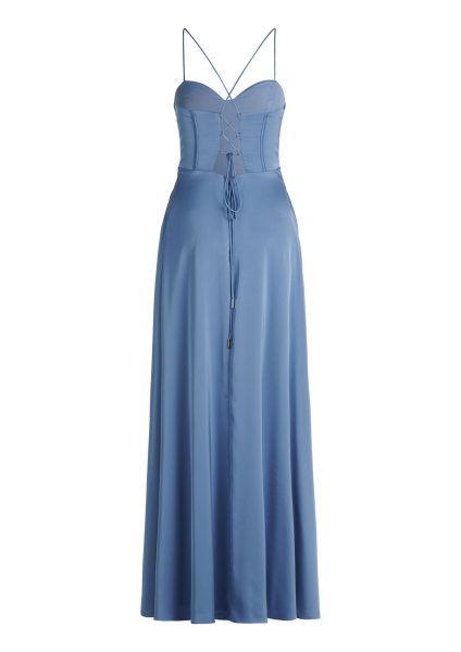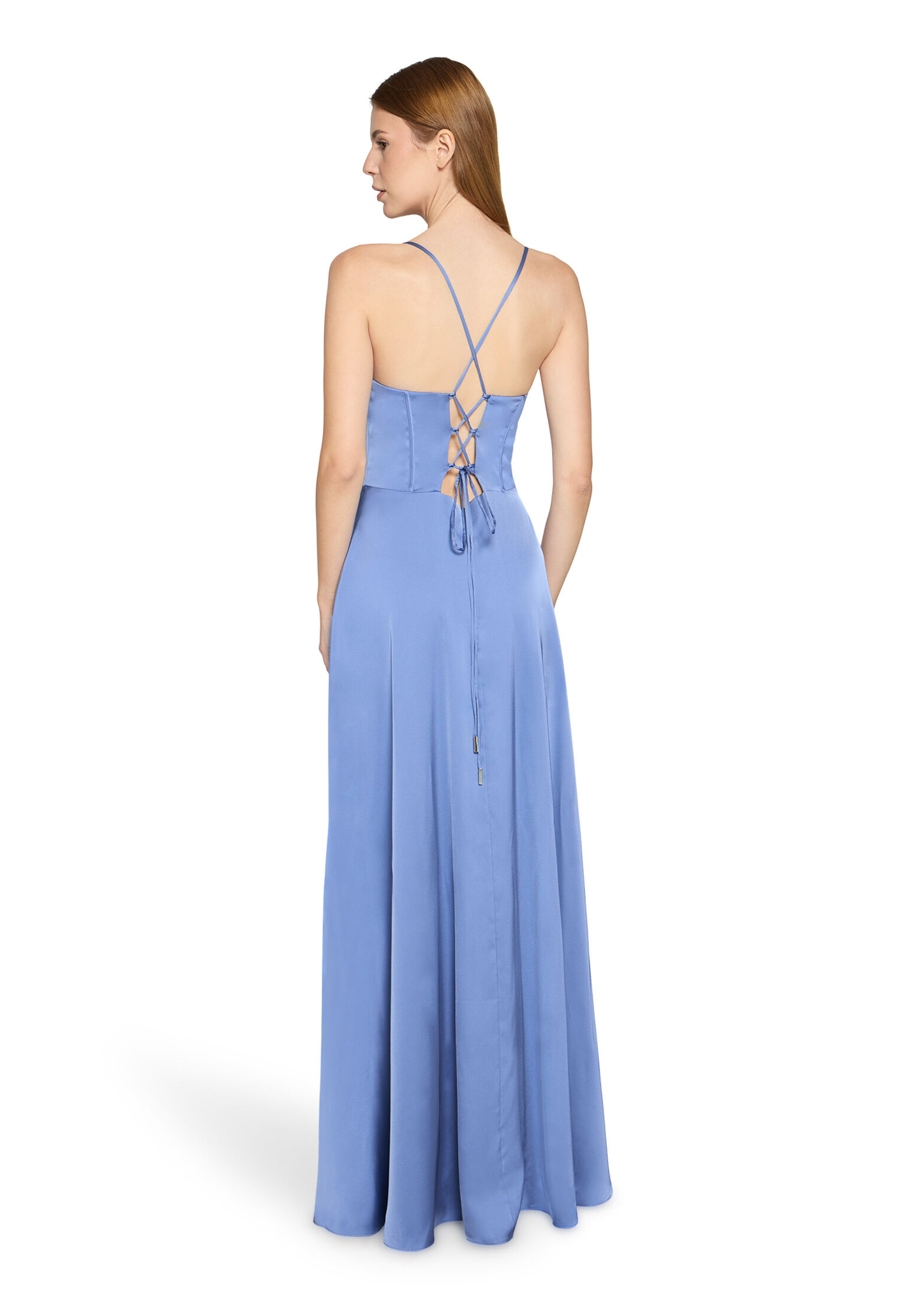 * Passform: Ausgestellt * Gesamtlänge: 157 cm * Länge ab Taille: 115 cm * Ärmellänge: Ohne Arm * Ausschnittform: Wasserfall-Ausschnitt * Längeninfo: Maxi * Materialart: Satin * Tasche: Nahttaschen * Trägerart: Spaghettiträger * Verschluss: Schnürung * Muster: Uni * Futter: 100% Polyester * Besatz: 100% Polyester